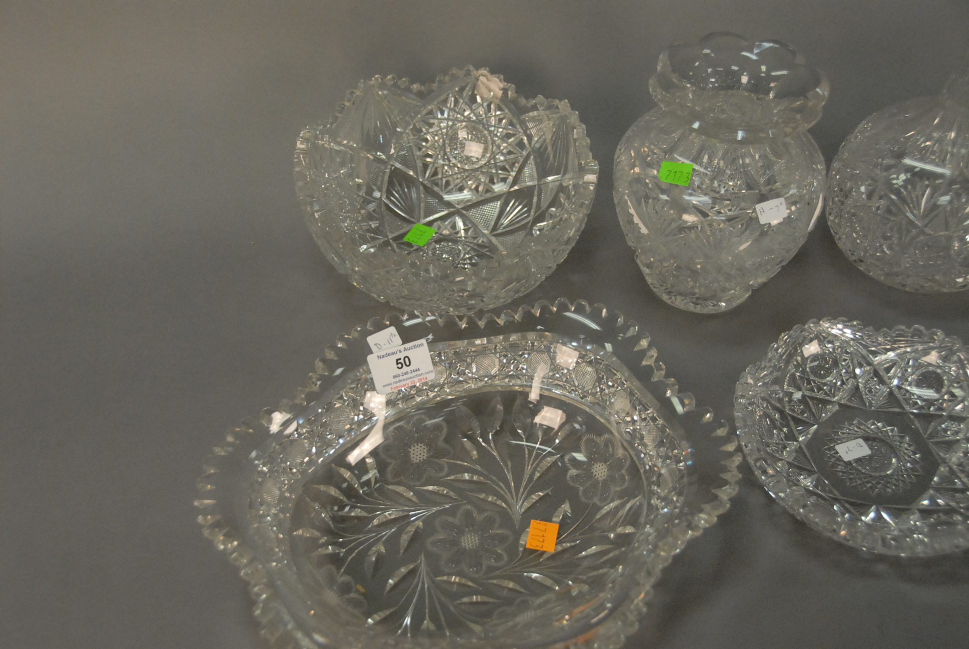 Lot 50: Seven pieces of cut glass to include a Hawk’s vase, J. Hoare Corning 1853 dish, five bowls, and a bud vase, hts. 1 1/2 to 10.