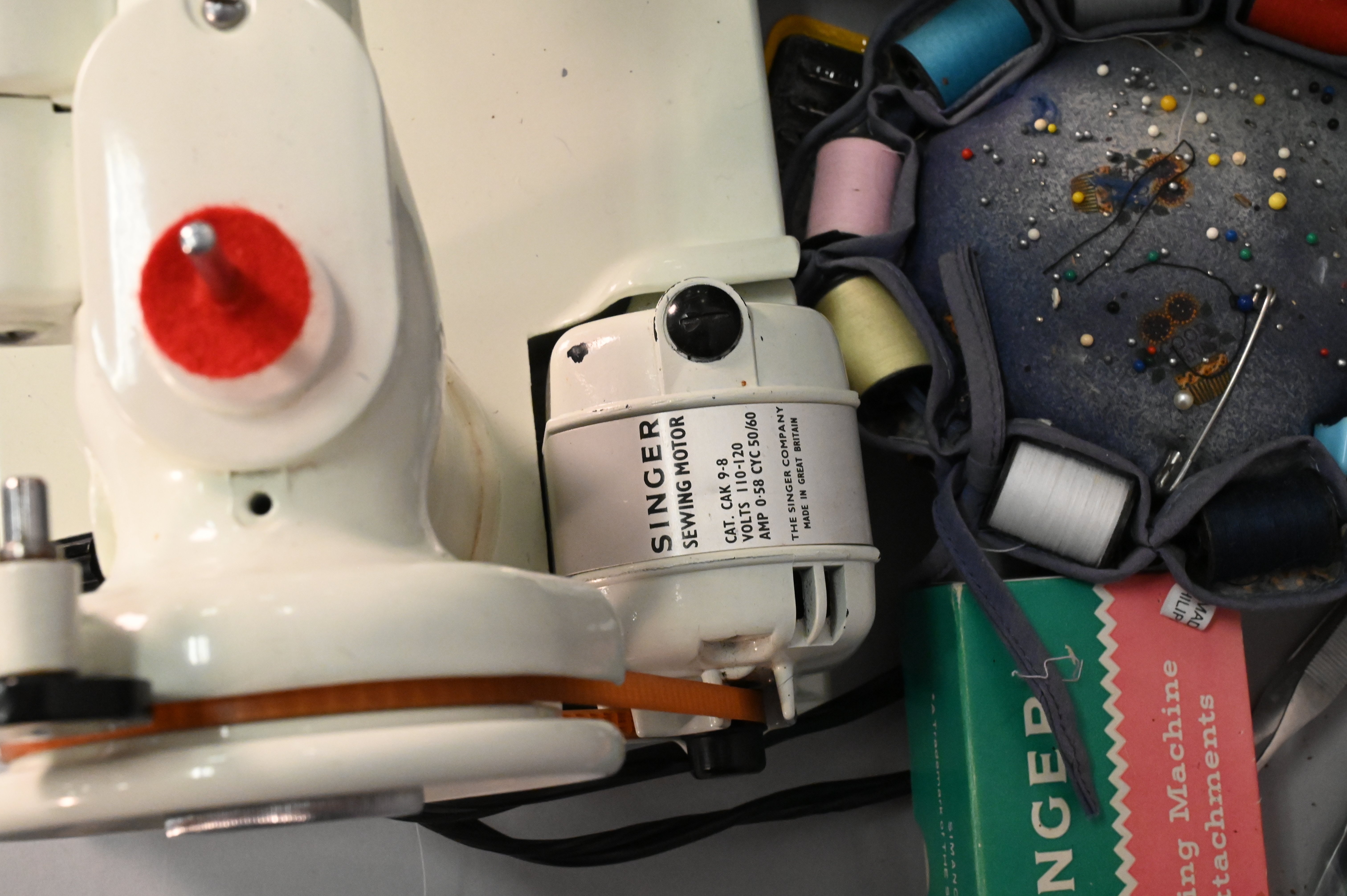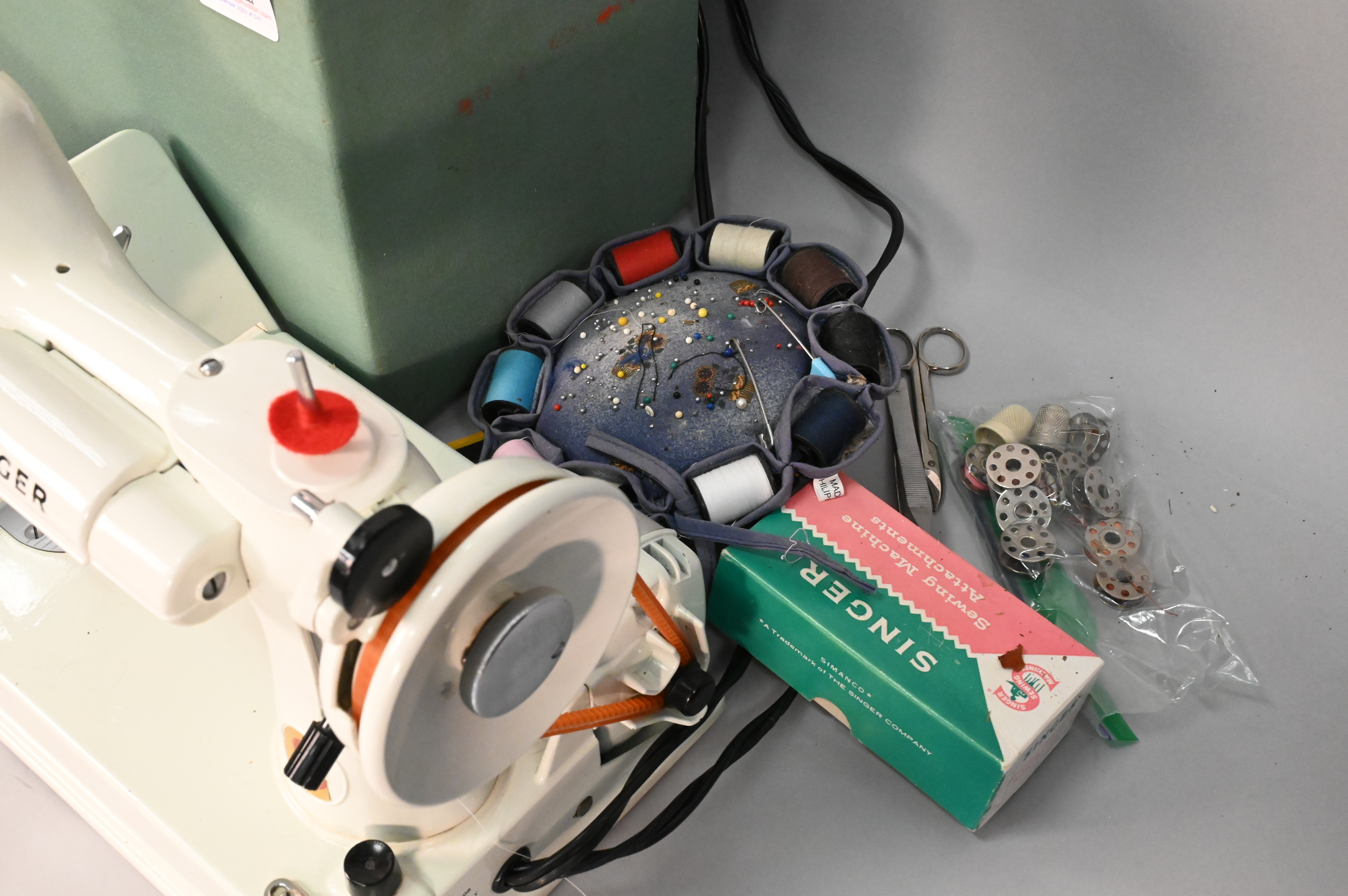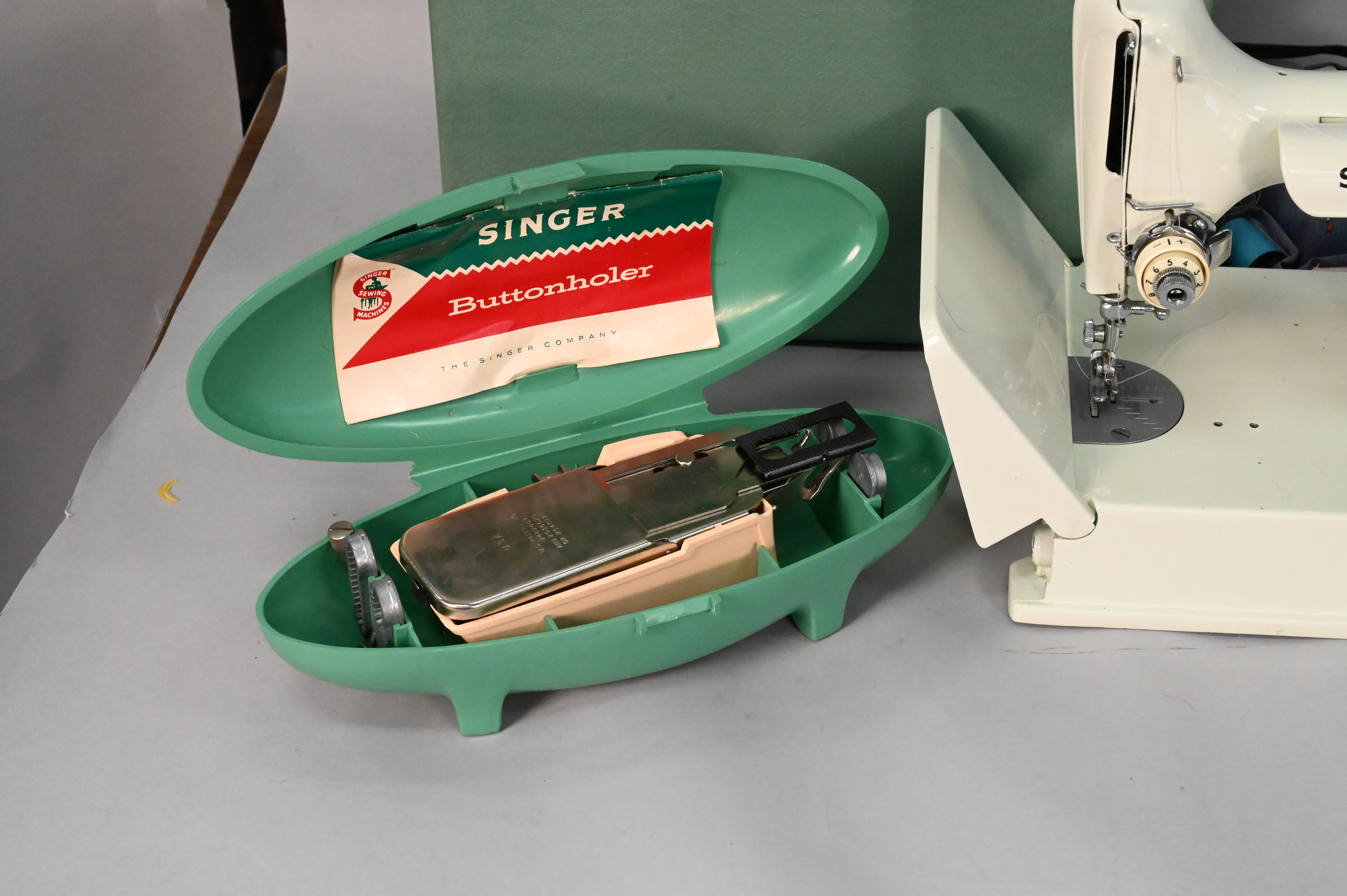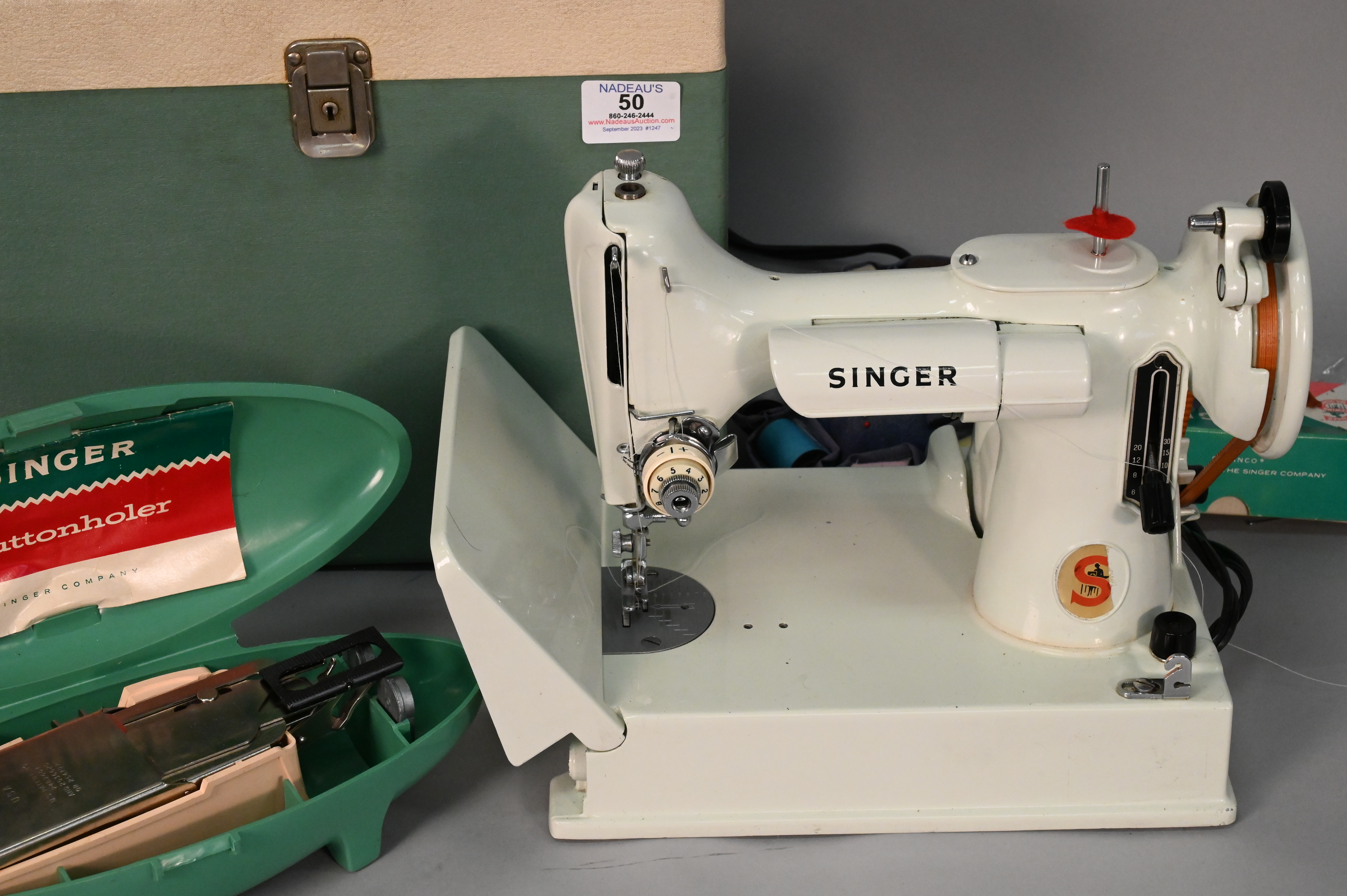 Singer Featherweight Sewing Machine, very light green original case, with attachments, height 11 inches, top 8″ x 12″