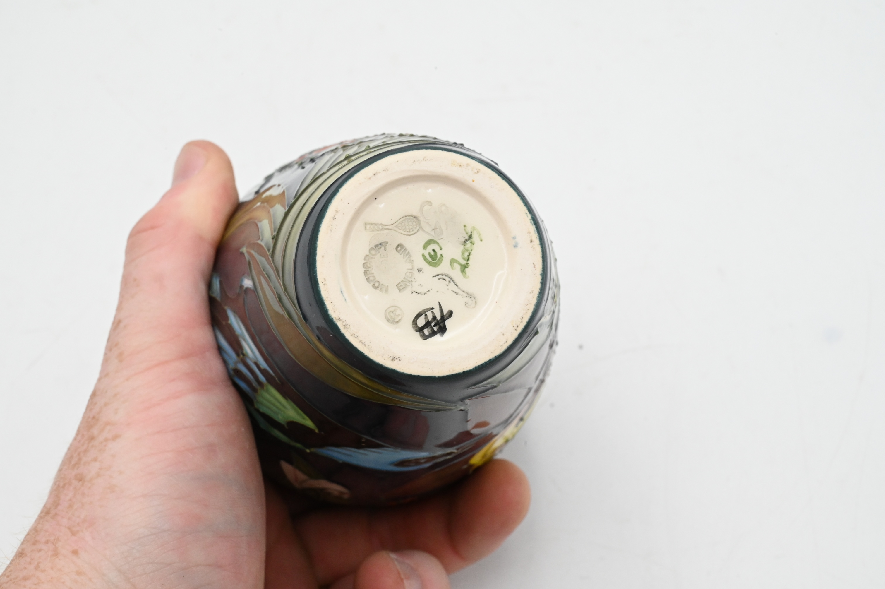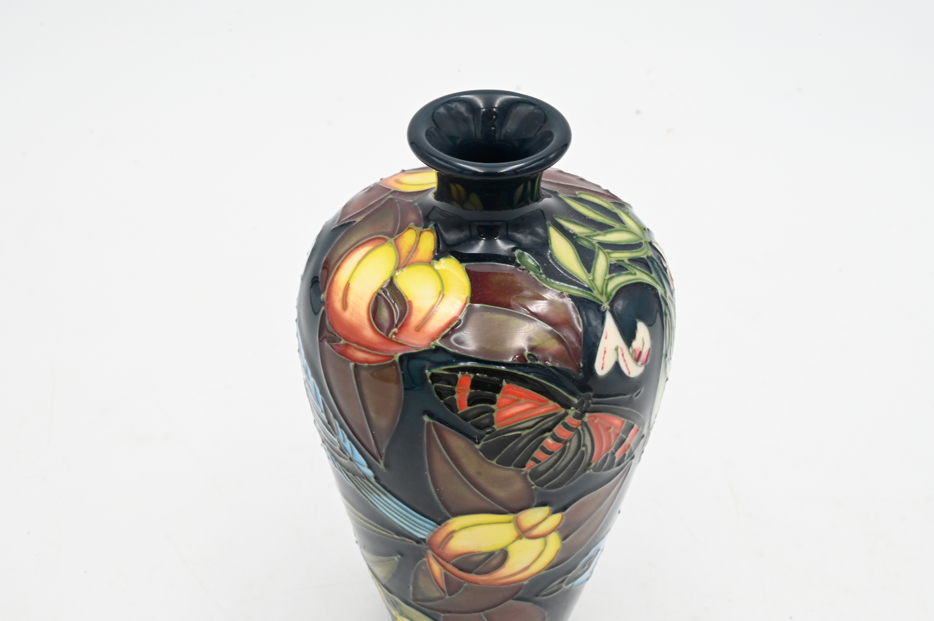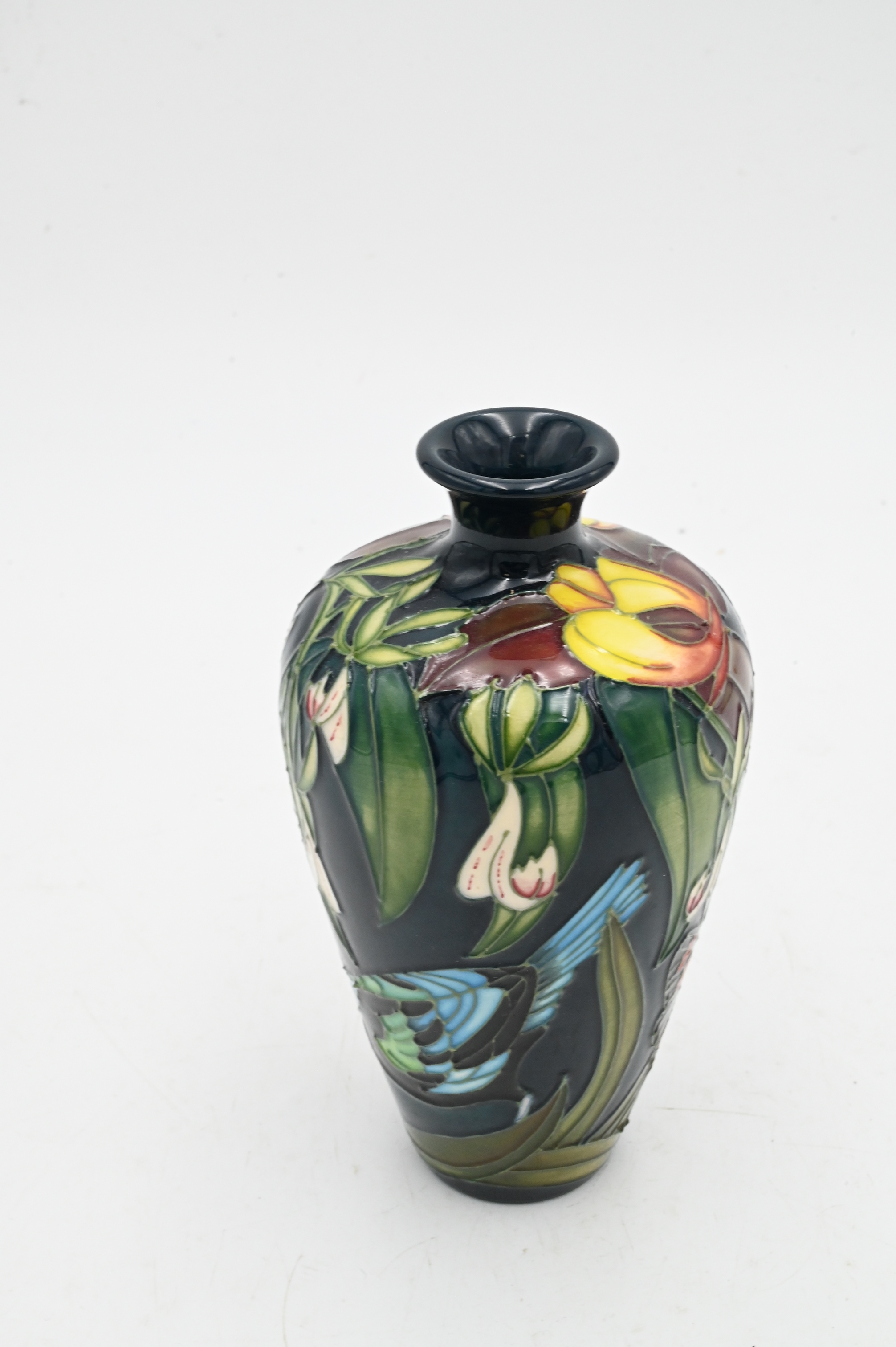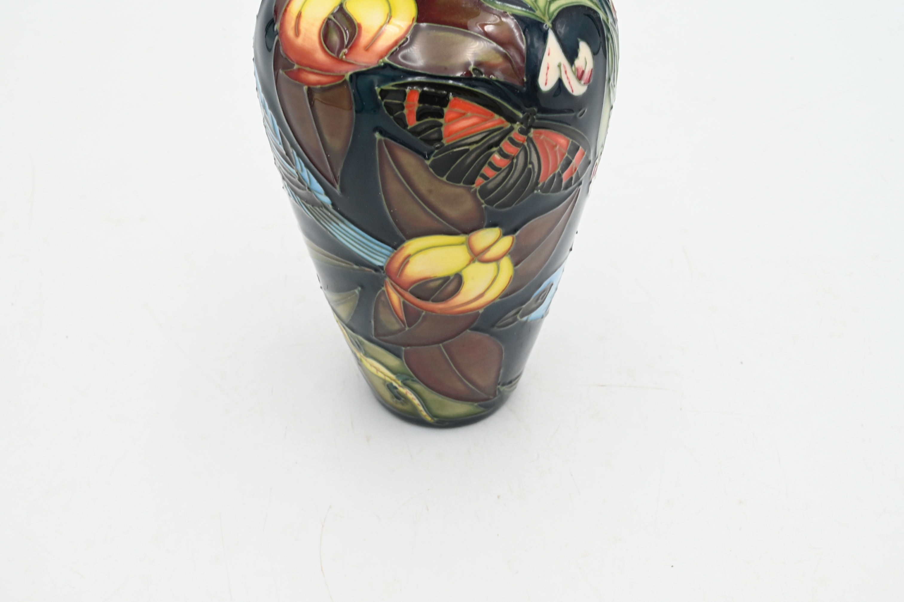 Small Moorcroft Vase, having flowers, birds and butterflies, mark moorcroft on bottom, height 6 1/2 inches