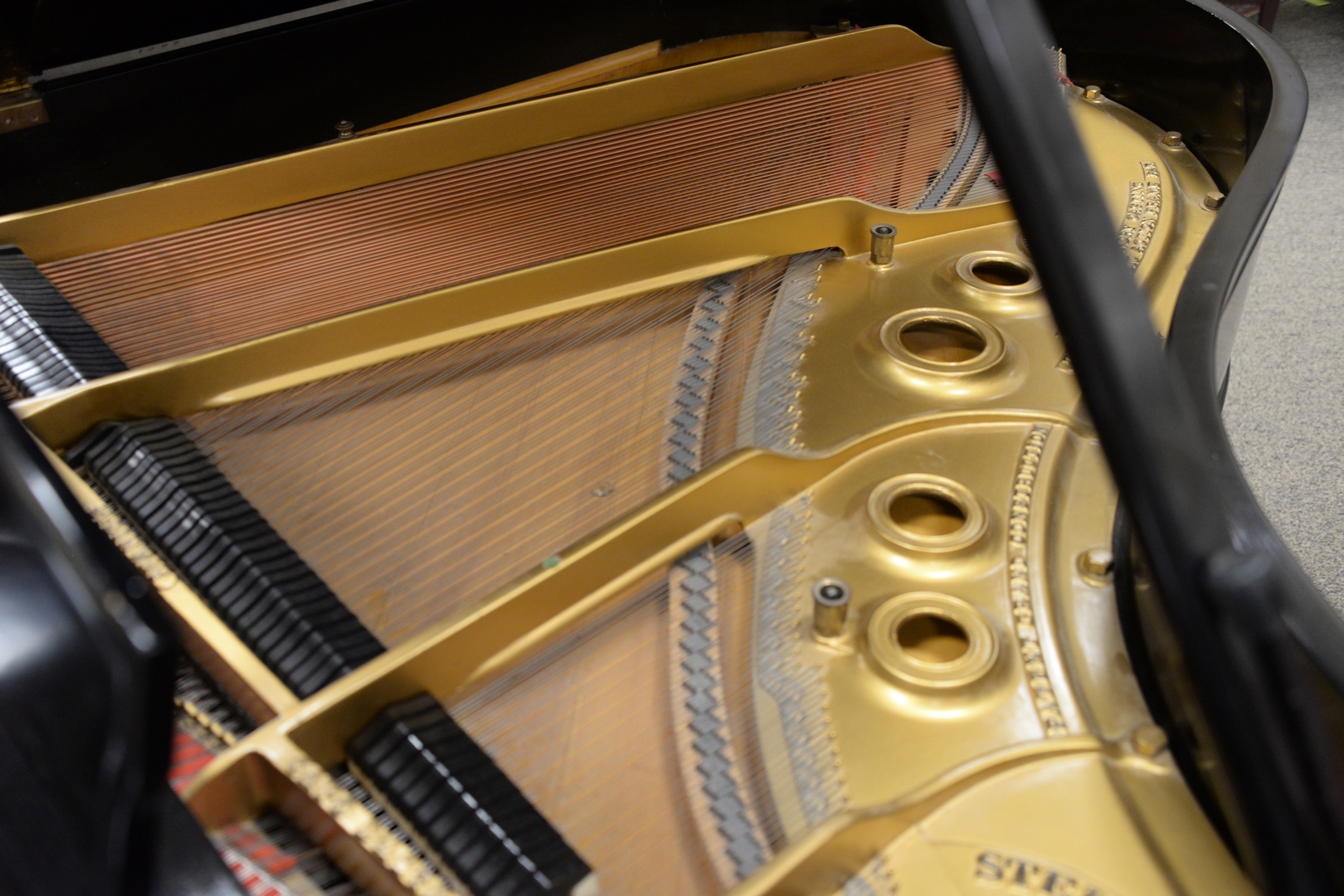 Steinway and Sons Grand Piano model A ebonized with Capo D’Astro Pat duplex scale cracked soundboard.