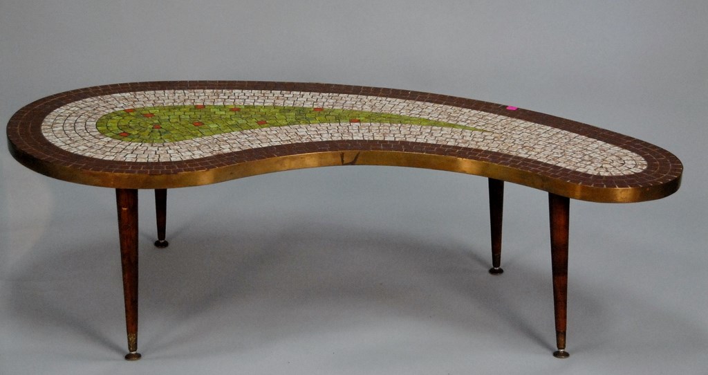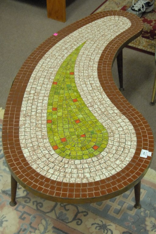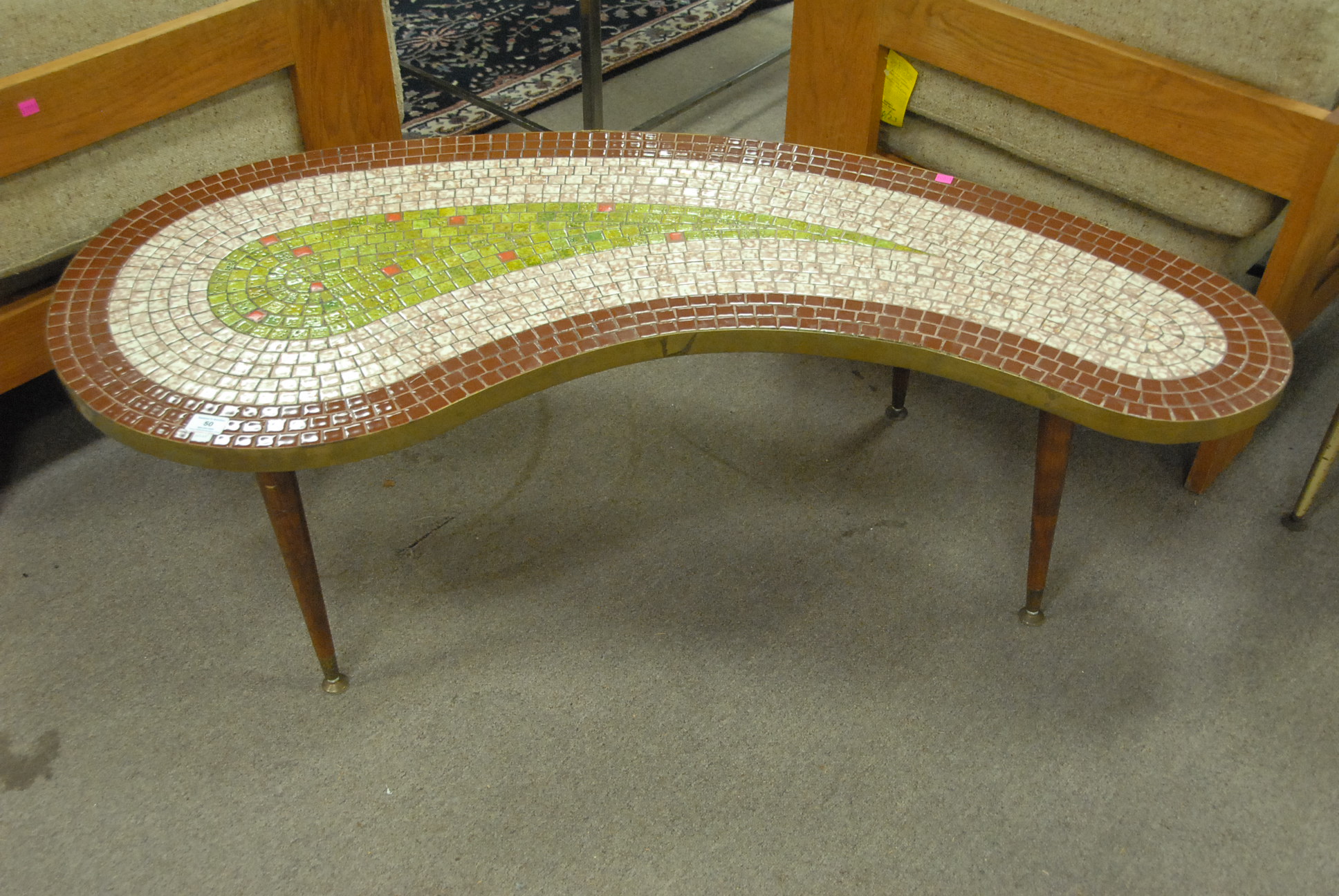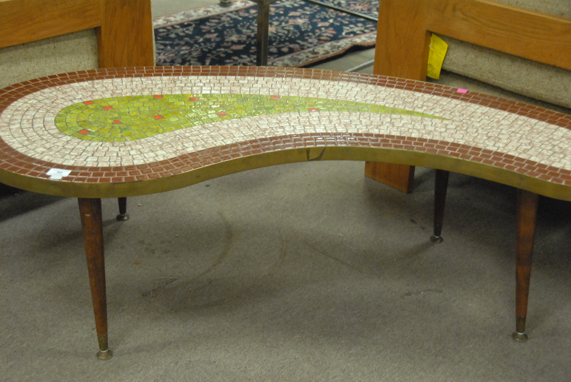 Tile top coffee table with brass banding and wood legs, 23 x 53.