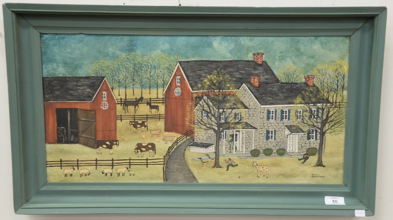 Two Dolores Hackenberger 1930 paintings including primitive oil on board winter scene signed lower left Dolores Hackenberger 12 x 24 and Pennsylvania farm oil on canvas 12 x 24.