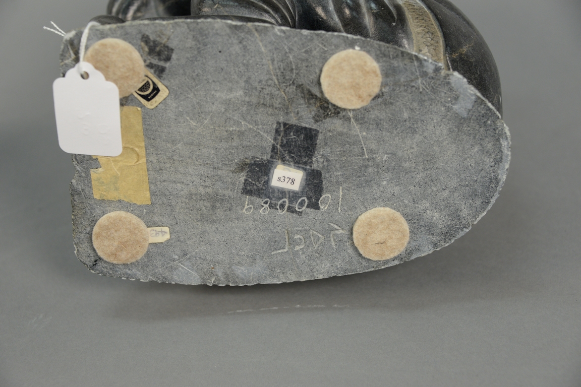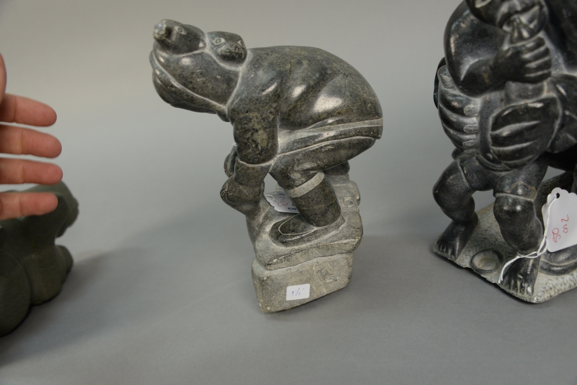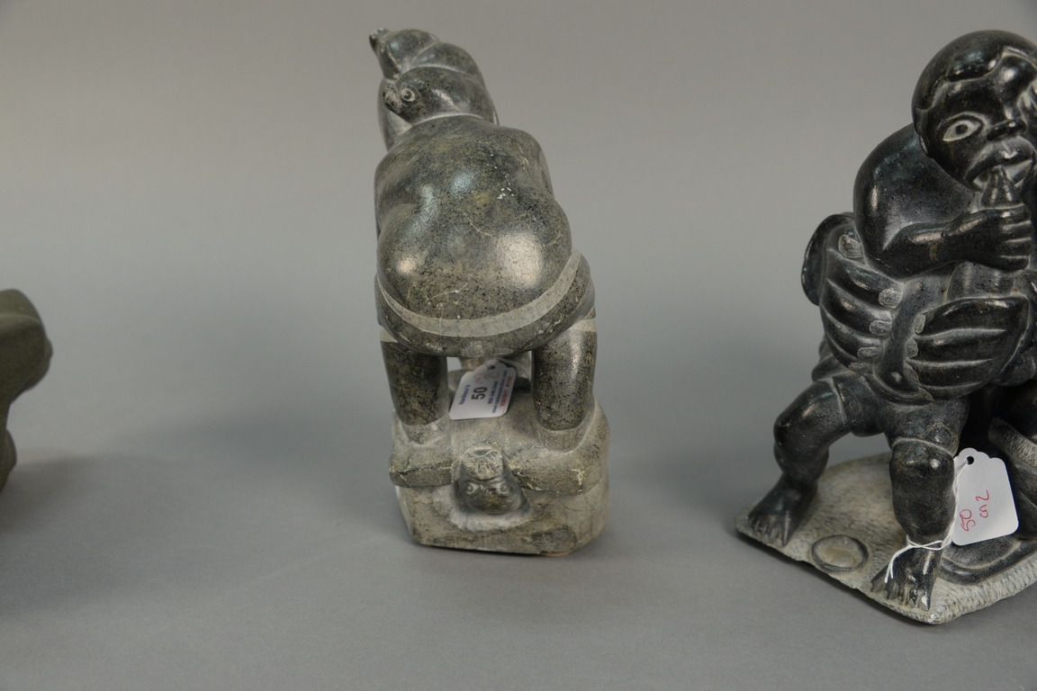 Lot 50: Two large Inuit Eskimo figural carvings including one attributed to Levi Qumaluk black soapstone Mother Feeding Child 9 1/2 x 8 x…