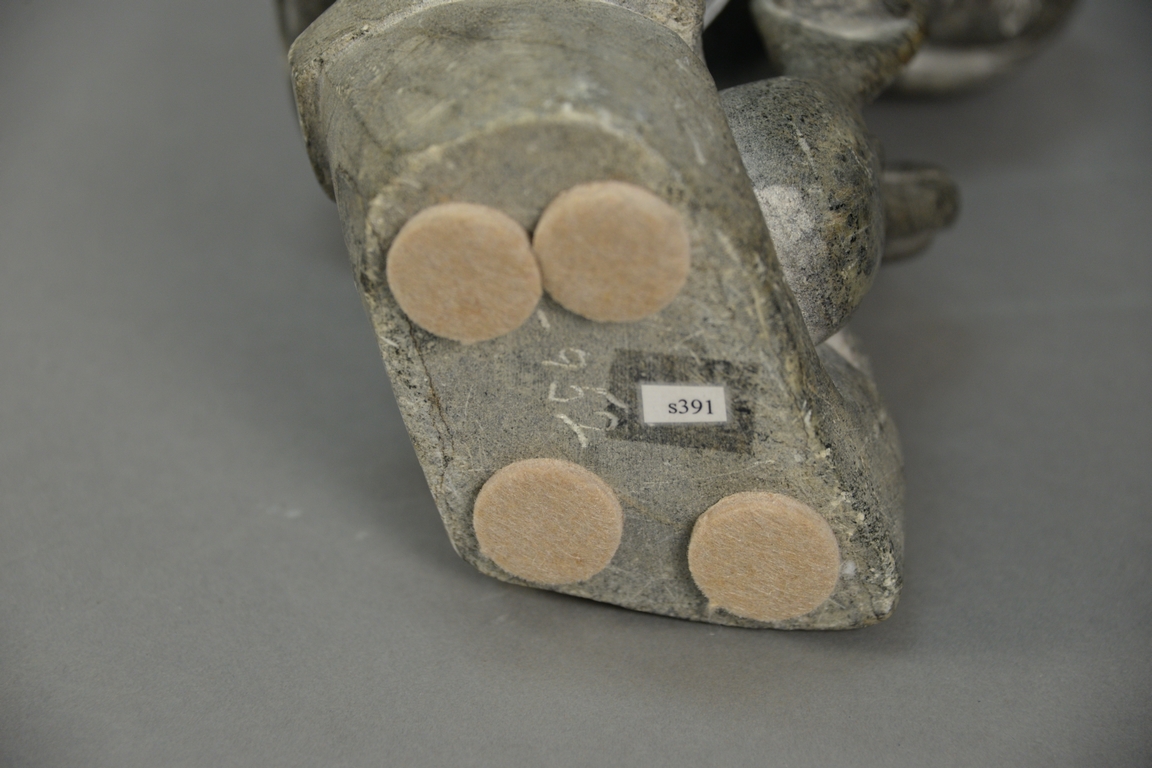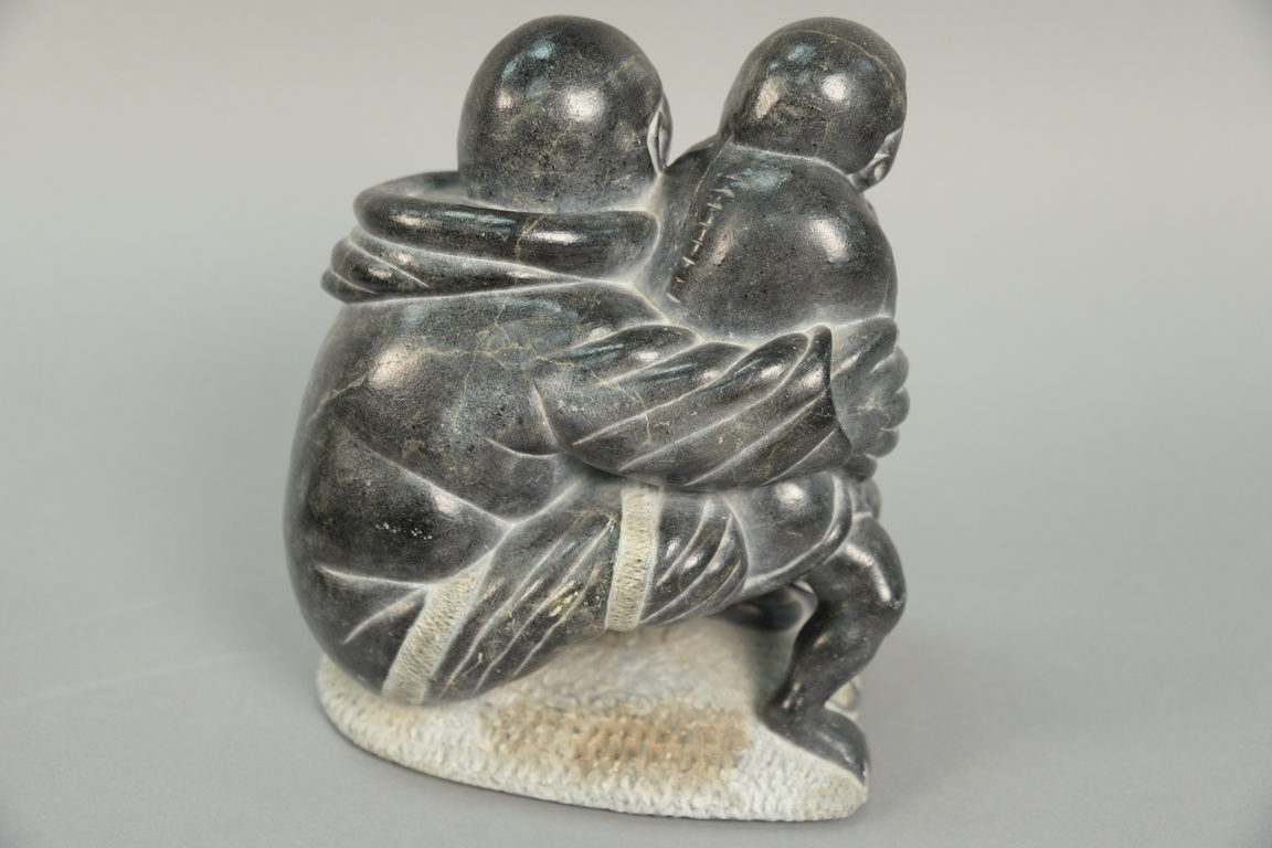 Two large Inuit Eskimo figural carvings including one attributed to Levi Qumaluk black soapstone Mother Feeding Child 9 1/2 x 8 x 5 and Daniel Quma Angiju 1929-1979 Puvirnituq-Northern Quebec grey basalt Hunter Attacked by Seals 9 1/2 x 5 1/2 x 3.