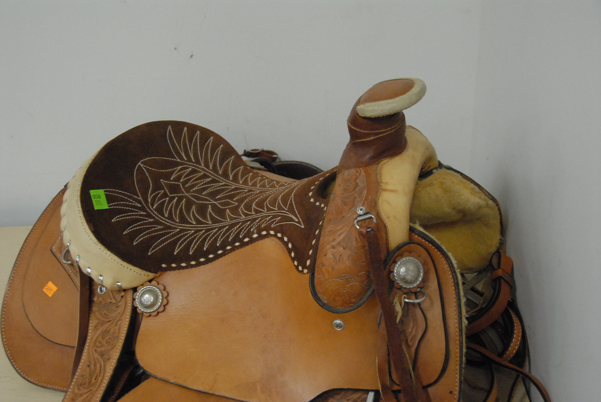 Western saddle and bridle with stitched suede seat.