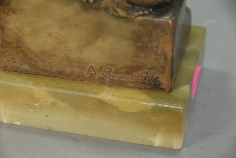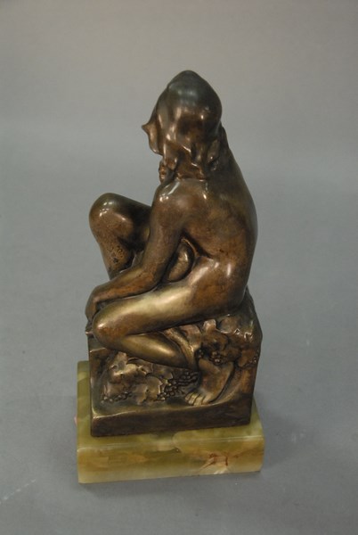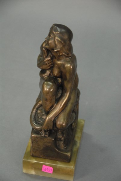 A. Gennarelli bronze seated girl with snake on green onyx base. ht. 11 1/2in.