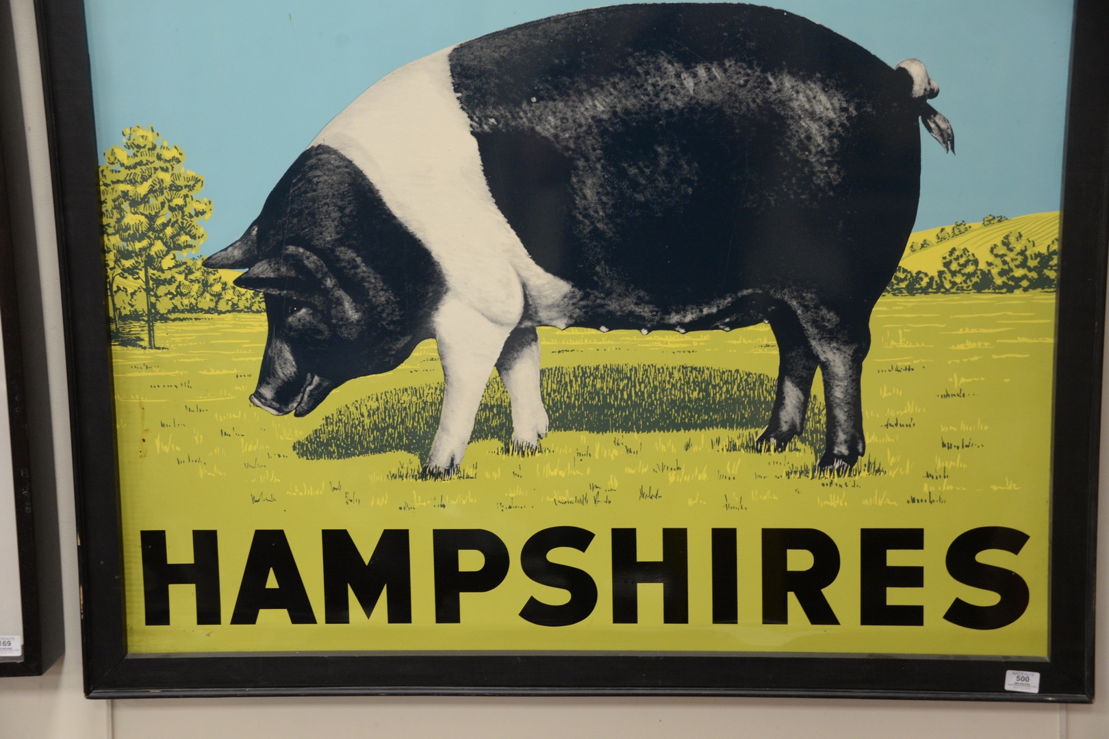 Lot 500: American Silk Screened Metal Hampshires Pig Sign, circa 1920, height 42 inches, width 4 feet.