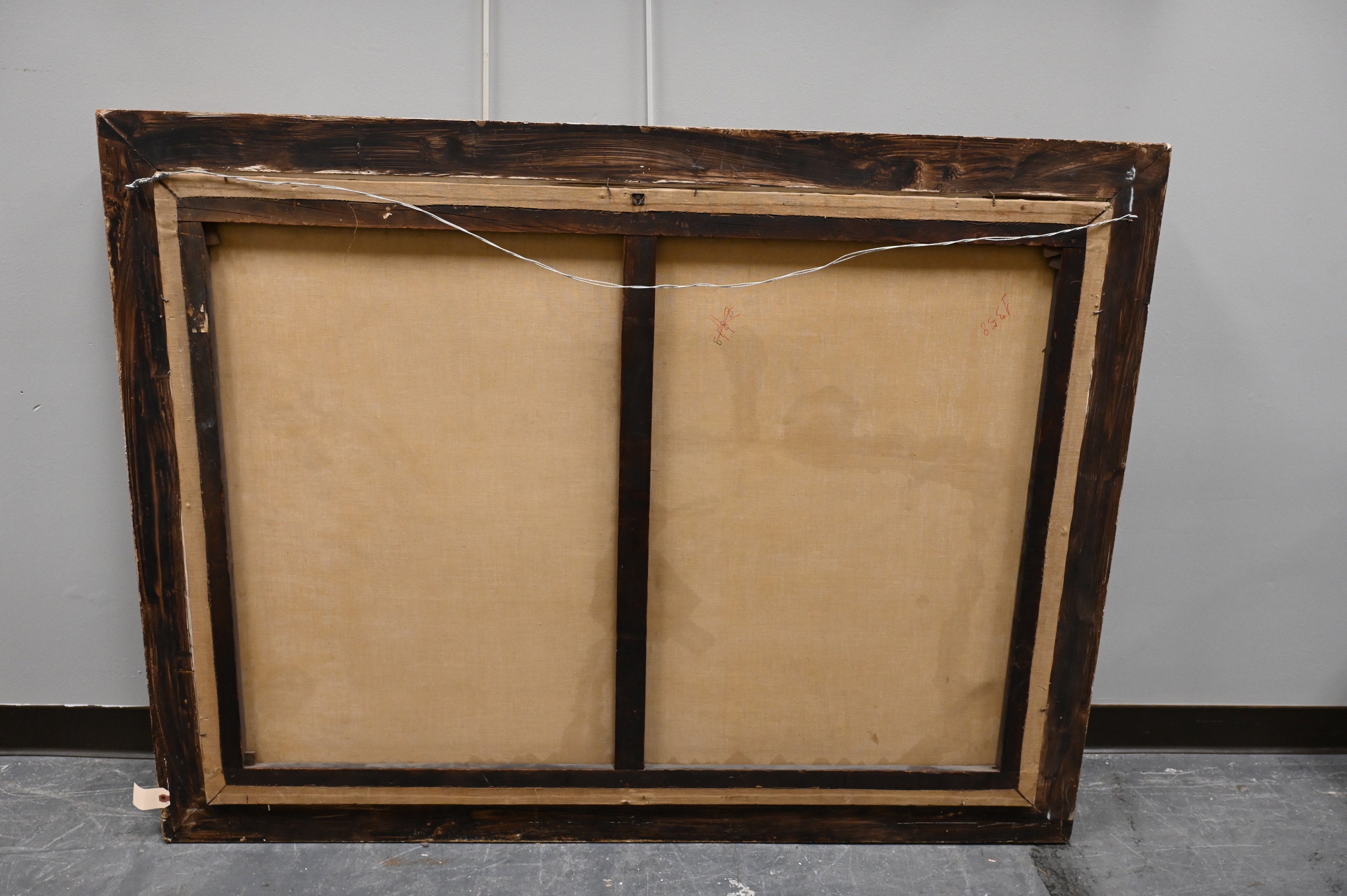Condition: surface grime, large abrasion center left, minor scratches, edge and frame wear, relined