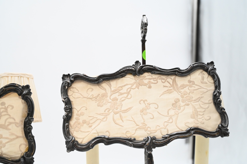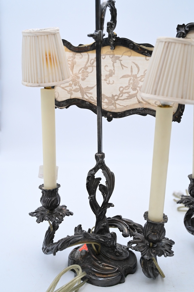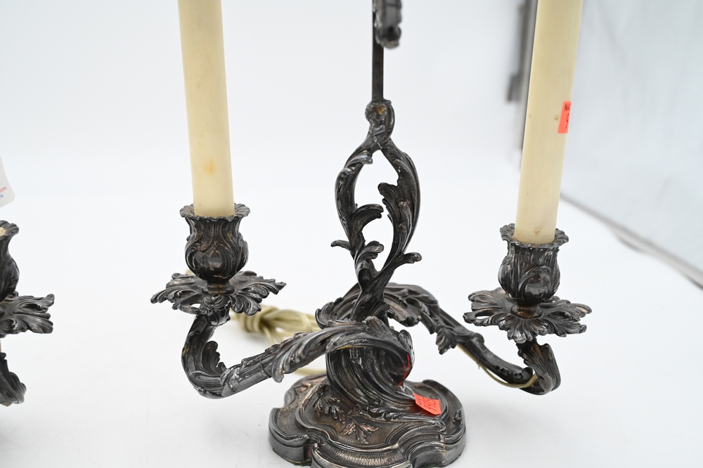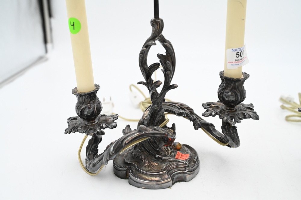 Lot 500: Pair of French Rococo Style Silver Plated Candelabras, having adjustable candle light screen, electrified and made into table lamps, height 19 inches overall. Provenance: From a private New York City collection, Provenance: From a private New York City collection.