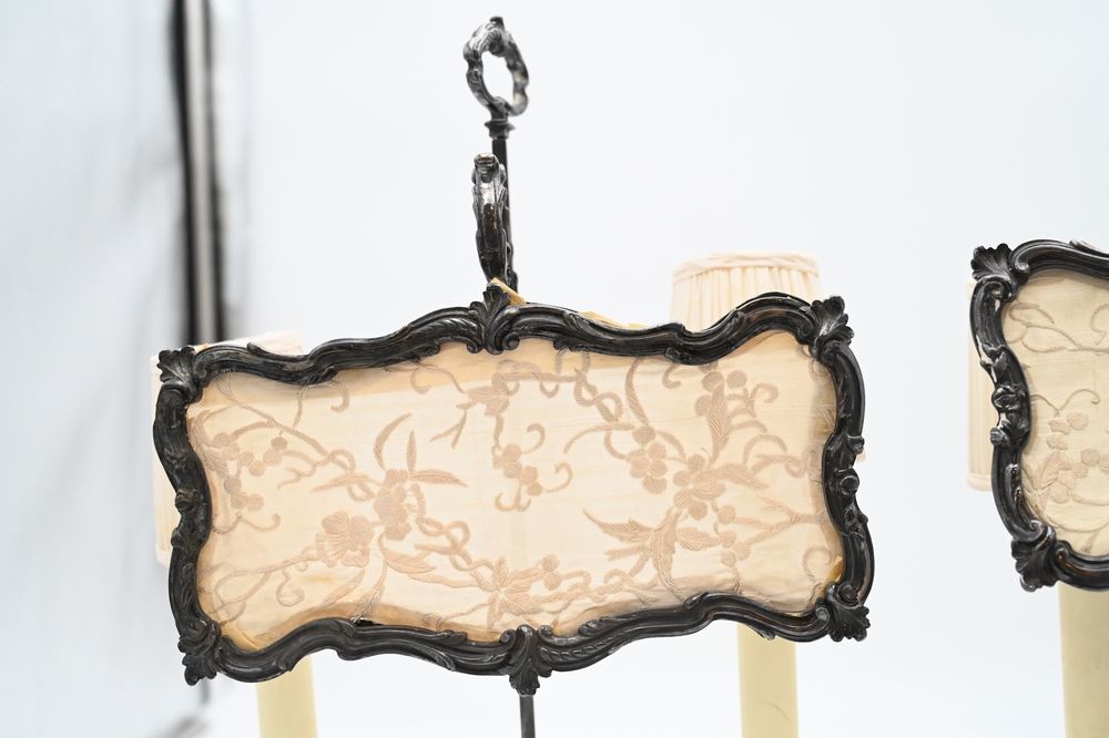 Pair of French Rococo Style Silver Plated Candelabras, having adjustable candle light screen, electrified and made into table lamps, height 19 inches overall. Provenance: From a private New York City collection, Provenance: From a private New York City collection.