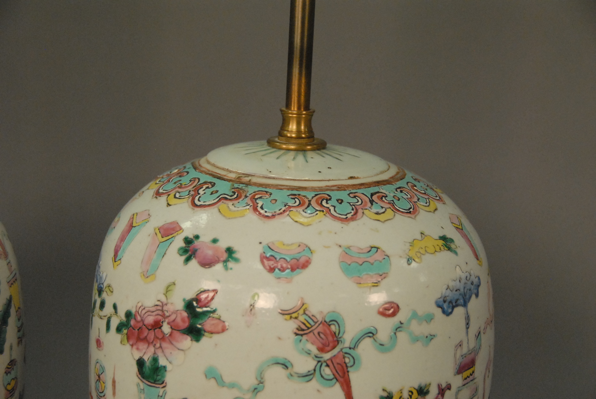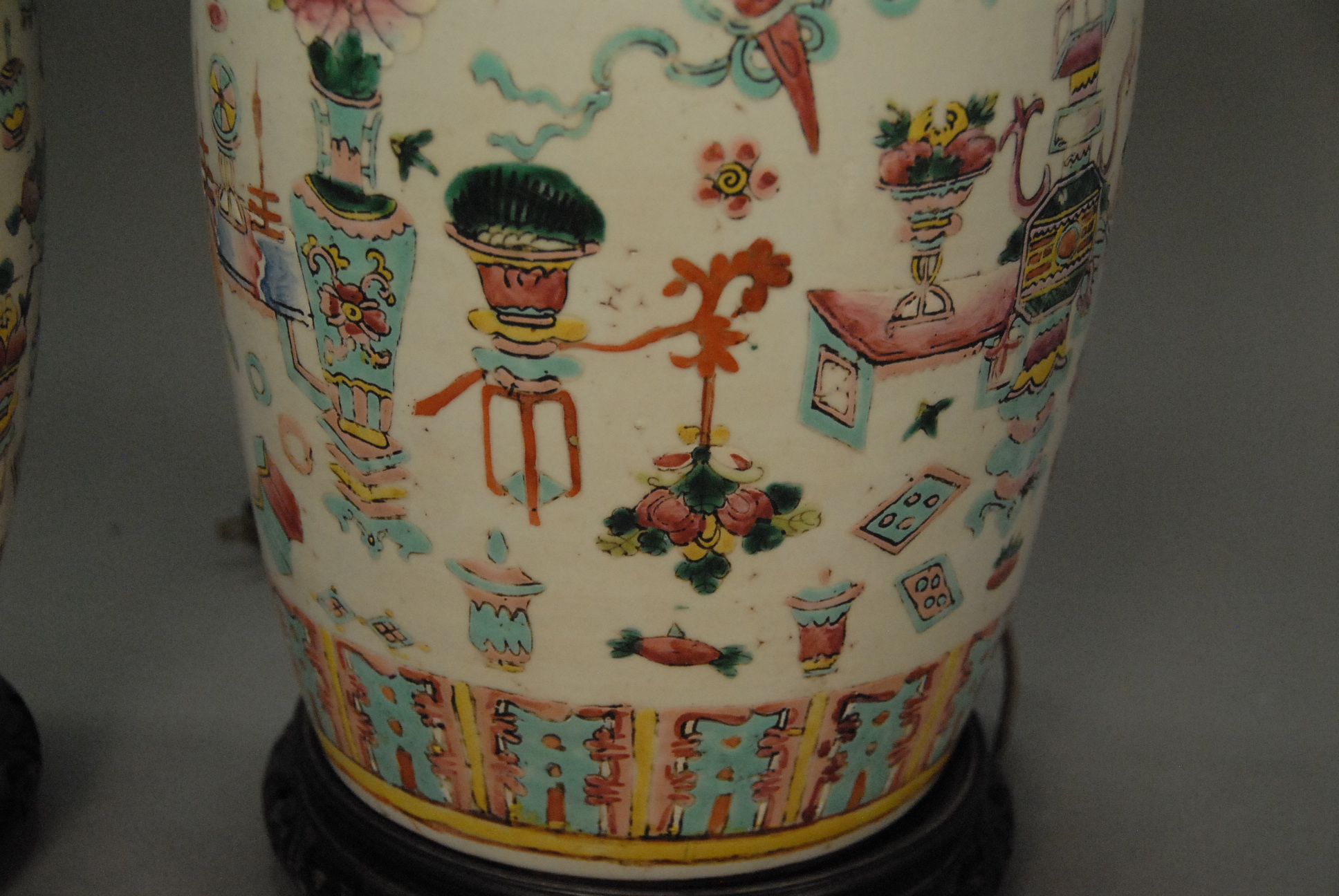 Pair of Oriental porcelain covered vases made into table lamps. vase ht. 13in.