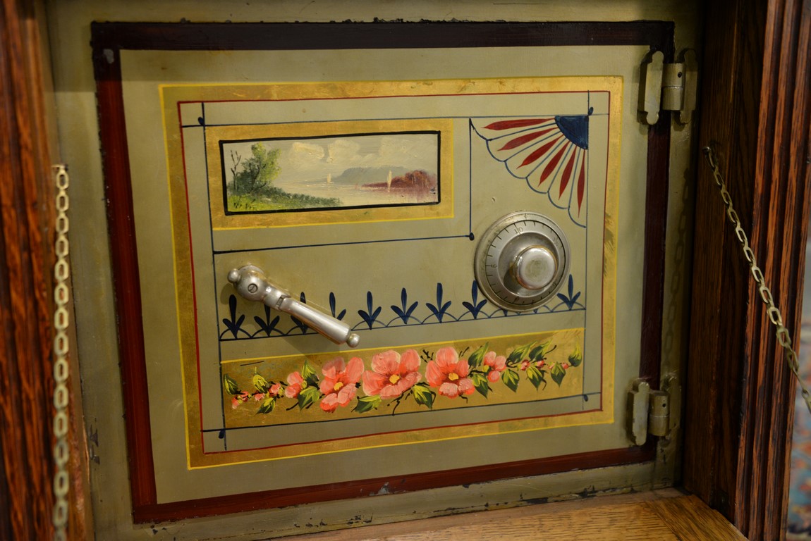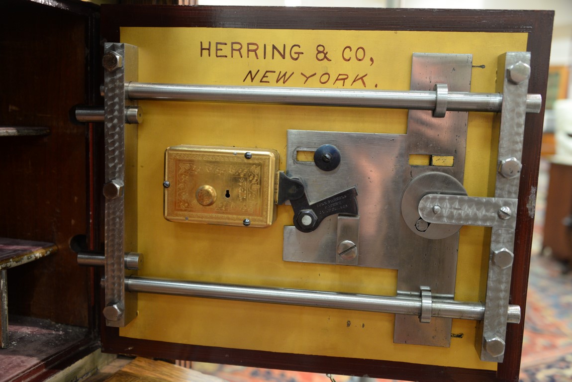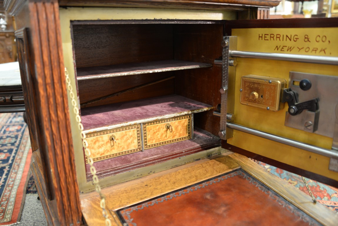 R. J. Horner Victorian oak safe cabinet having carved winged griffins back splash, carved face on door with winged griffin supports on base with round feet, interior having painted Herring & Co. New York safe with fitted birdseye maple drawers.