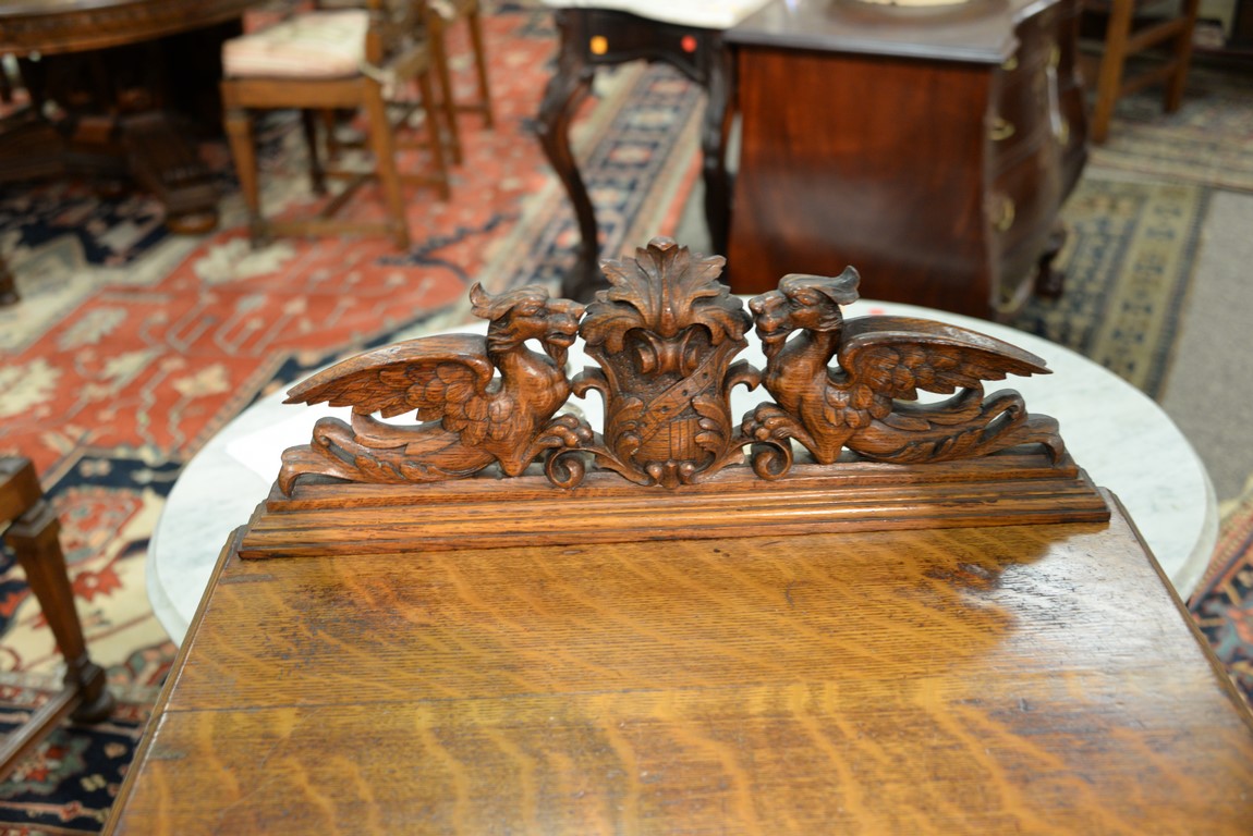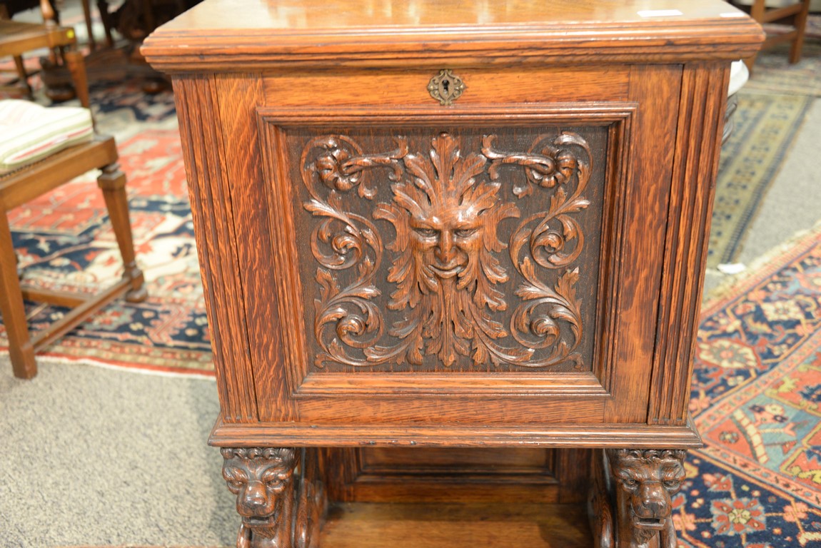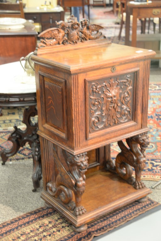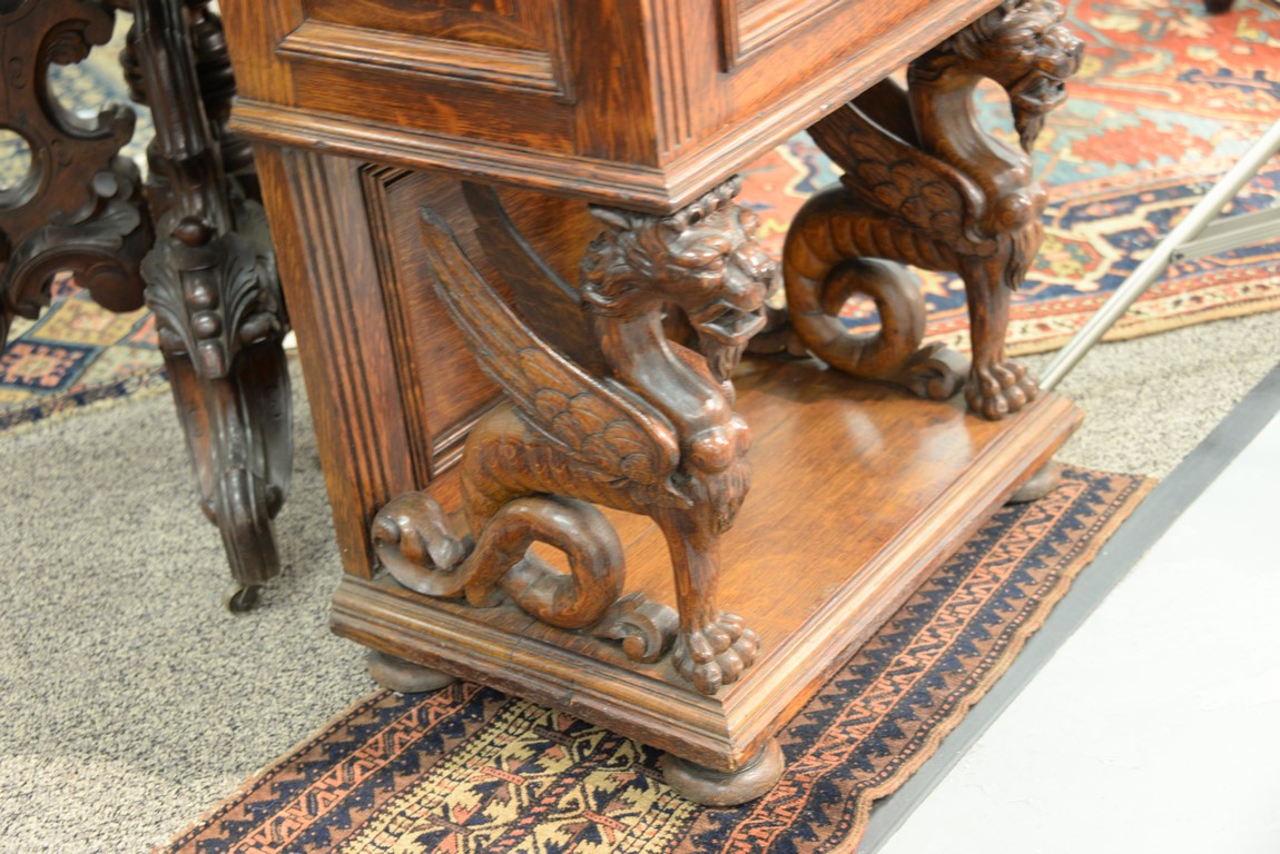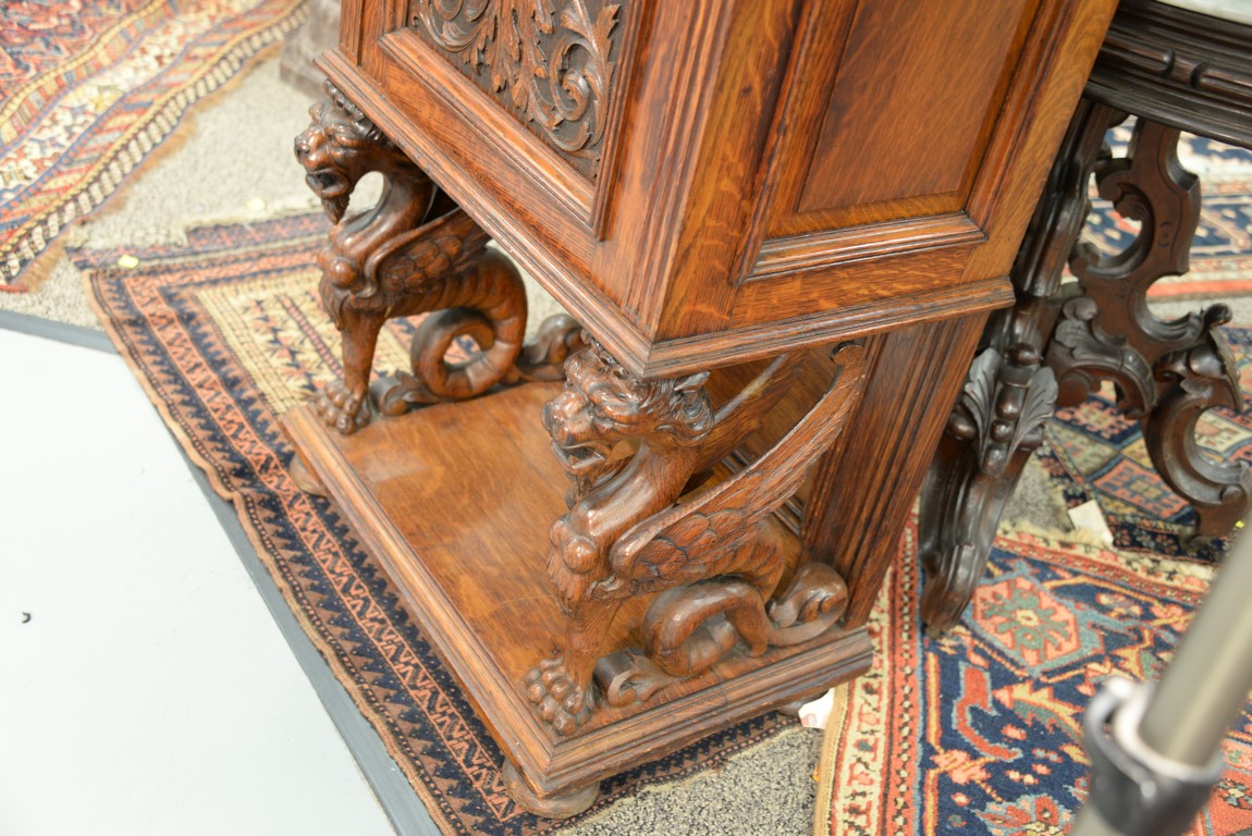 Lot 500: R. J. Horner Victorian oak safe cabinet having carved winged griffins back splash, carved face on door with winged griffin supports …