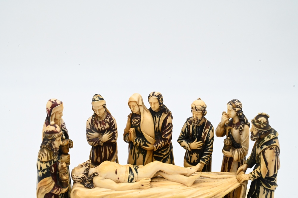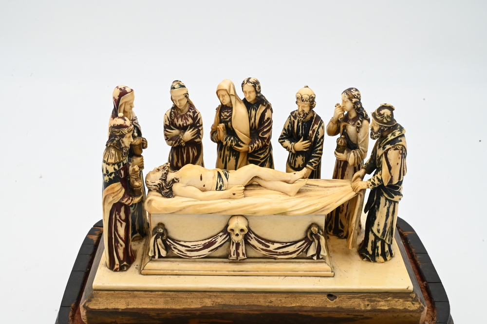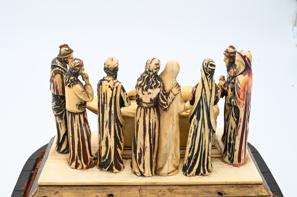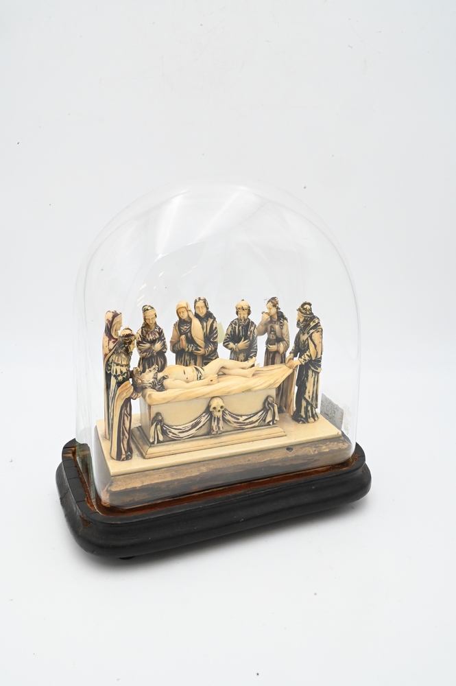Religious Ivory Figural Group, to include Jesus on altar under glass dome, total height with dome 10 1/2 inches. Please note: Items containing ivory cannot be purchased or shipped by bidders residing outside of the United States or California, Hawaii, Nevada, New Jersey, New York, Washington, Oregon, or District of Columbia. If an ivory item is purchased by a bidder in one of the above mentioned locations or attempts to ship ivory to one of the above mentioned locations, bidder will forfeit the item and be responsible for any incurred fees such as a restocking fee.