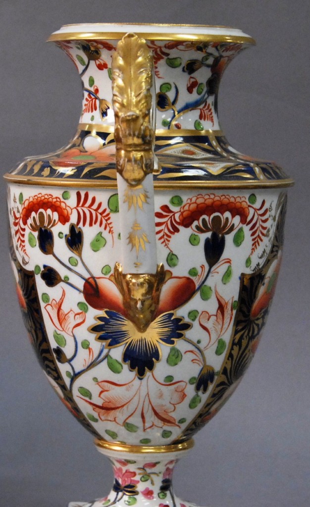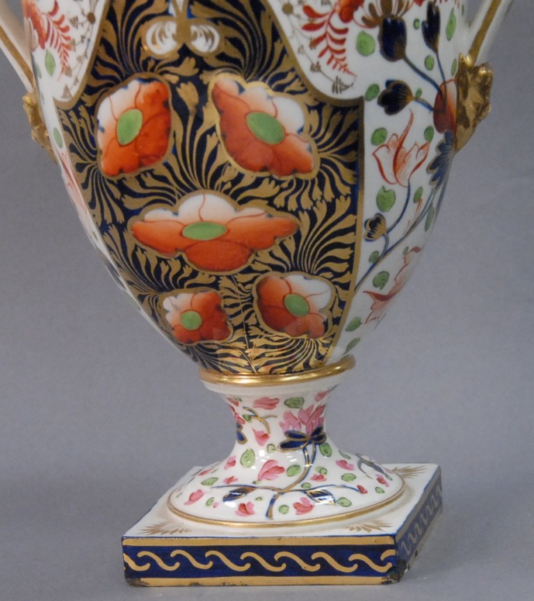 Royal Crown Derby urn in typical orange, blue, and gold decoration, gilt handles end in masks, all set on square base small chips on base. height 11 1/2in.