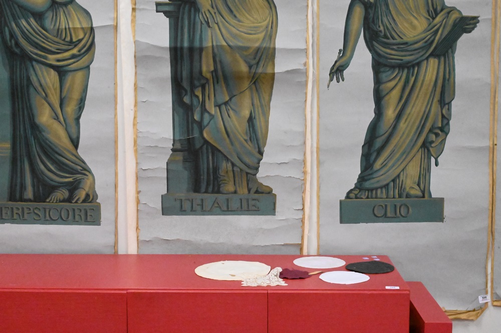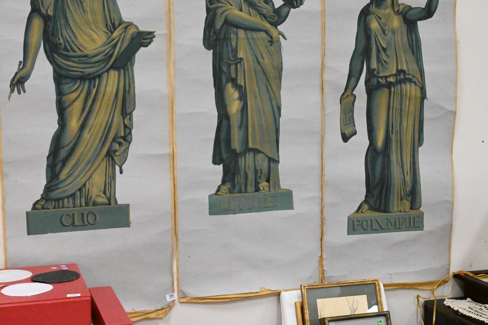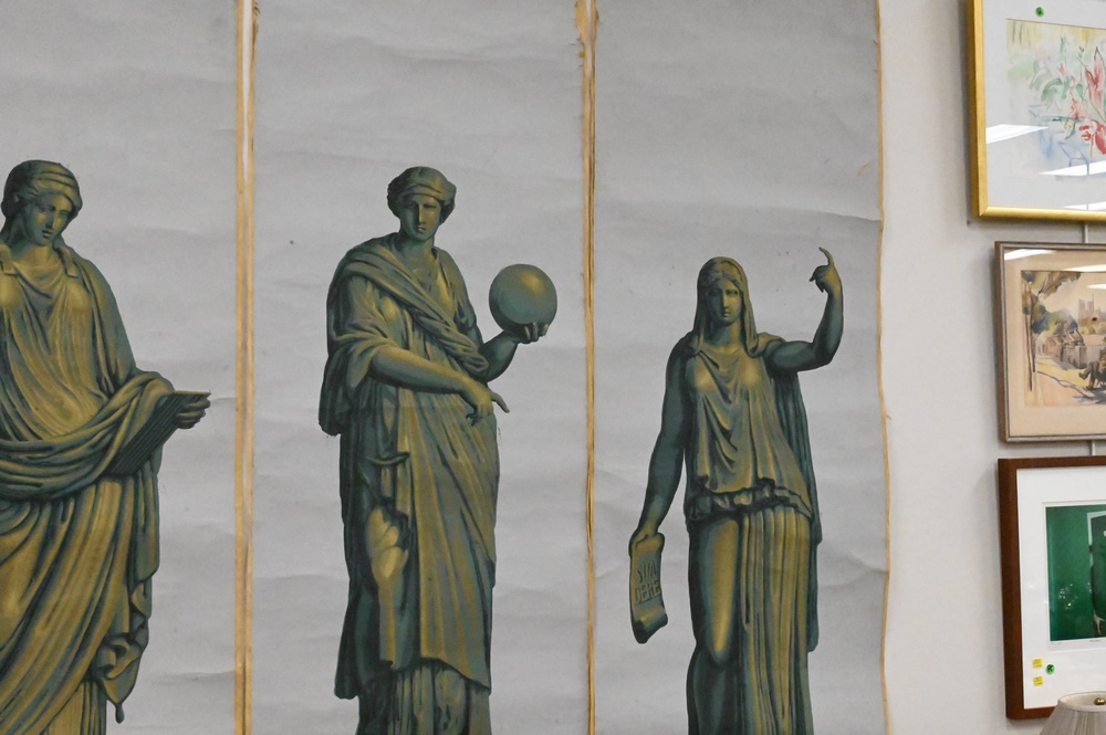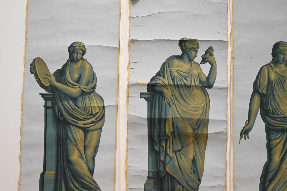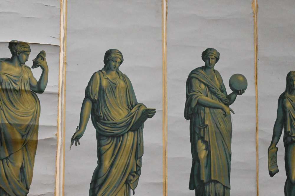Set of Five Wallpaper Panels, mounted on cloth, of Greek figures, tallest 70 inches.