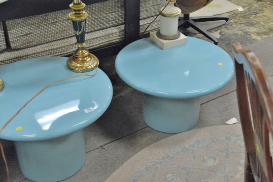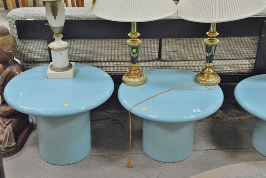 Three turquoise laminated mushroom end tables. ht. 14 in. dp. 24 in.
