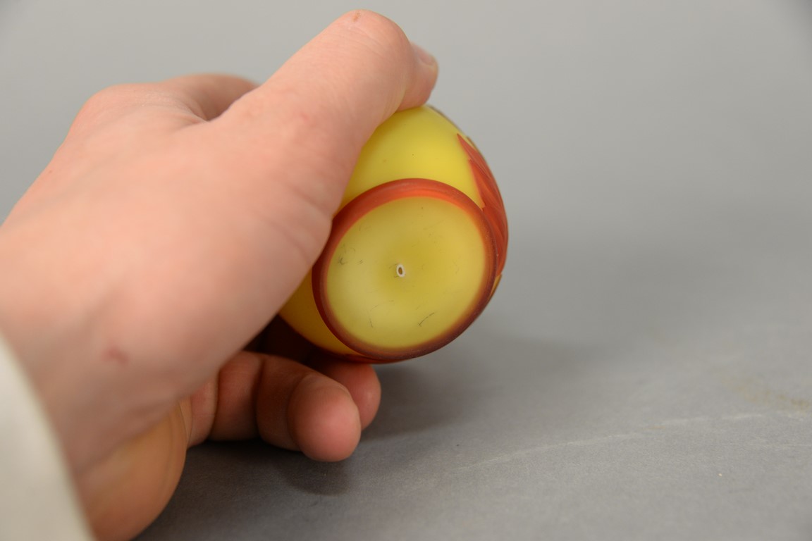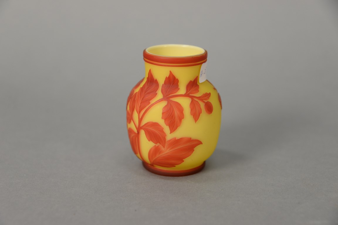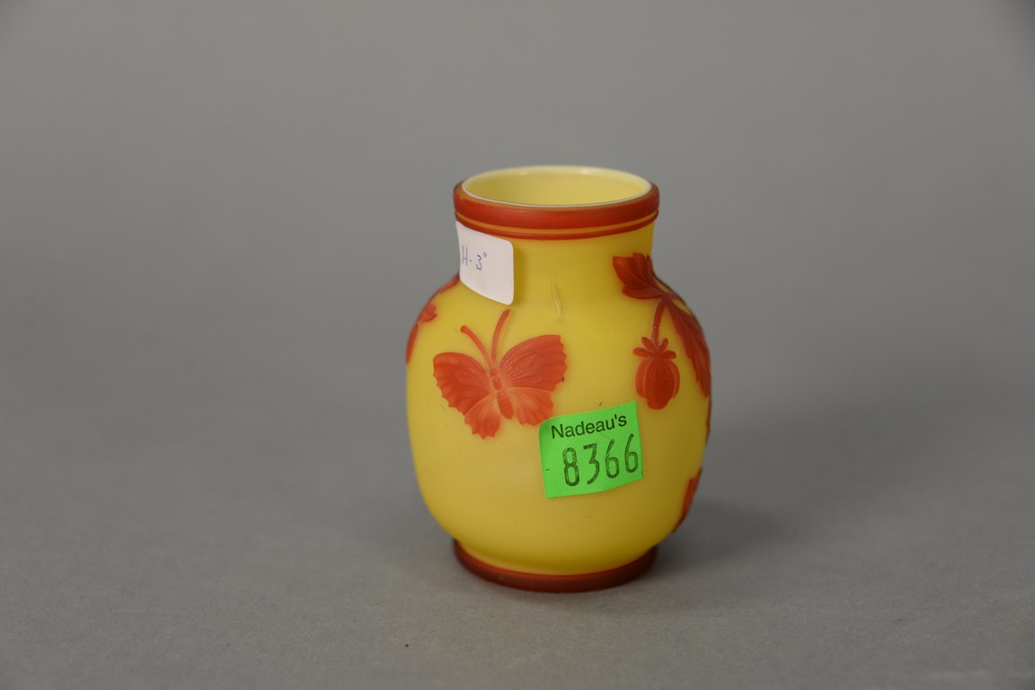 Cameo cabinet vase, red over yellow with flowers and butterfly. height 3 1/8 inches