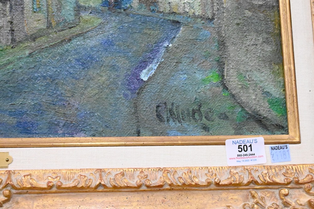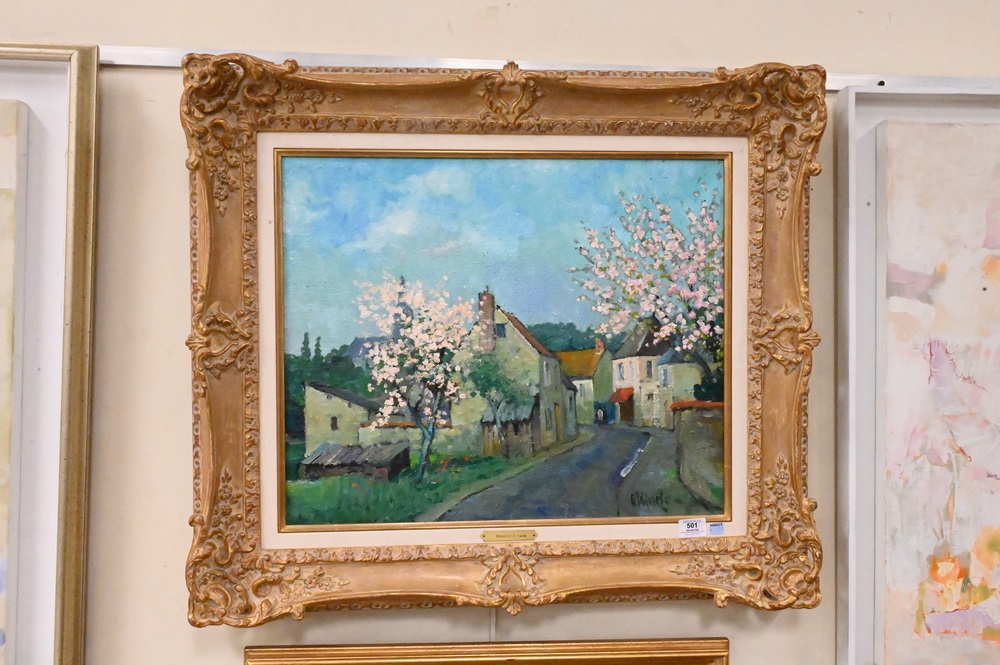 Lot 501: Constantin Kluge (1912 – 2003), street scene with blossoming trees, oil on canvas, signed lower right C Kluge, 19″ x 23 1/2″.