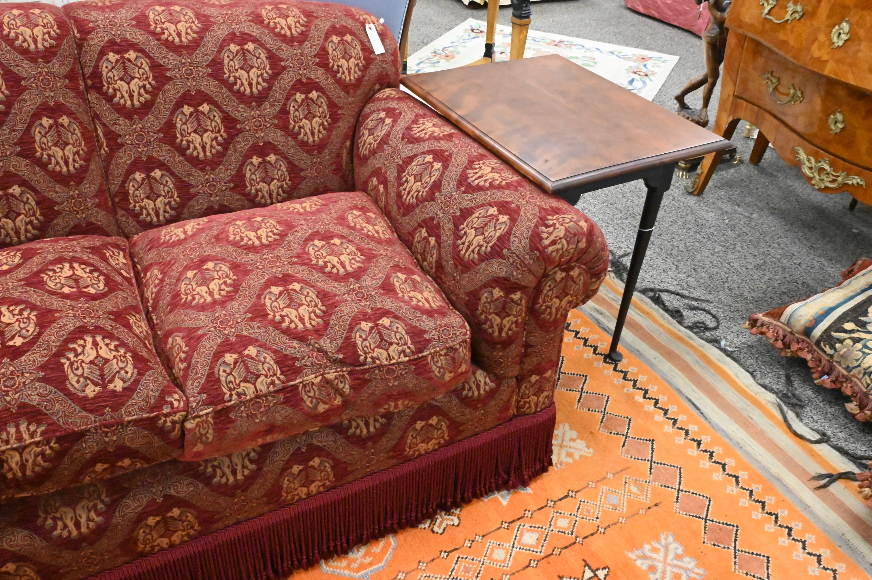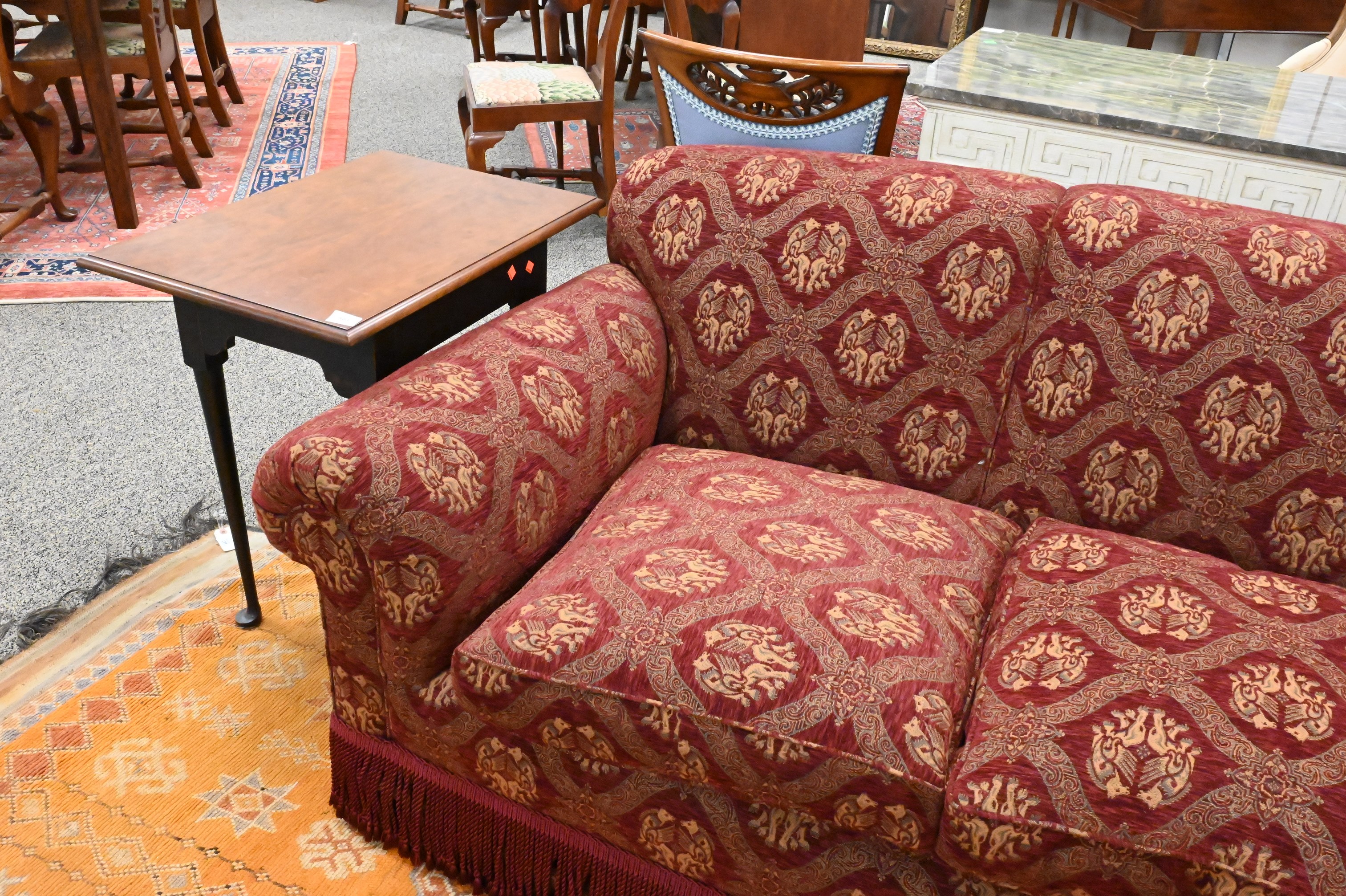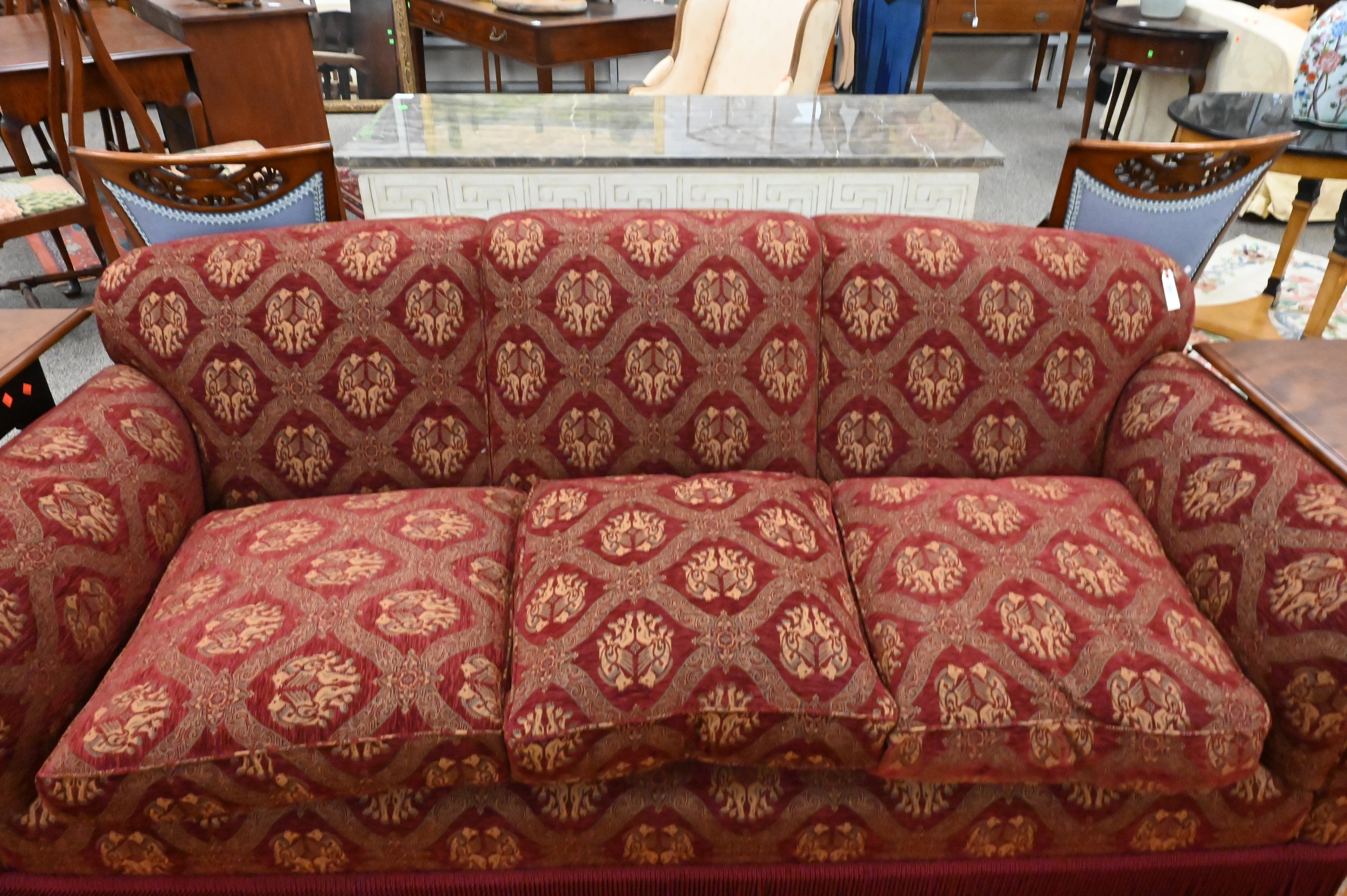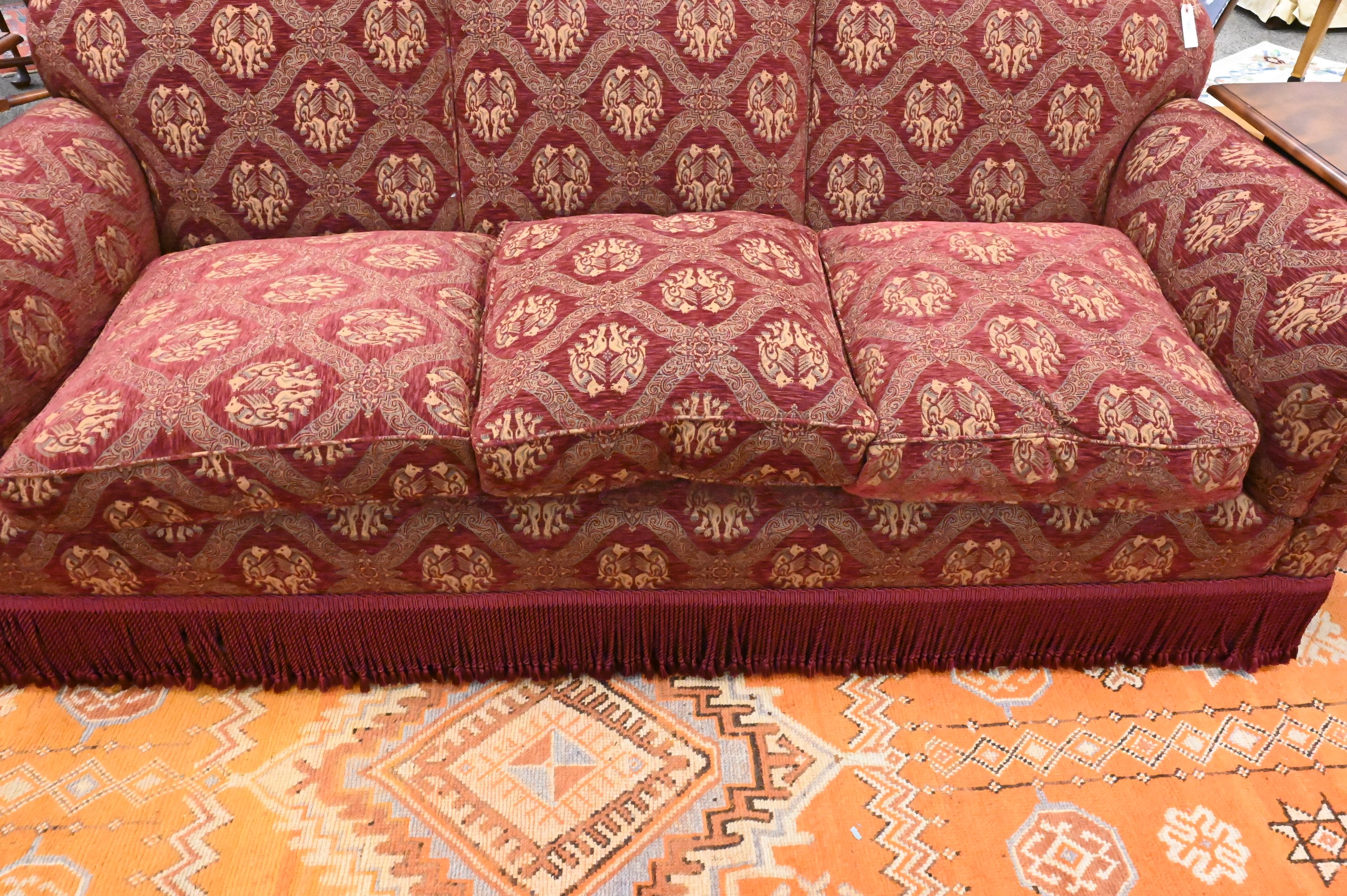 having three cushion seat and fringe skirt in the manner of De Angelis, New York