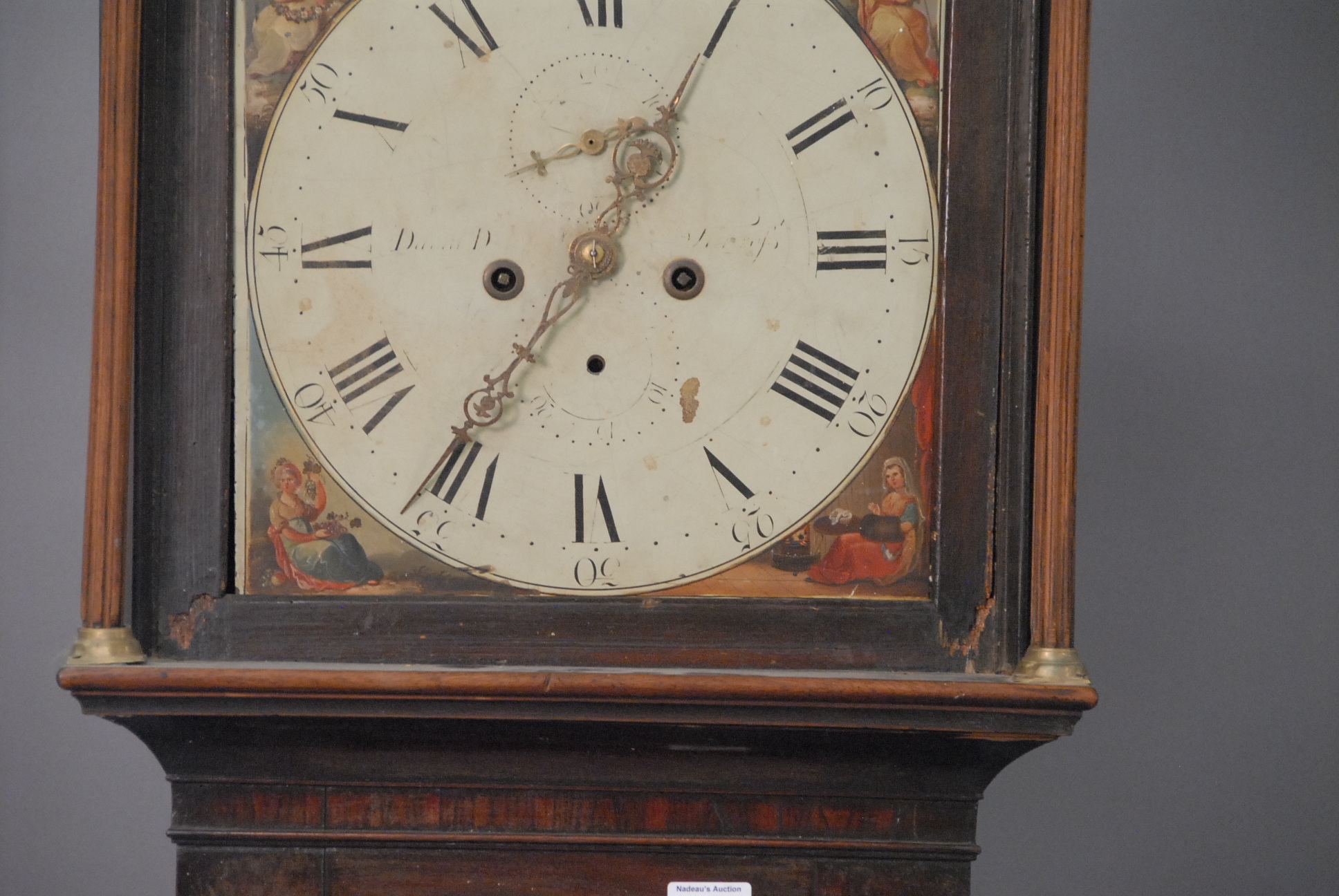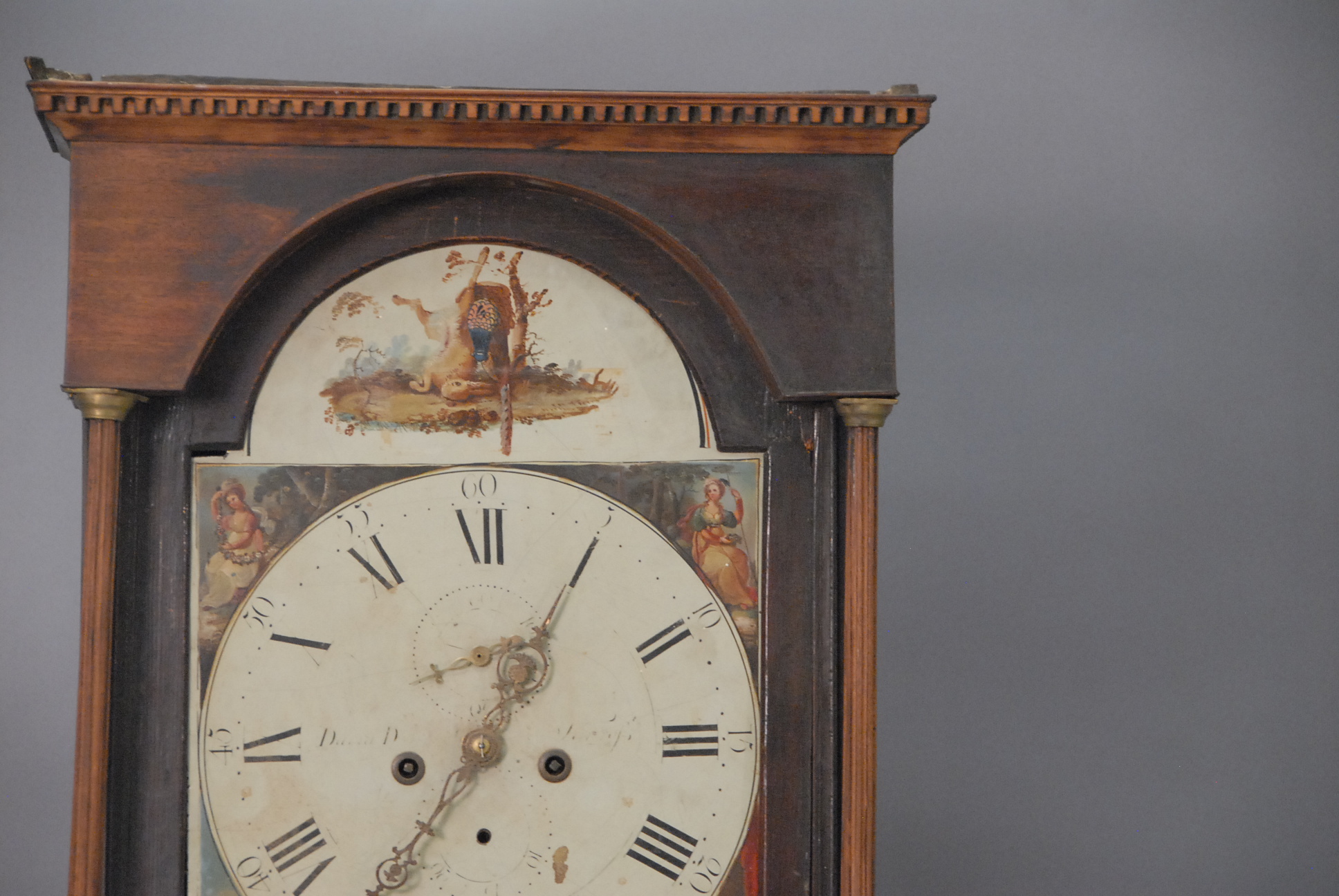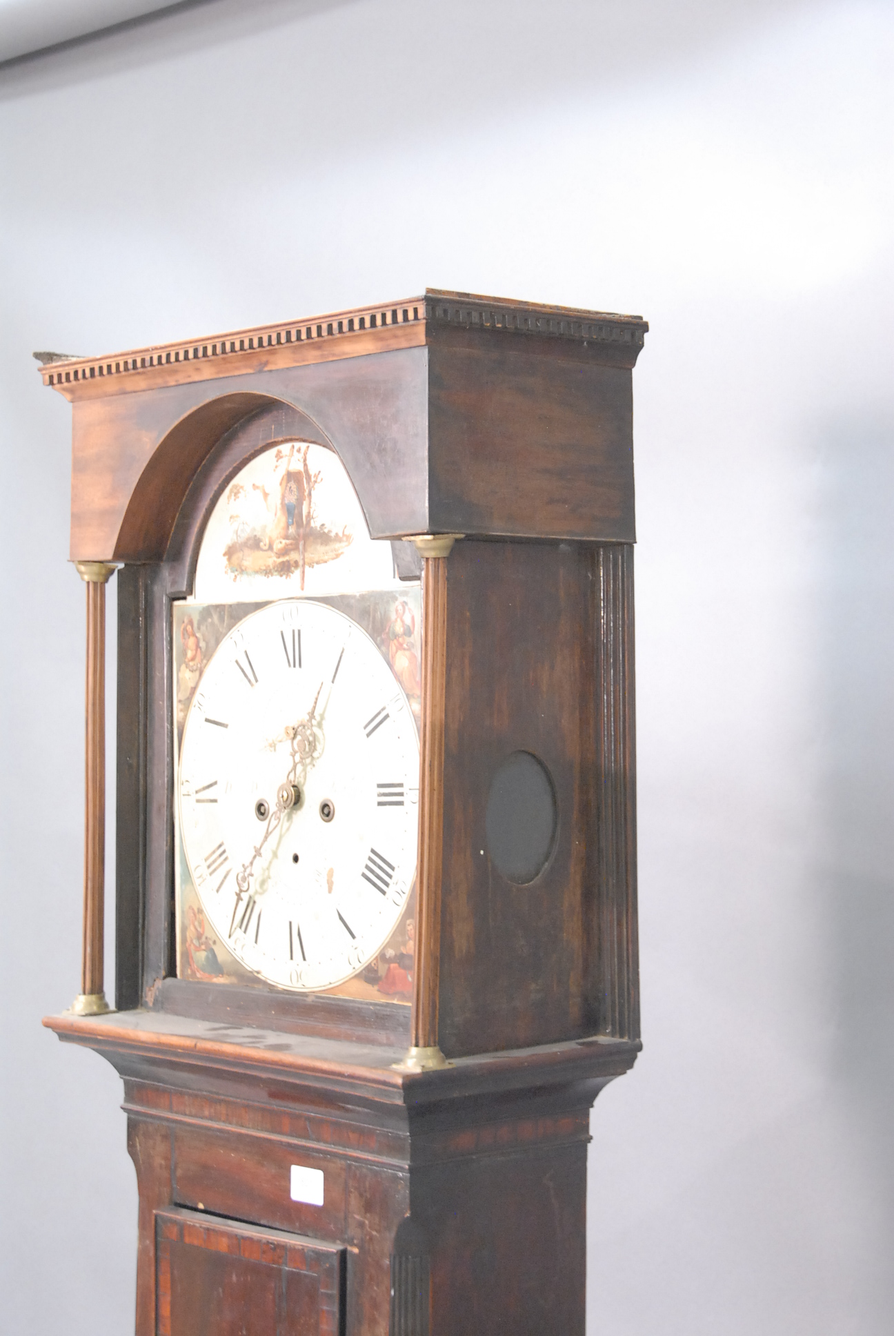 English mahogany tall clock with banded inlaid case, tombstone dial and brass works.