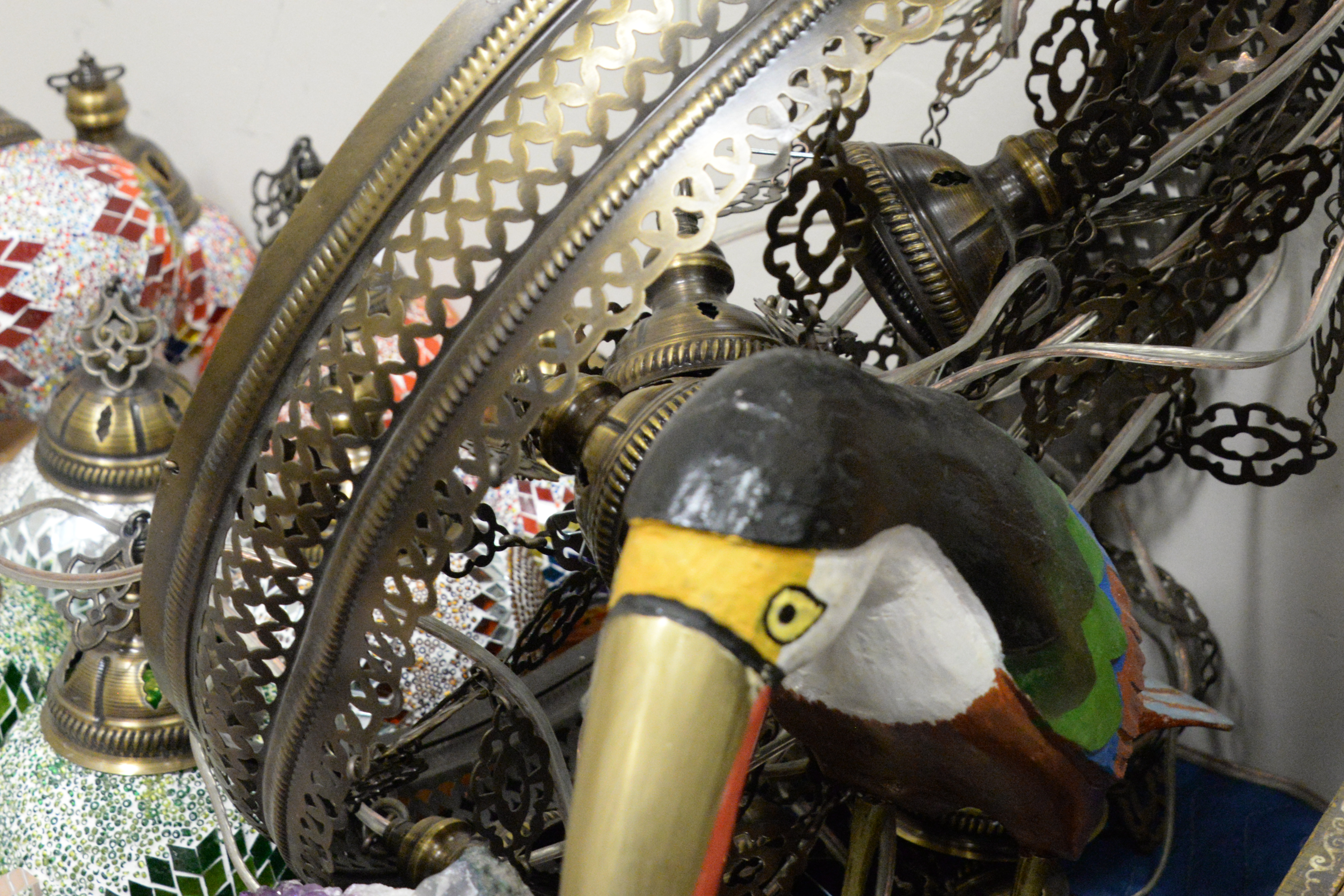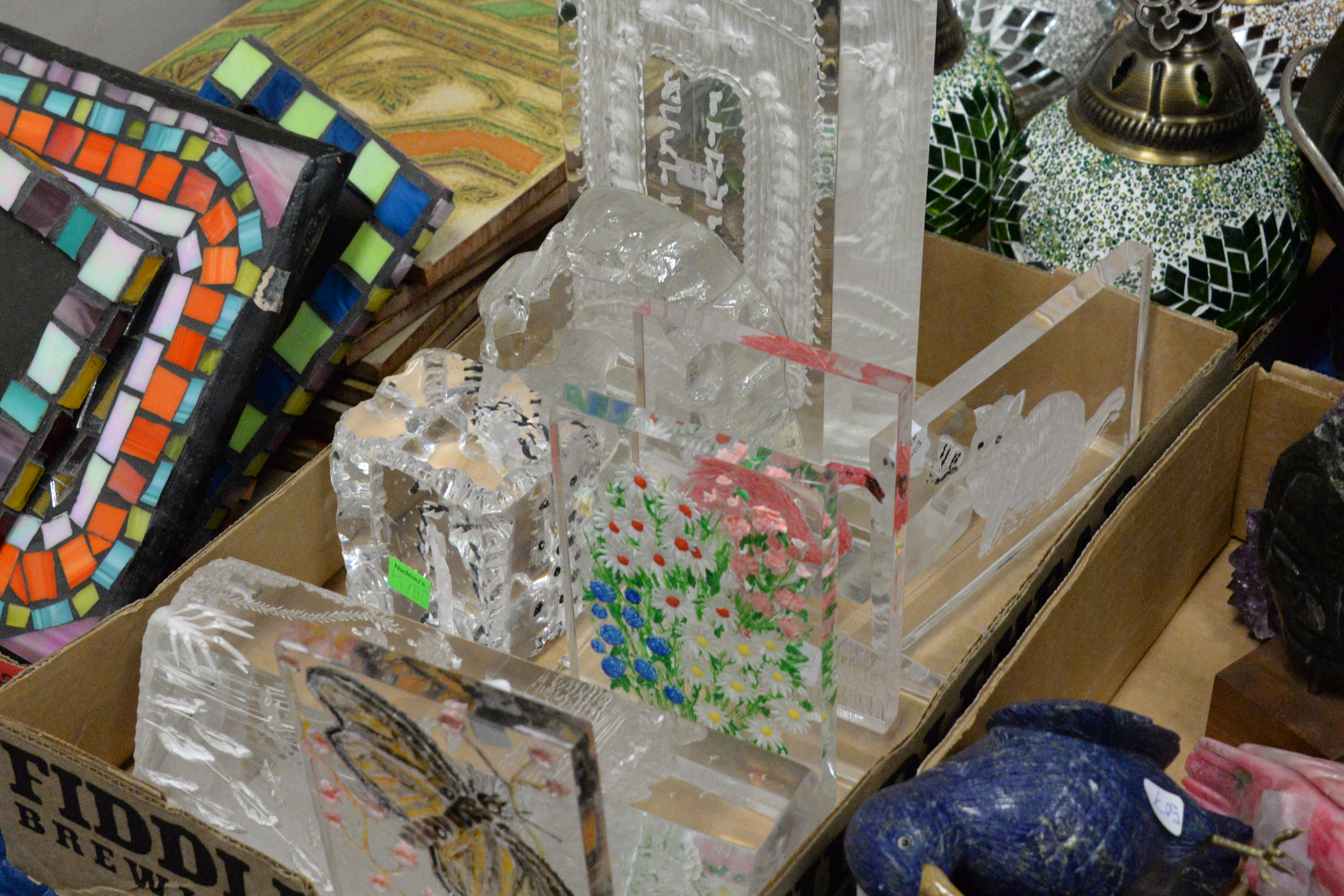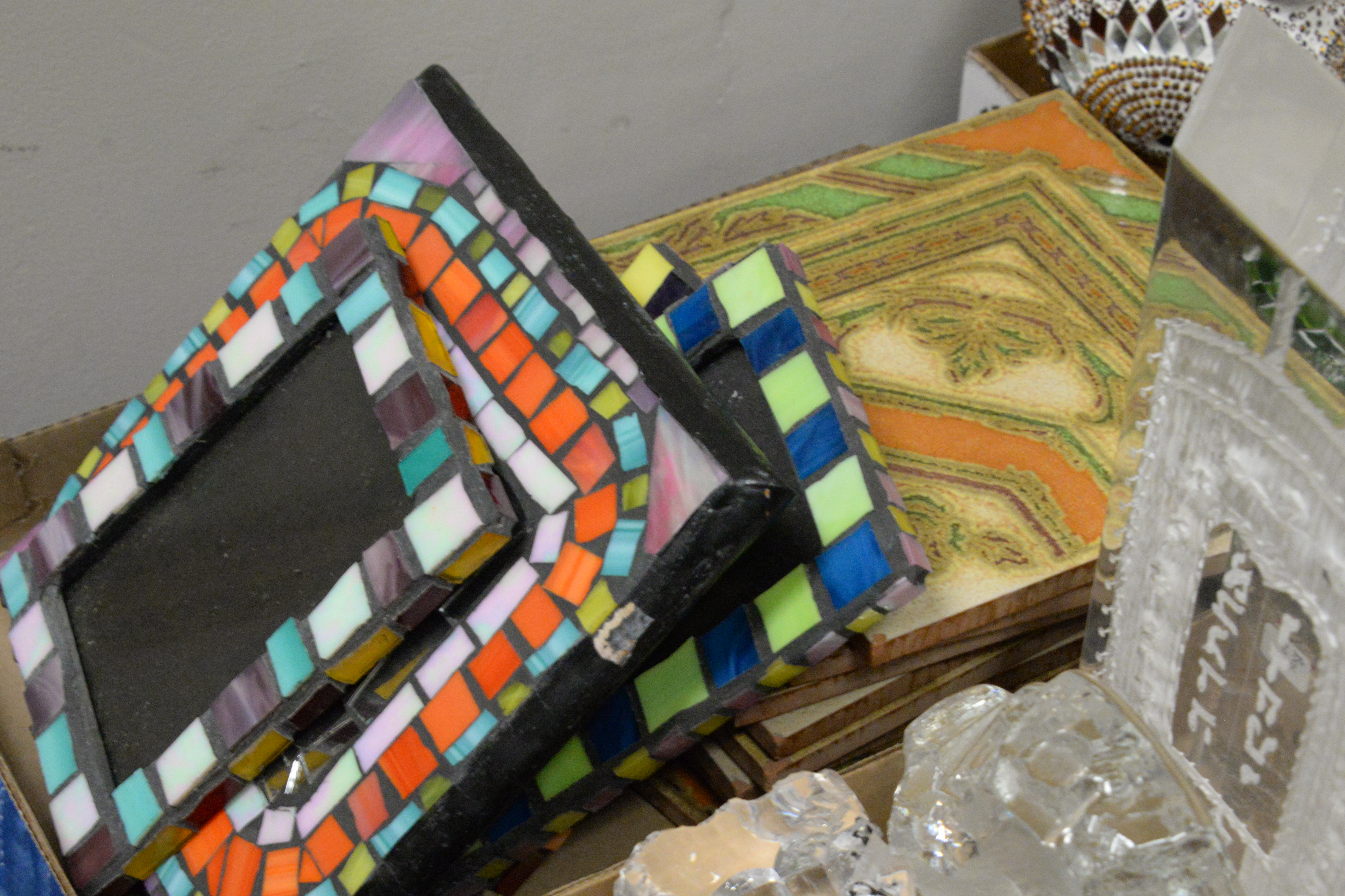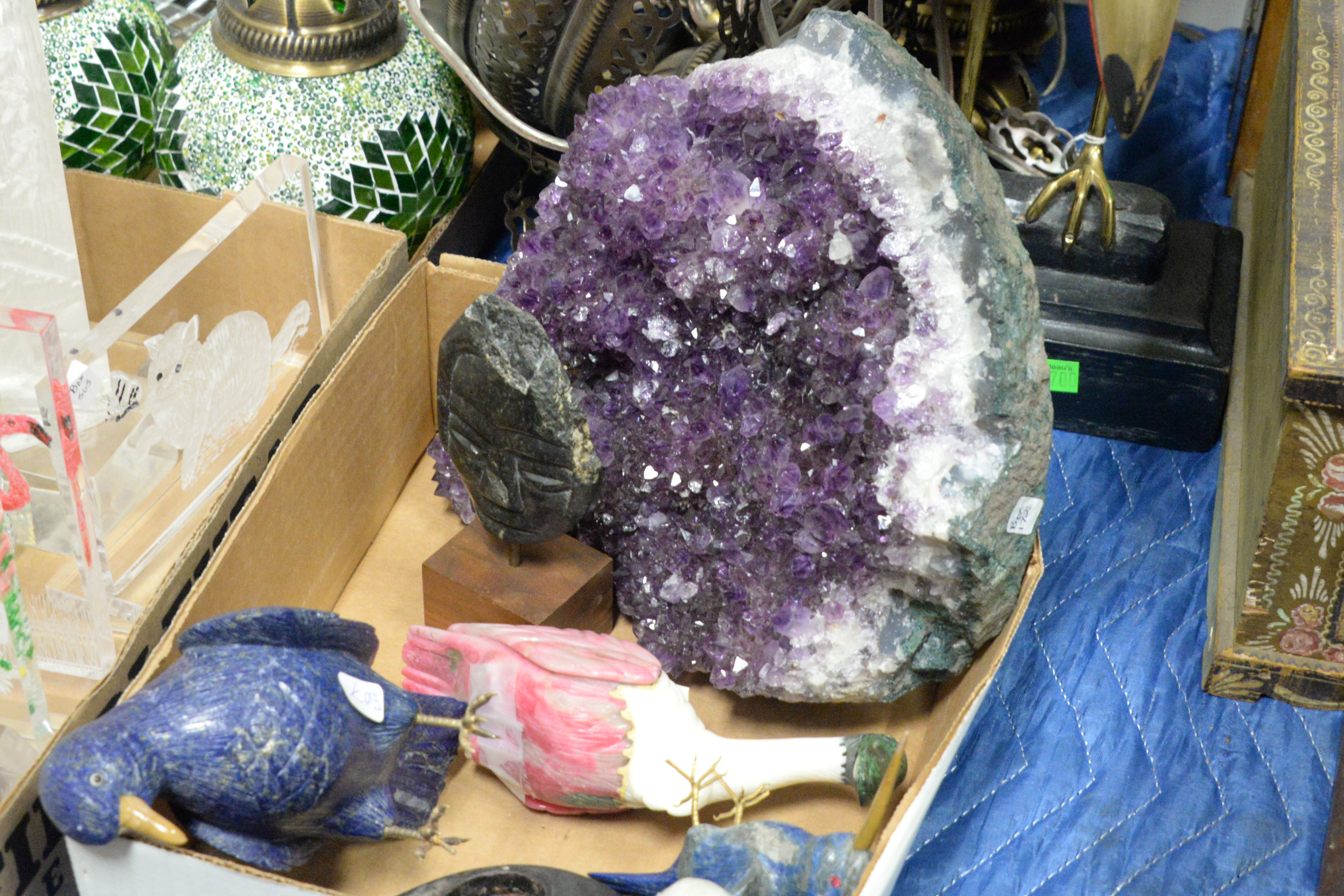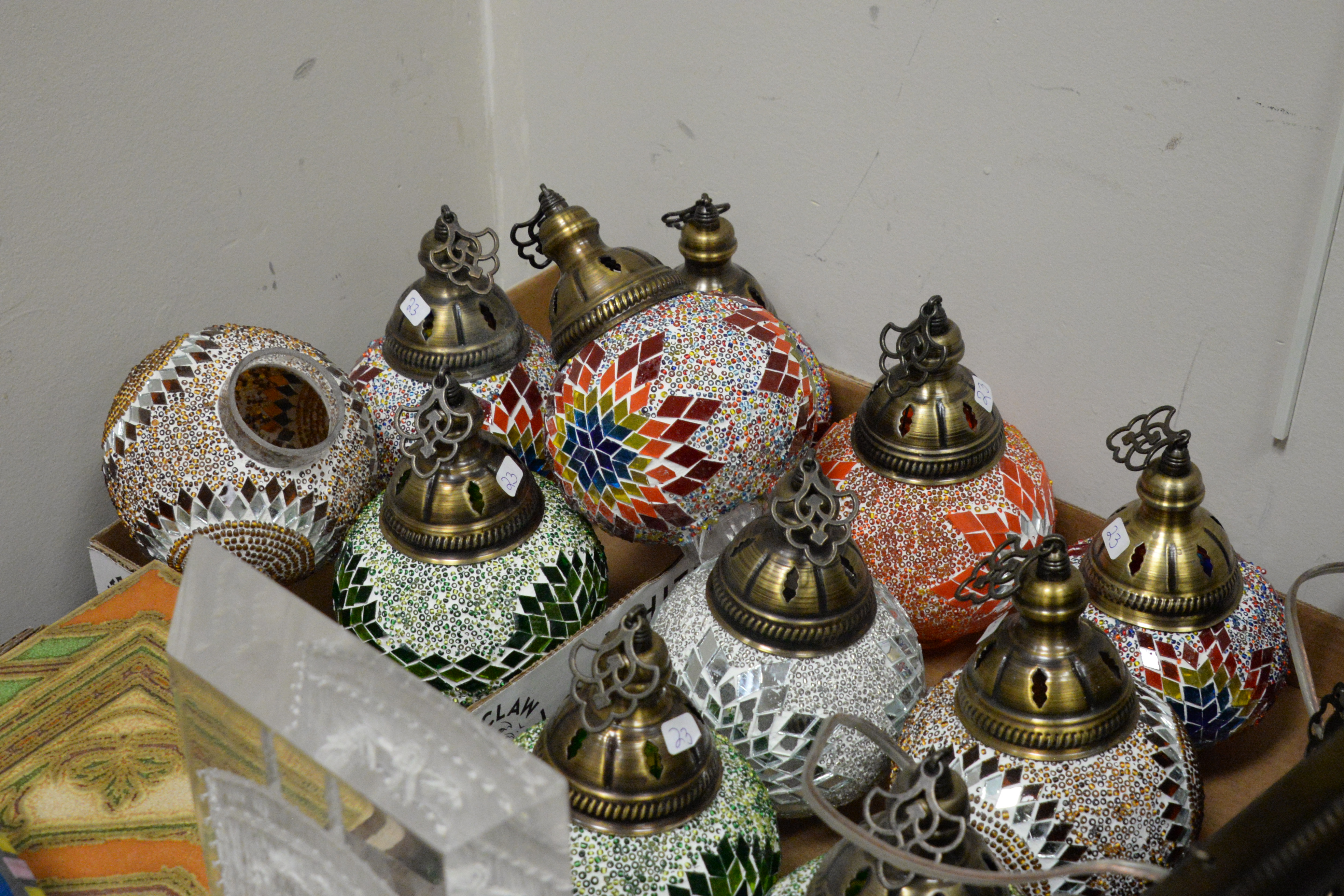 to include, set of eleven Turkish/Moroccan stained glass mosaic hanging lamp shades, glass and resin paperweights, mosaic frames, carved bird figures, amethyst geode.