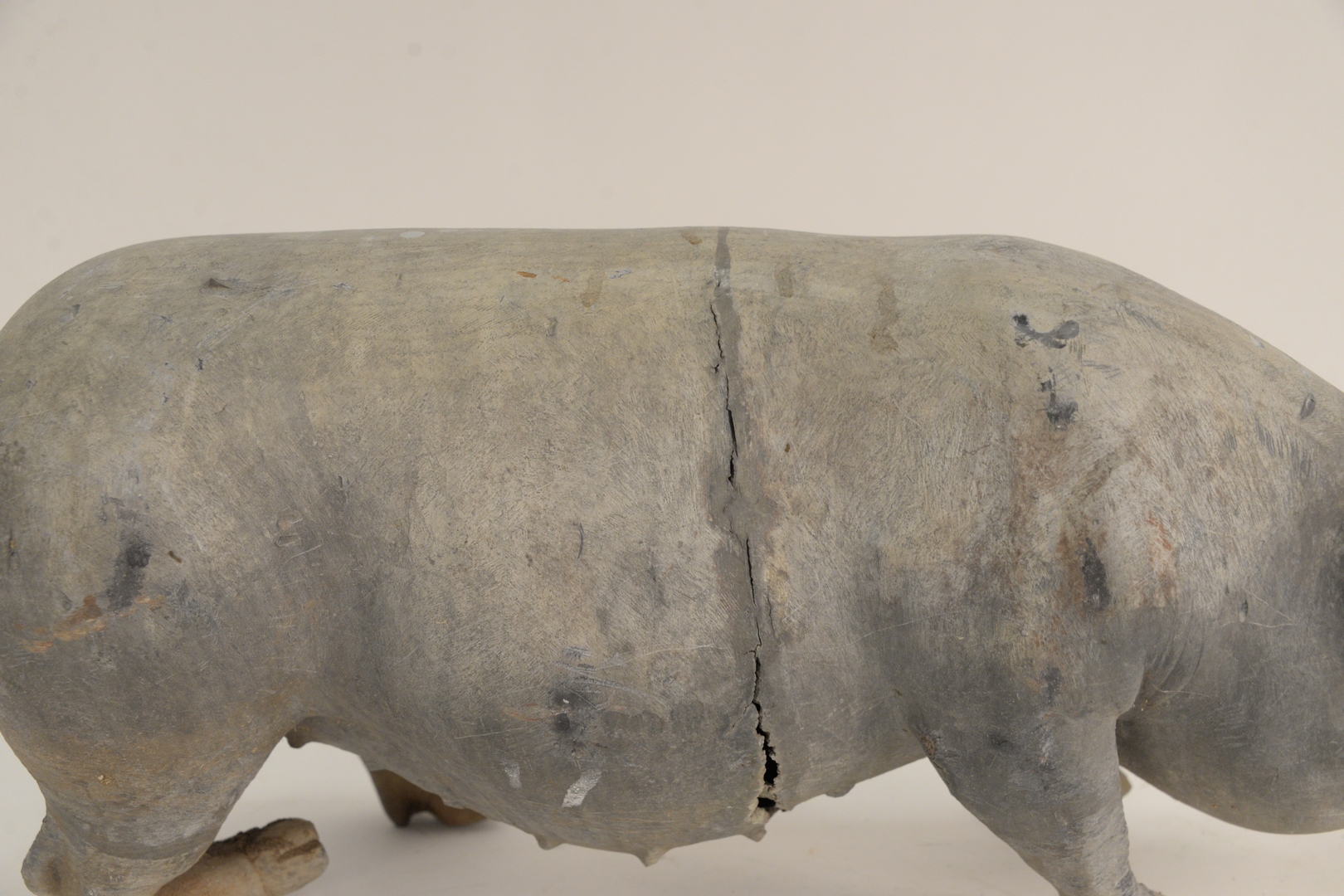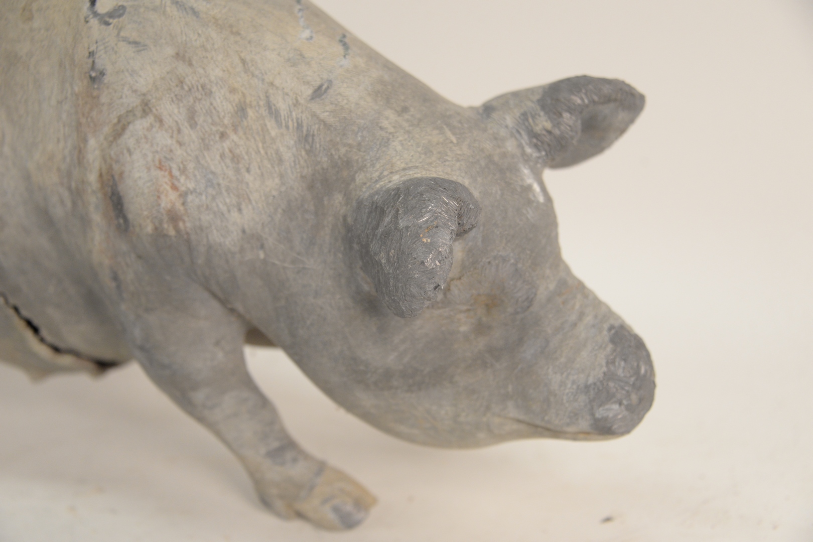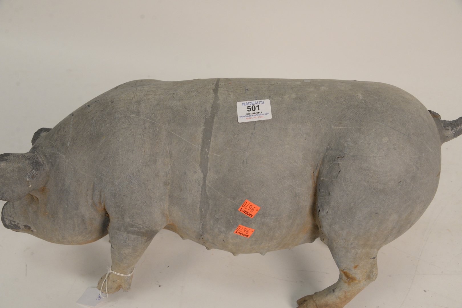 Lot 501: Large Lead Pig Garden Ornament, one leg bent, chewed ears, tail and nose, height 11 1/2 inches, length 24 1/2 inches. Provenance: The Estate of Diana Atwood Johnson.