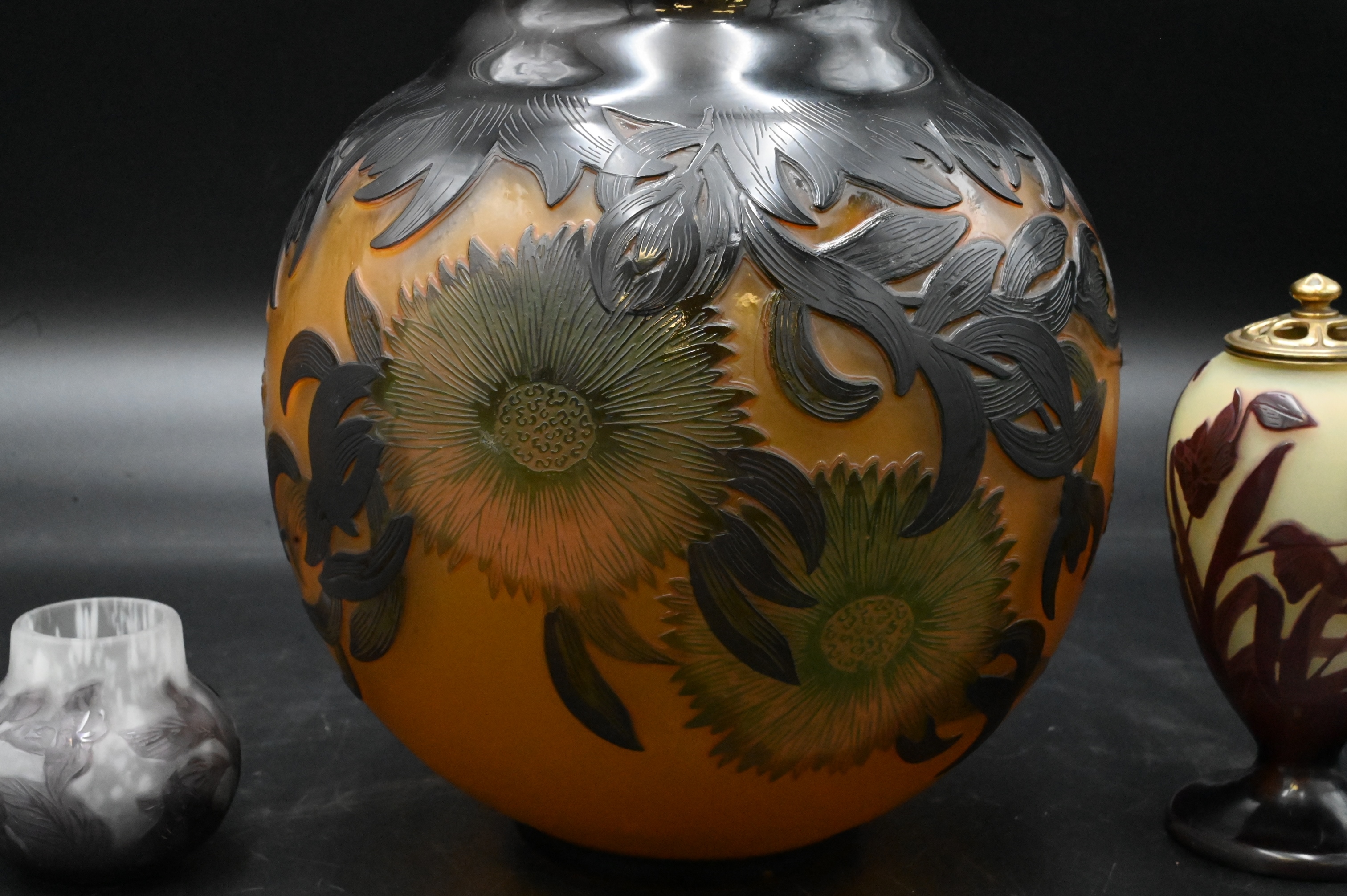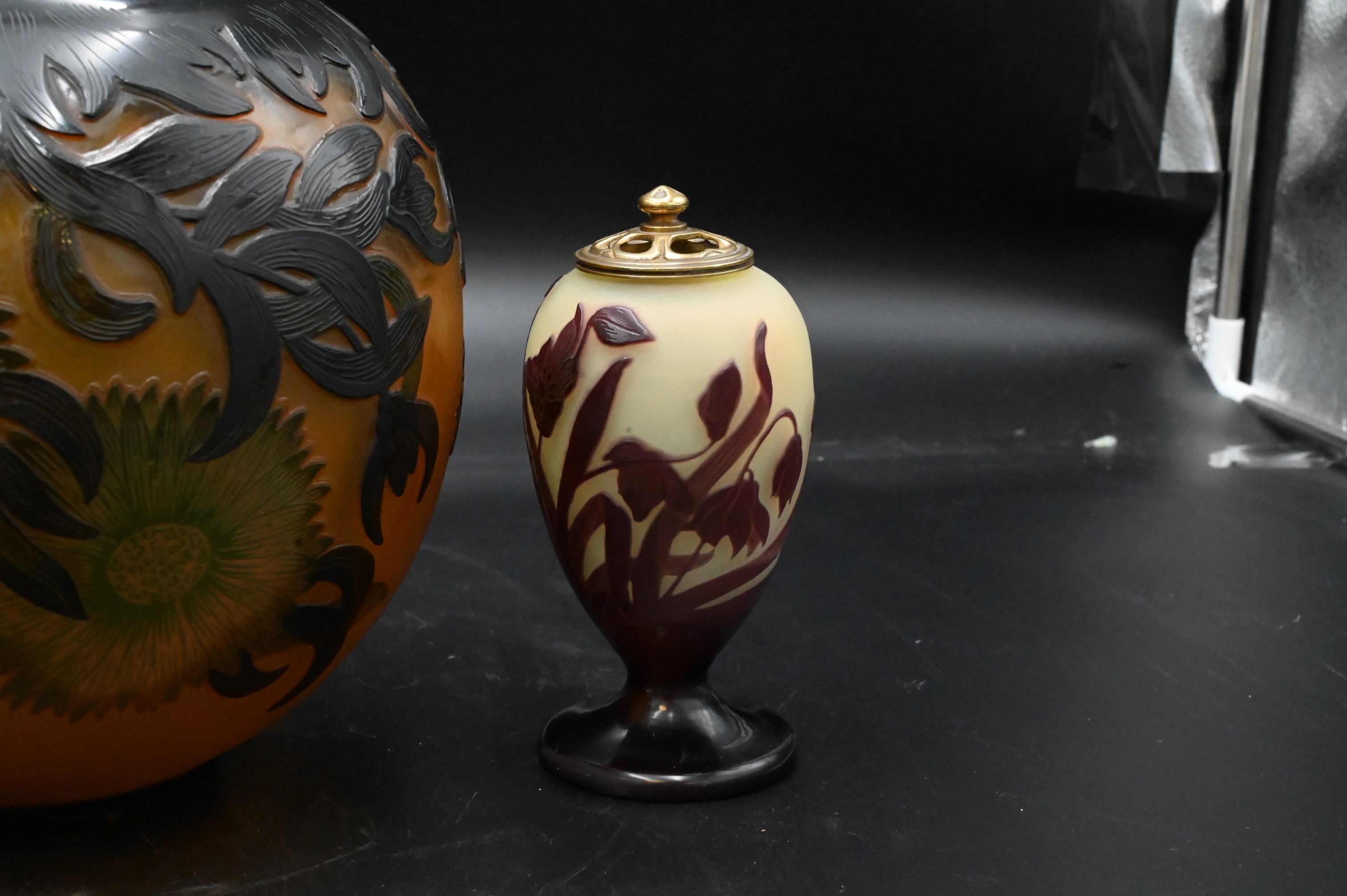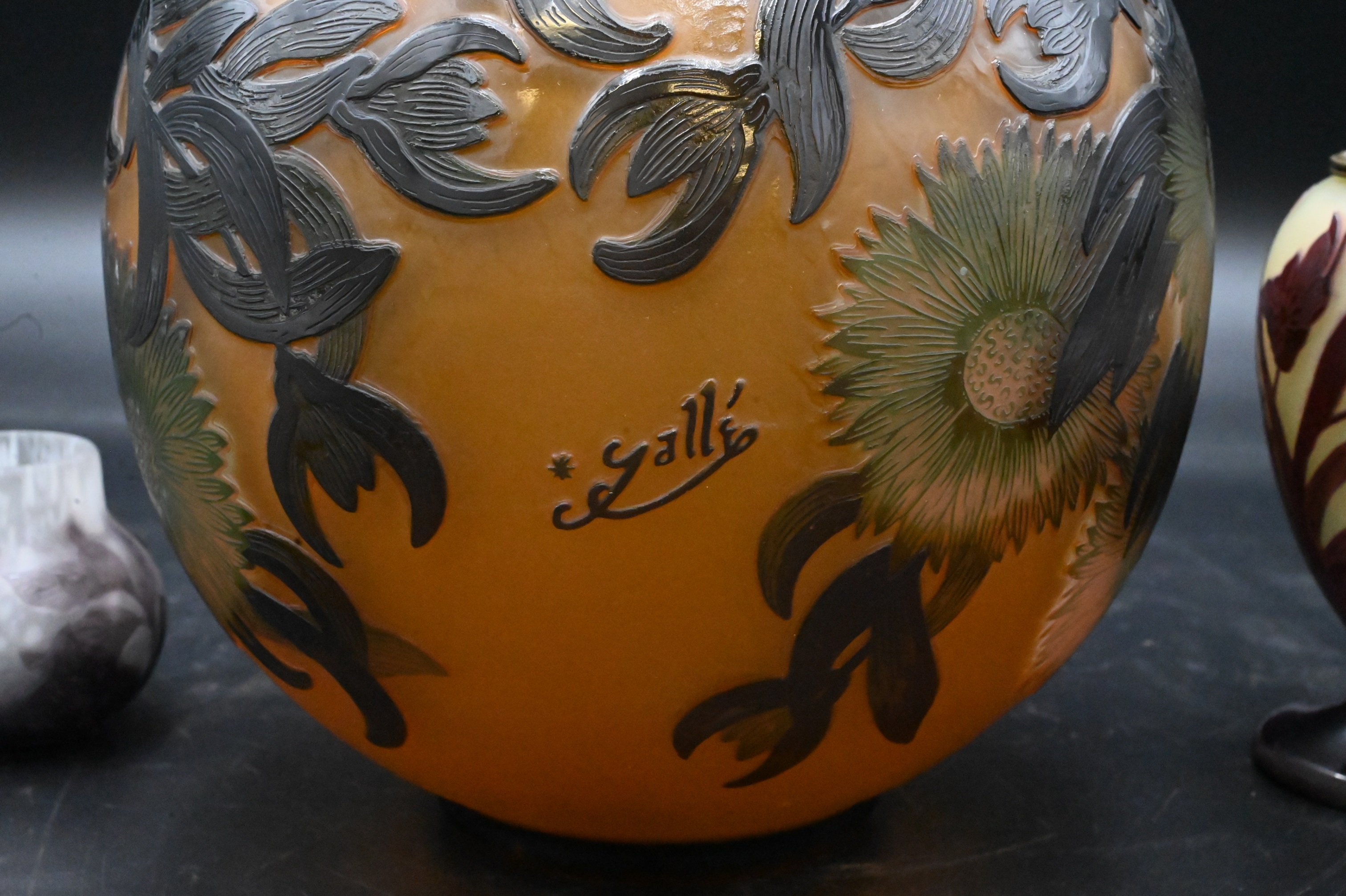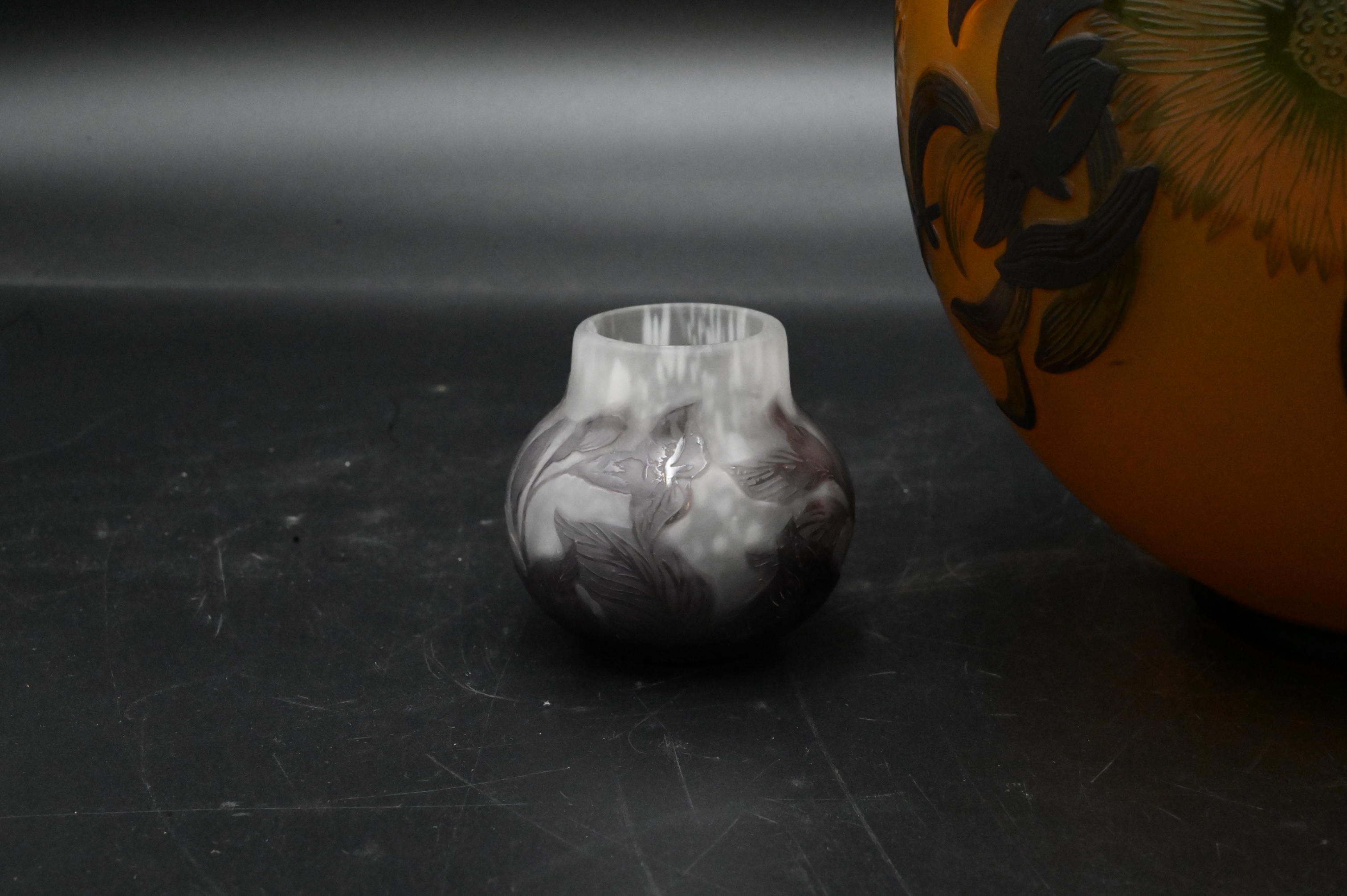 Three Galle Style Pieces, including etched glass globular flower vase – height 8 3/4 inches, small bud vase, along with an incense vase, marked Galle.