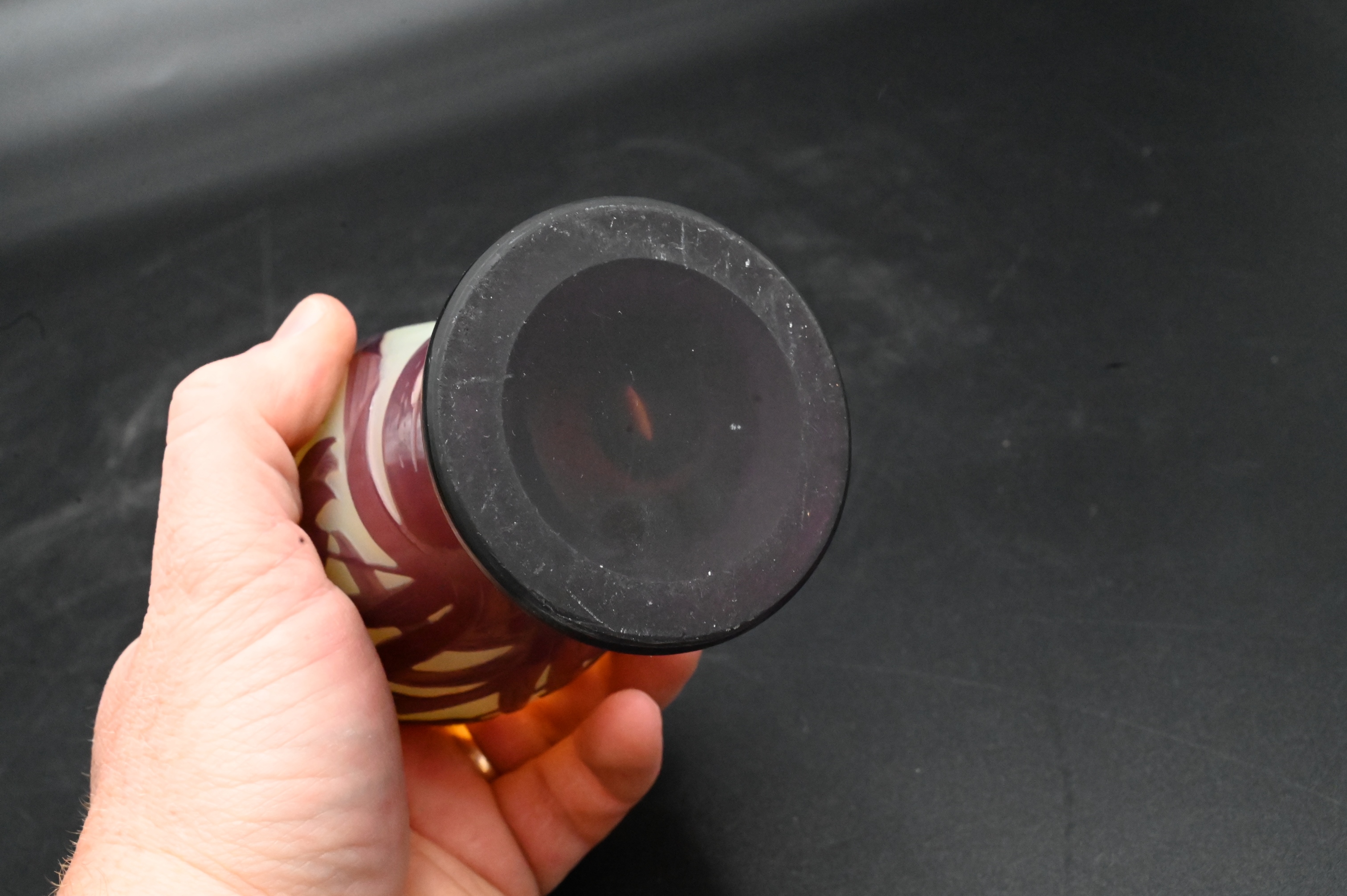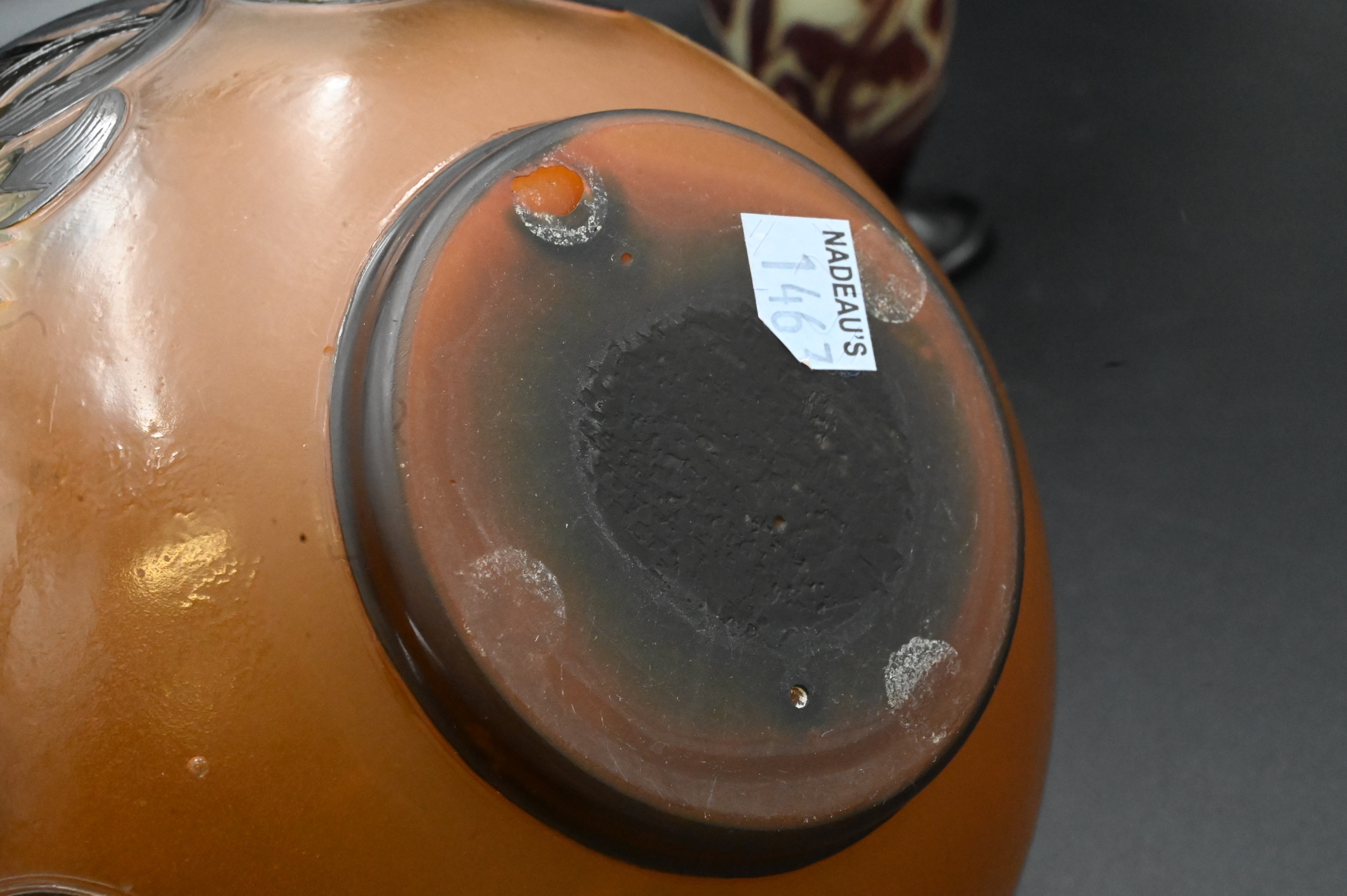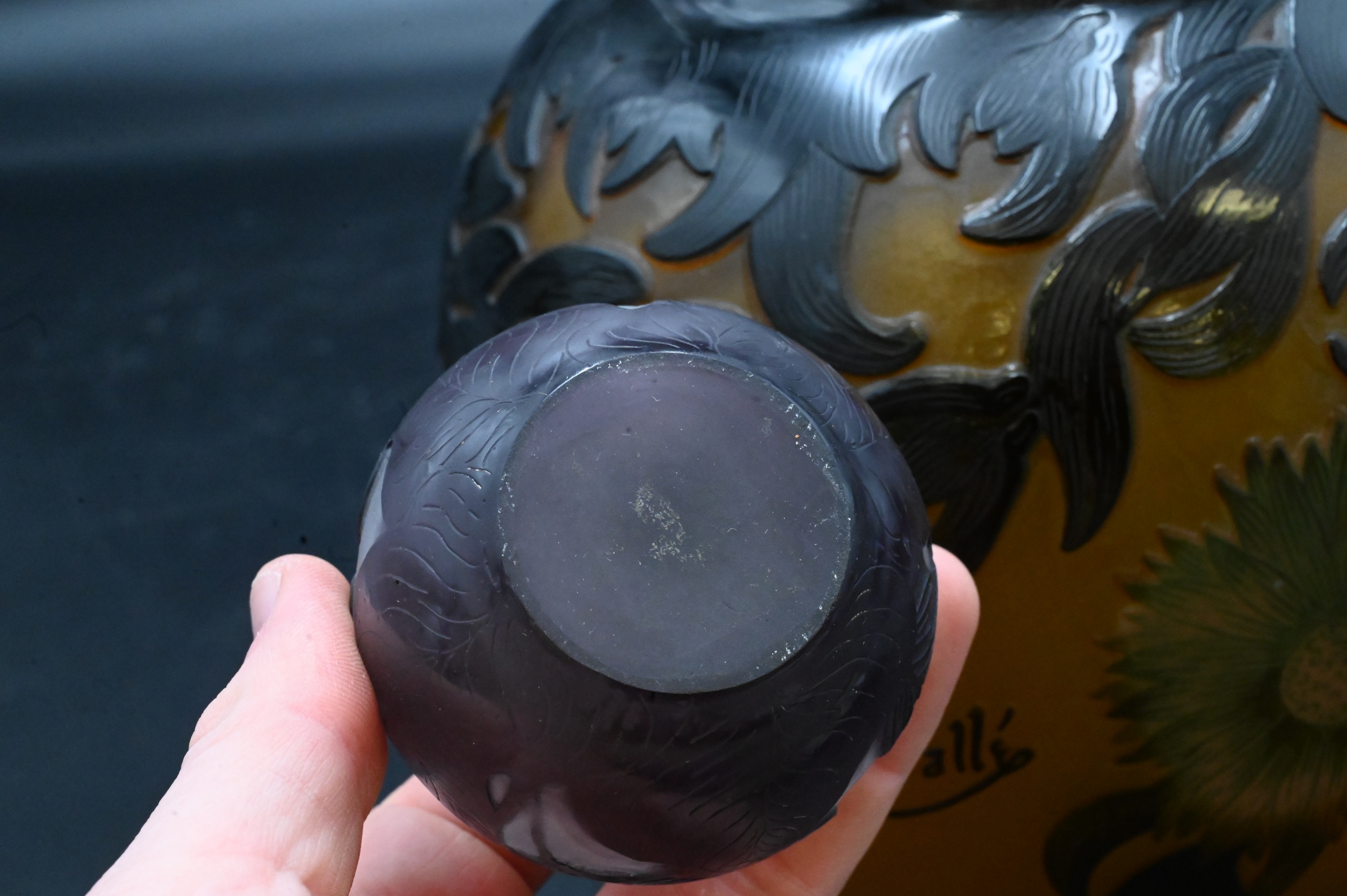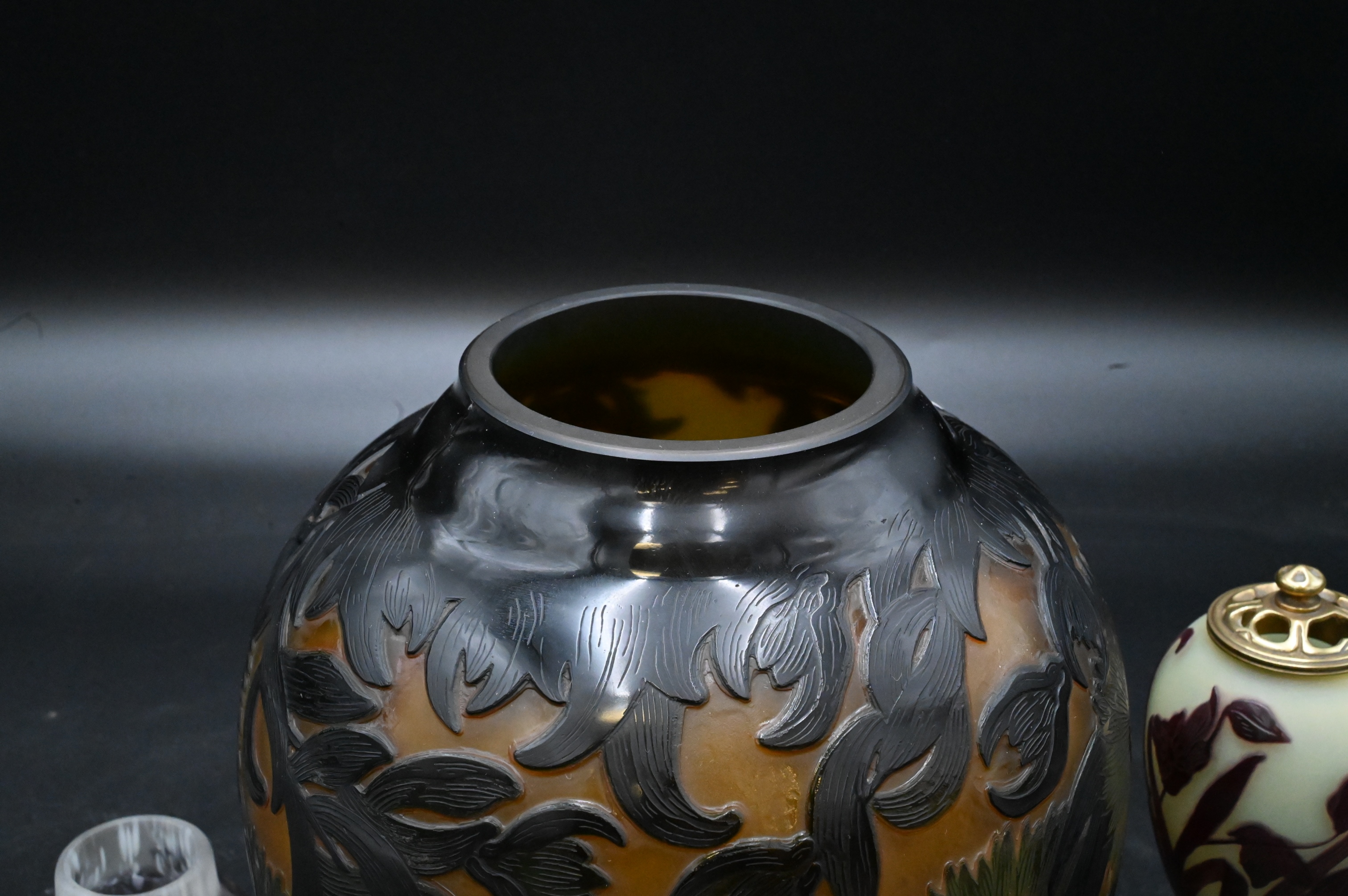 Three Galle Style Pieces, including etched glass globular flower vase – height 8 3/4 inches, small bud vase, along with an incense vase, marked Galle.