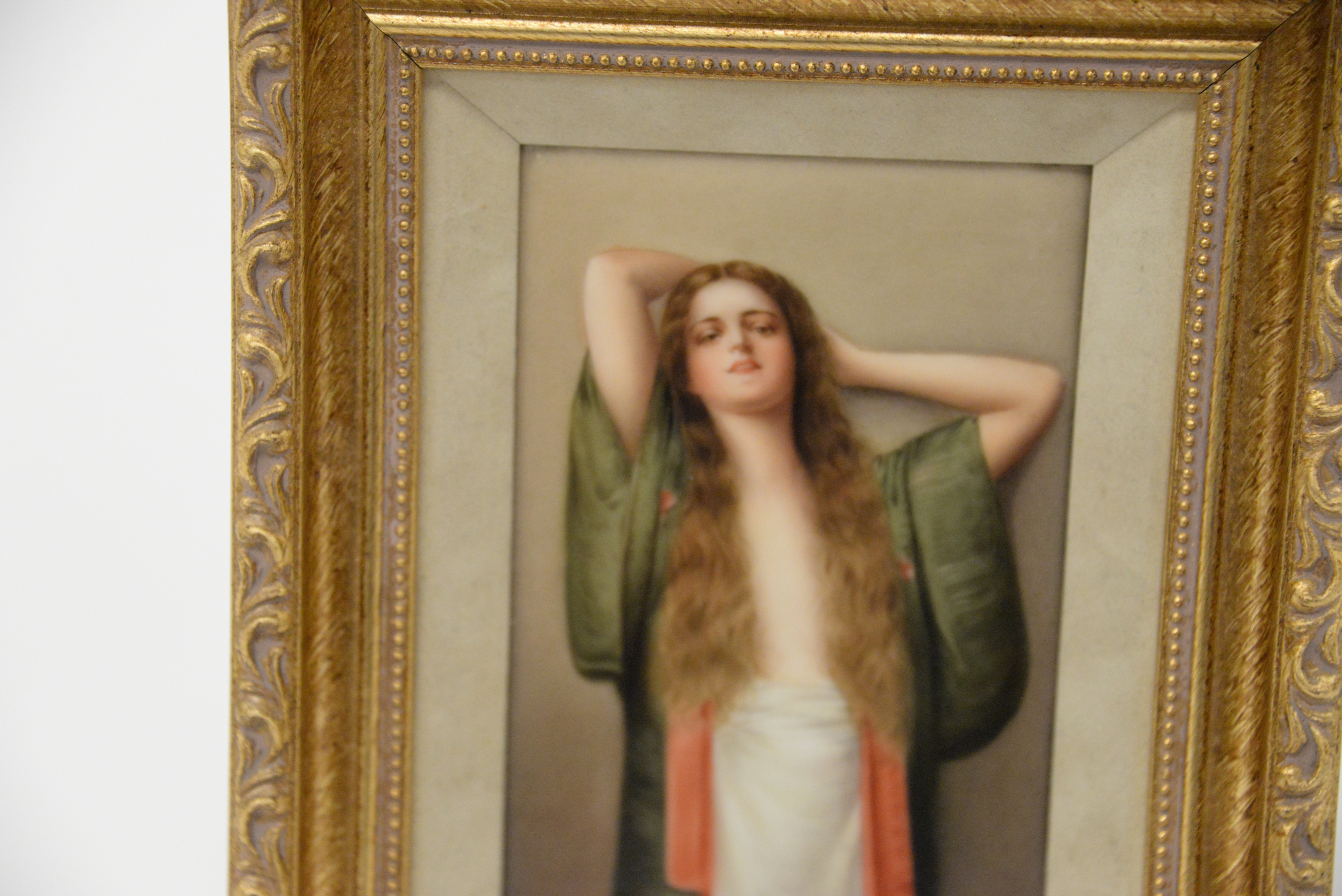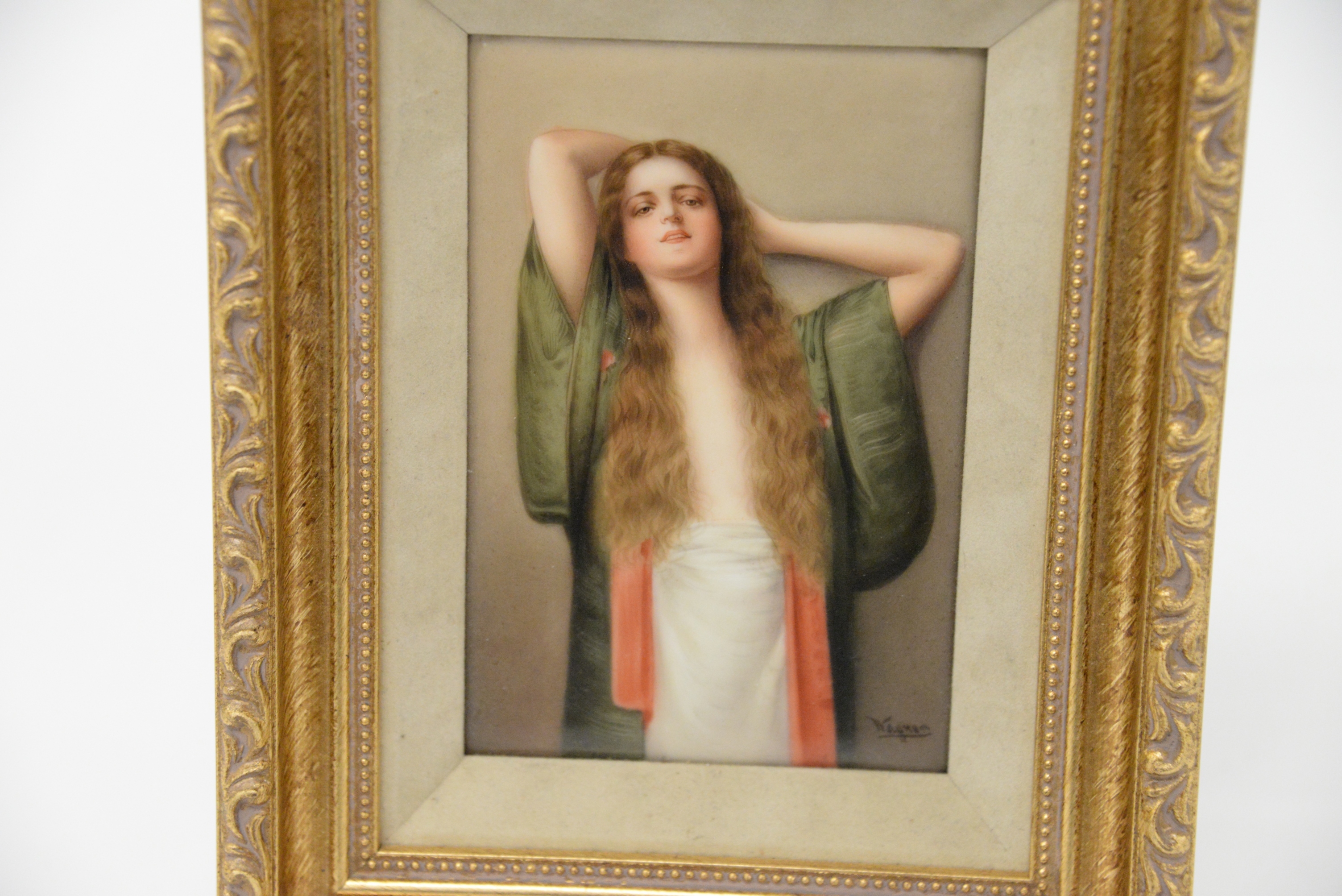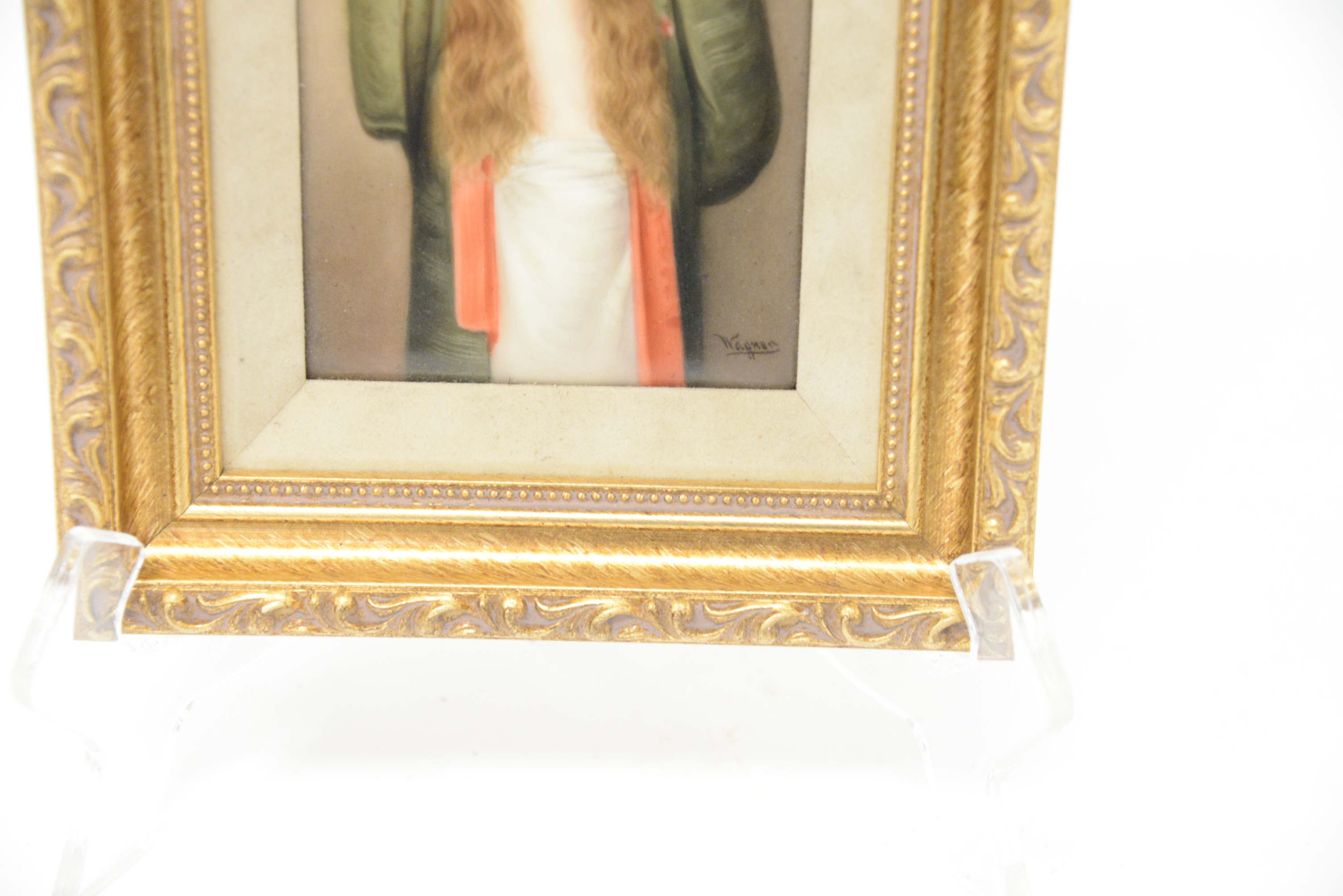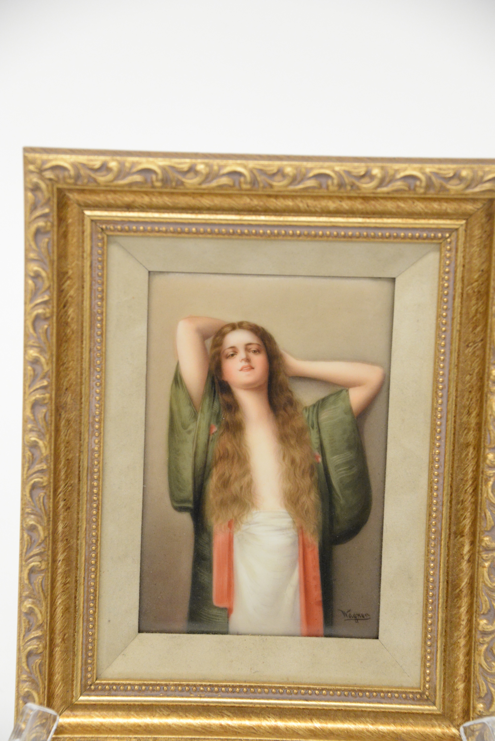 Wagner German Porcelain Hand Painted Plaque, girl with long hair, partially clad, signed, “Wagner”, lower right, 6 1/4″ x 4 1/4″.