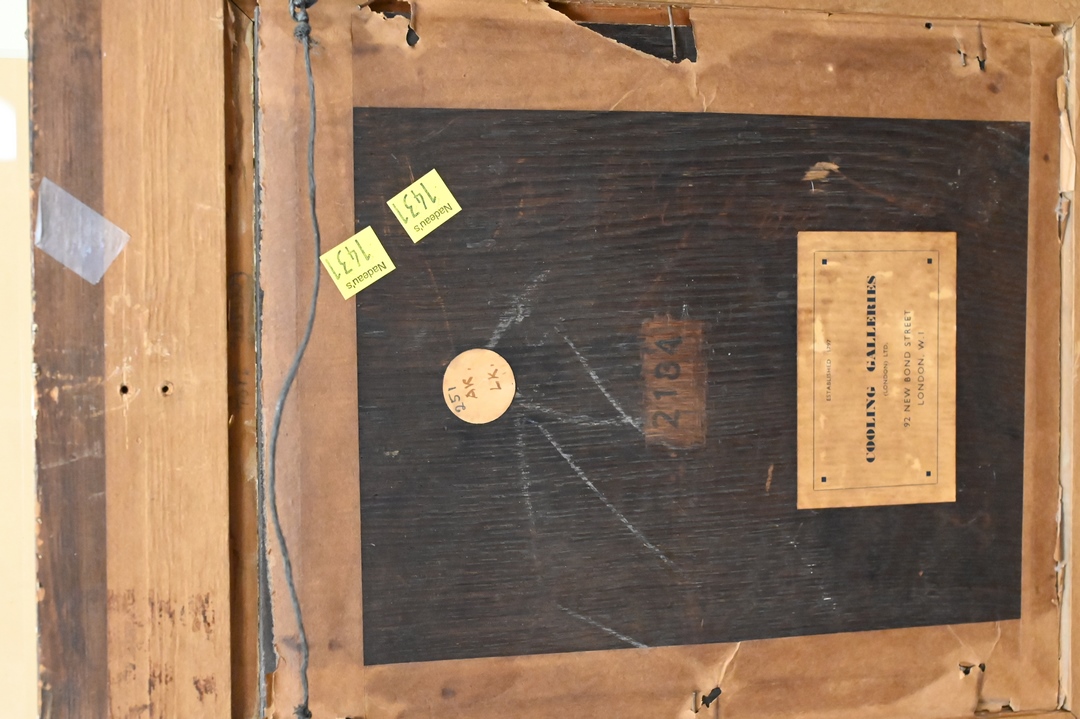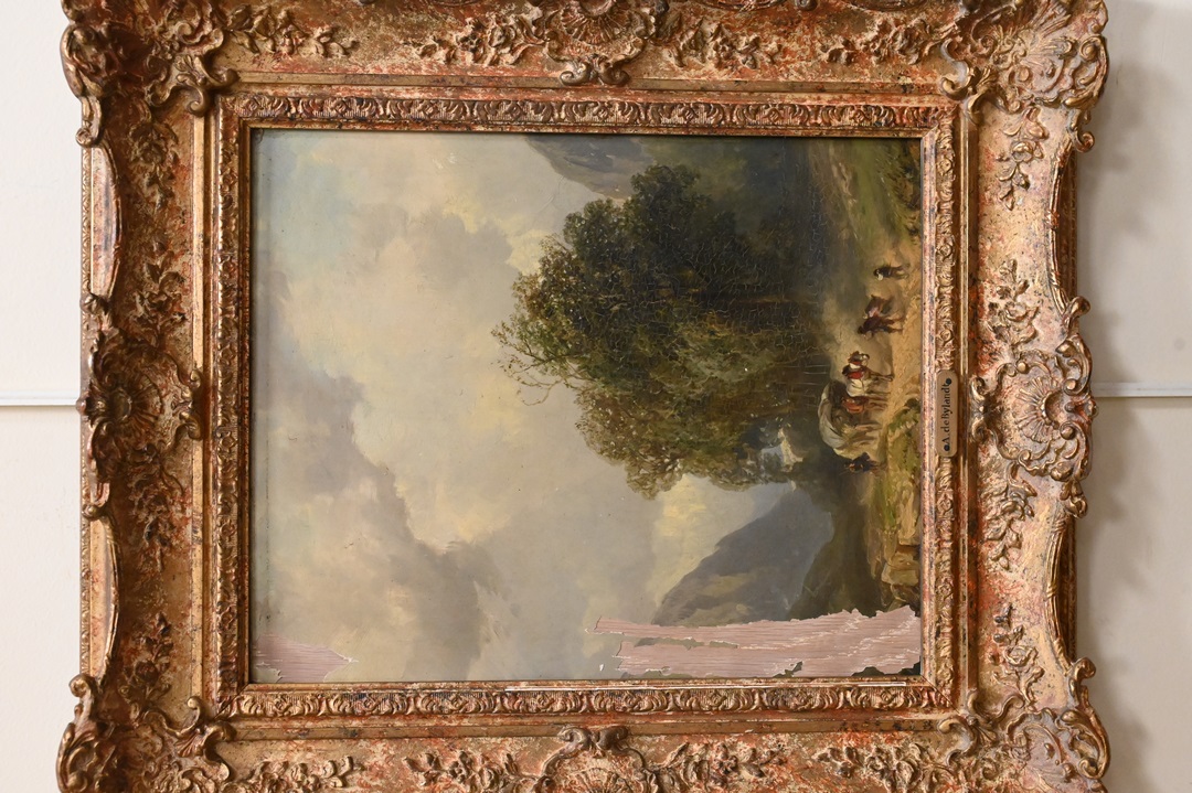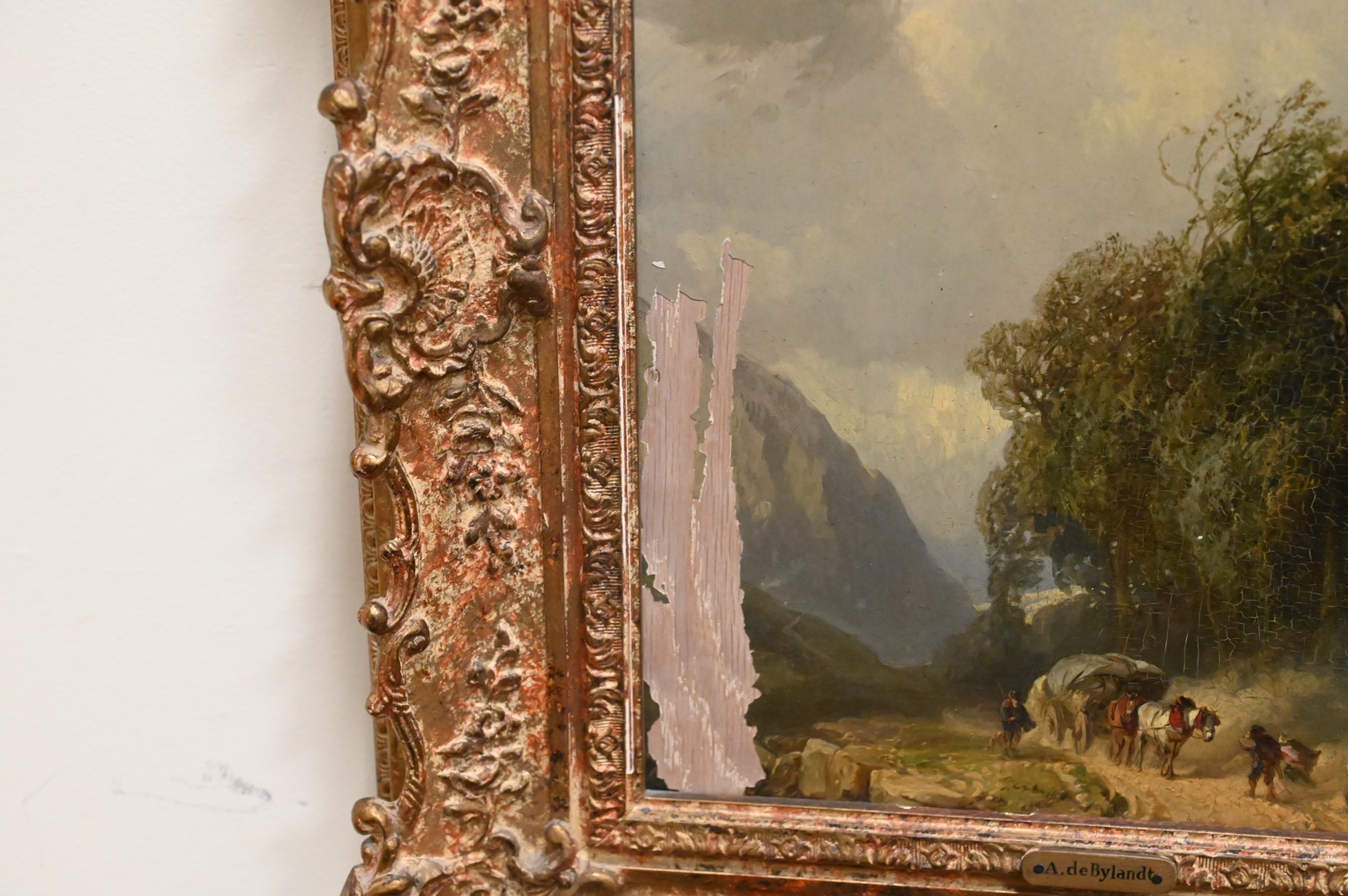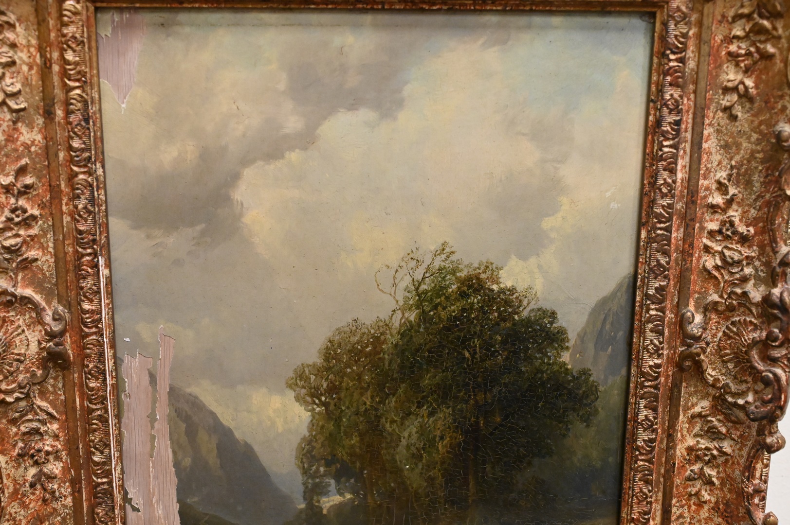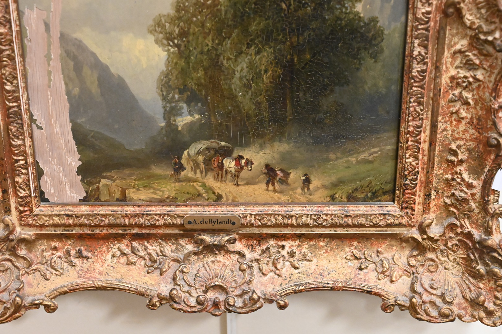 Alfred Bylandt (1829 – 1890), oil on board, trail through mountains, Cooley Galleries label on back, 11 1/2″ x 9 1/4″.