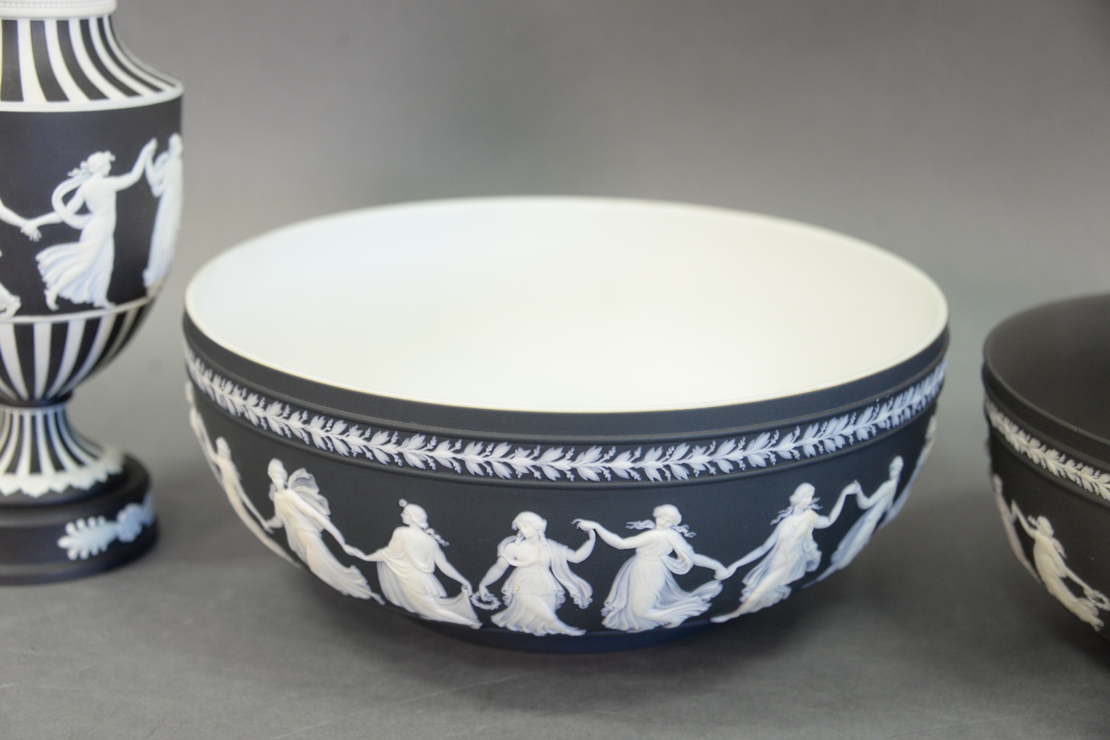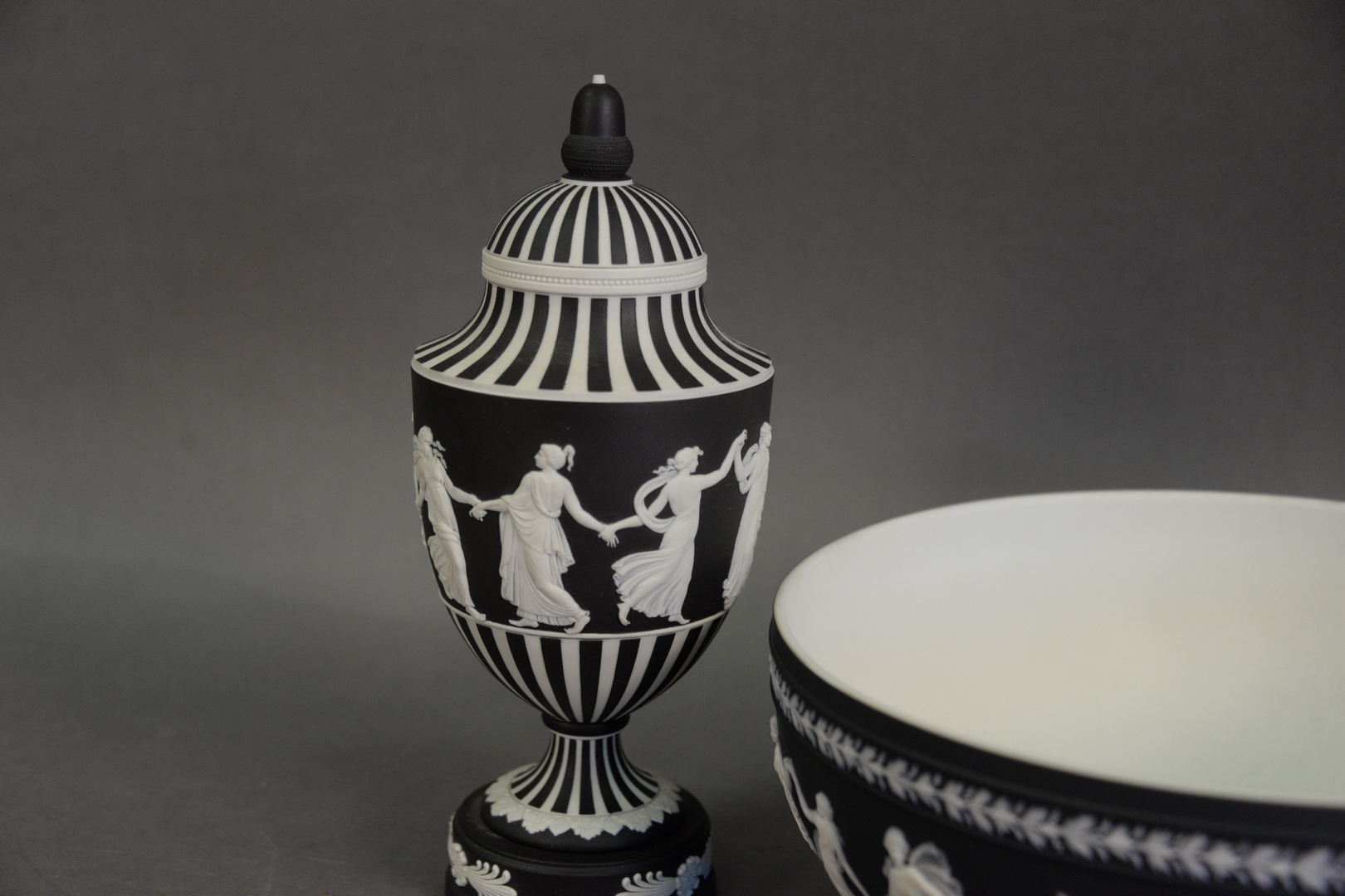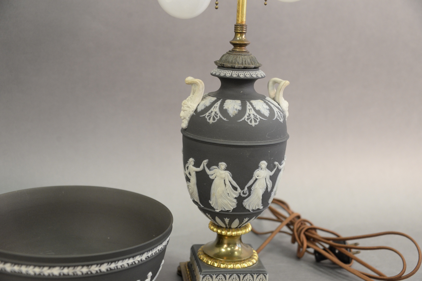 Lot 502: Four Piece Group of Wedgwood Jasperware, to include black and white urns with mask handles made into table lamps, covered dip urn and two large bowls, all having dancing maidens, lamp height 19 inches. Provenance: Estate of James Wadhams