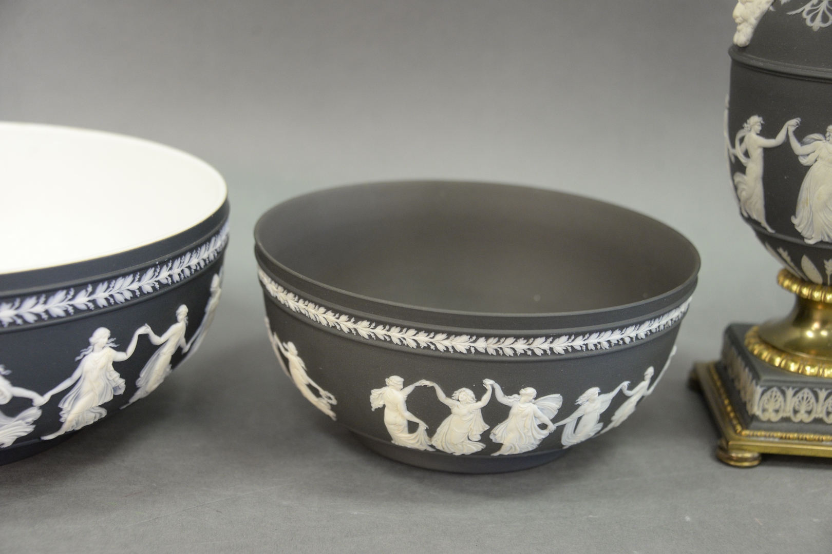 Four Piece Group of Wedgwood Jasperware, to include black and white urns with mask handles made into table lamps, covered dip urn and two large bowls, all having dancing maidens, lamp height 19 inches. Provenance: Estate of James Wadhams