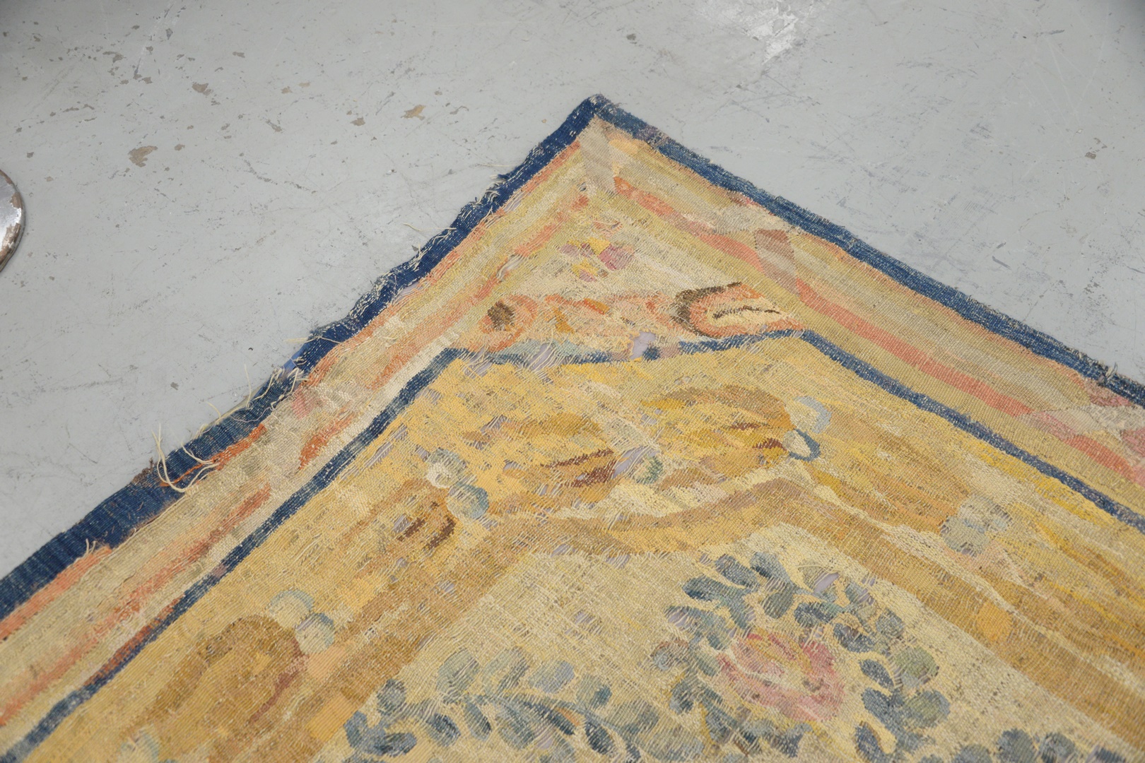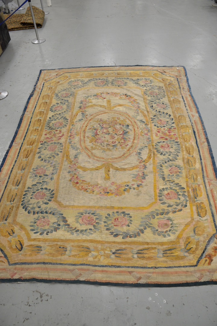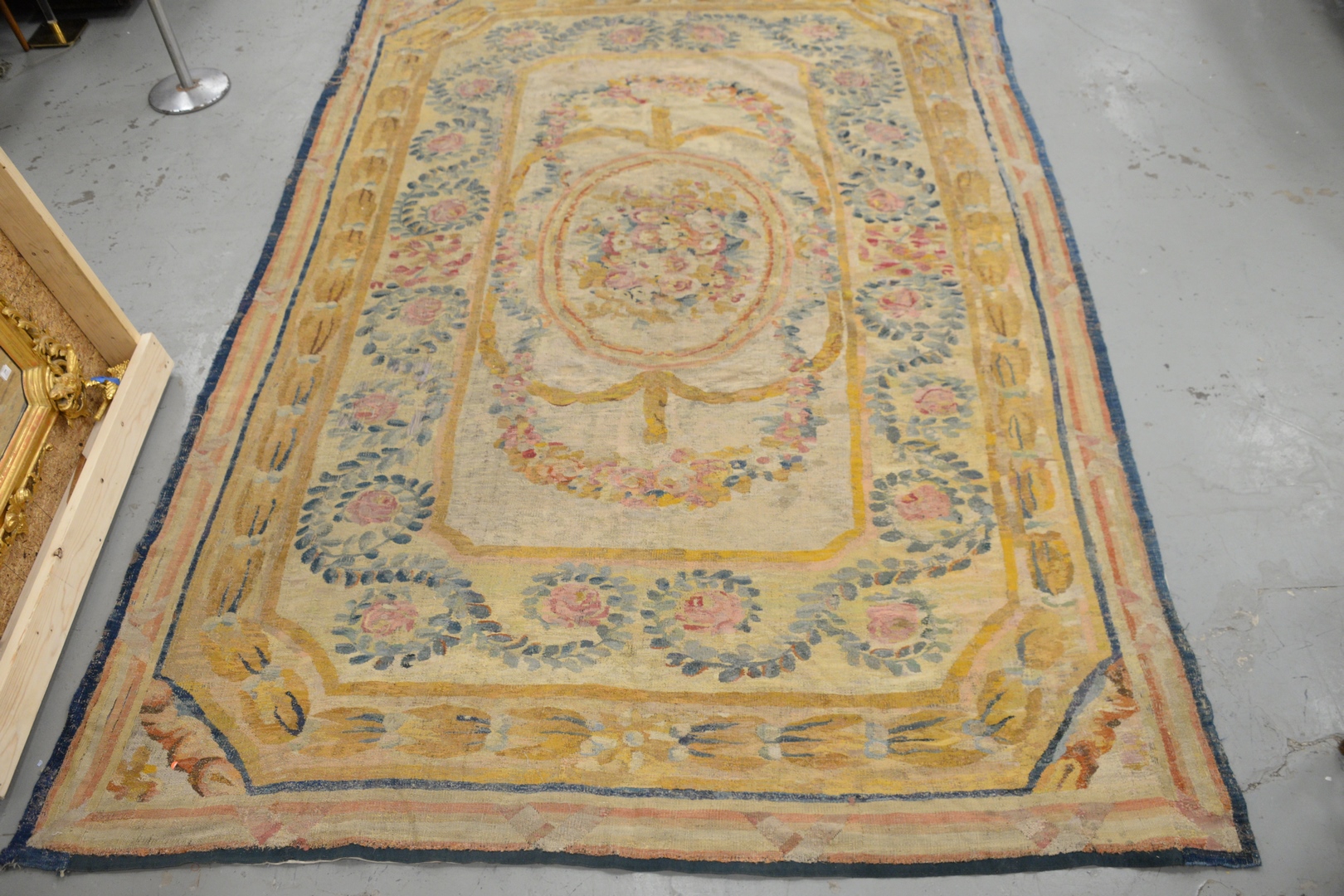 Lot 502: French Aubusson Carpet having central floral design and floral borders, bordered by lines probably 18th century backed, very worn, …