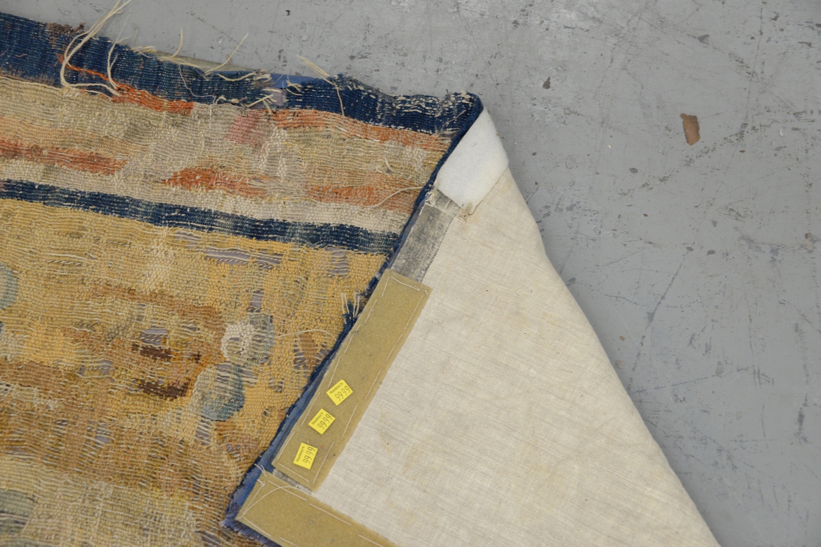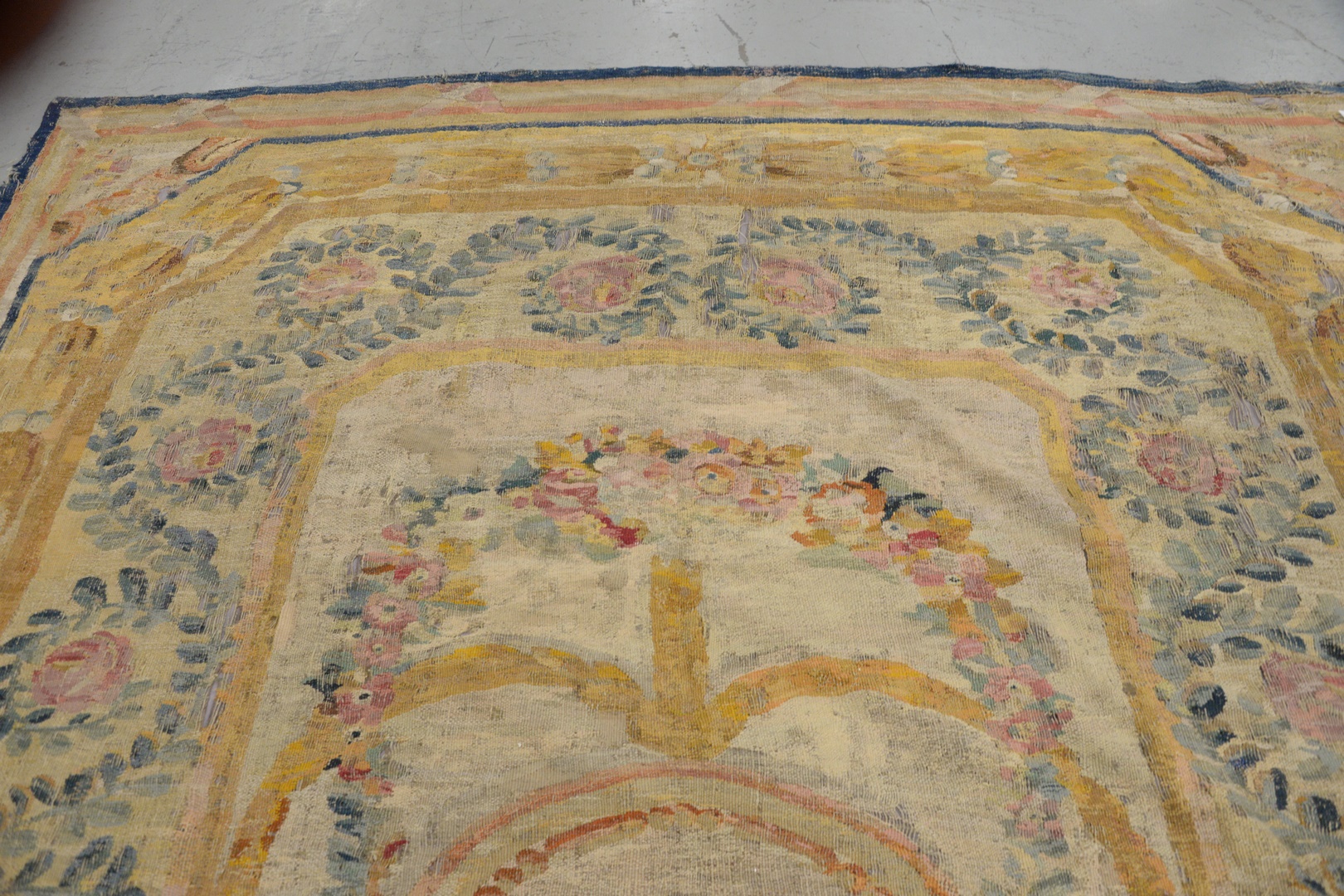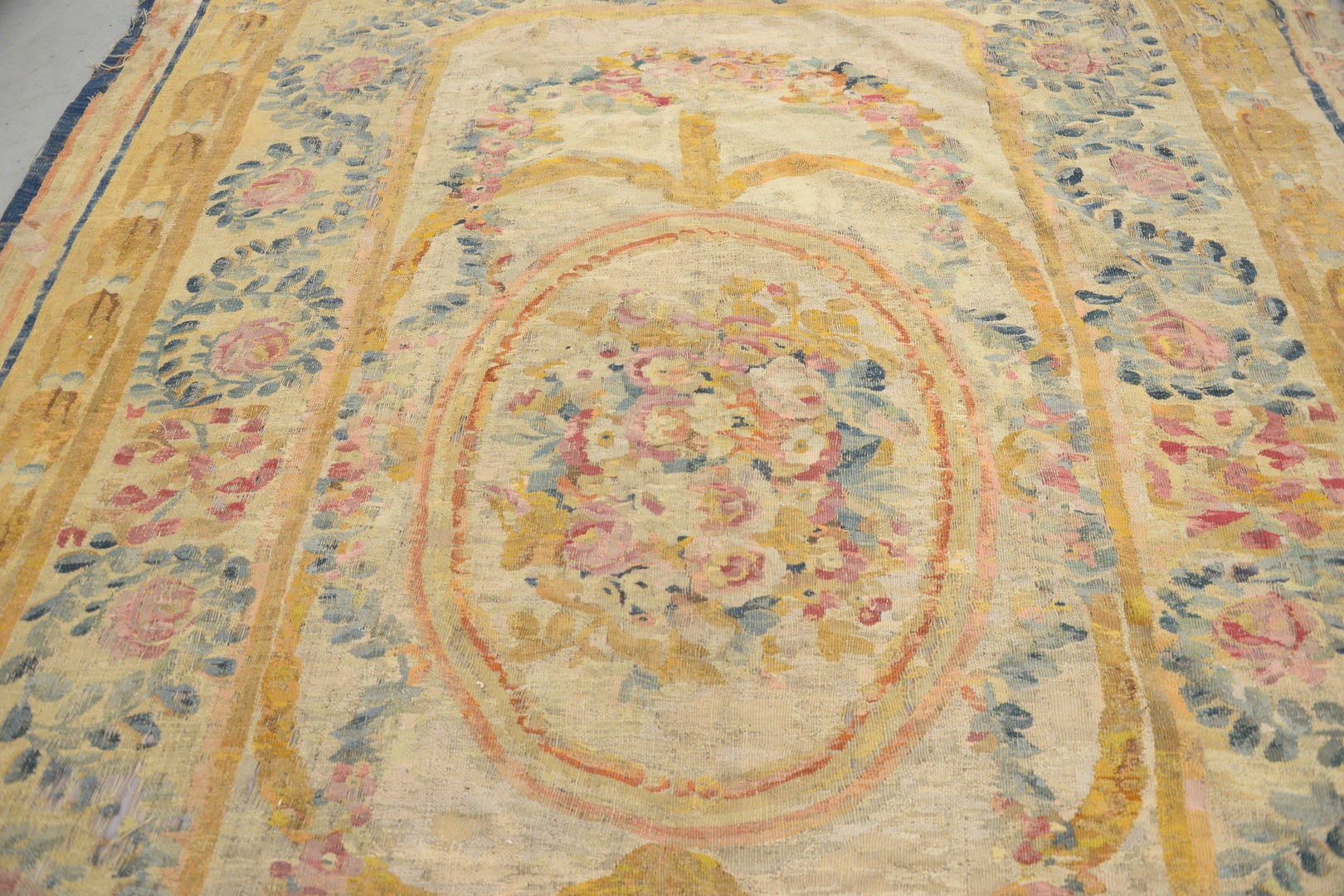 Lot 502: French Aubusson Carpet having central floral design and floral borders, bordered by lines probably 18th century backed, very worn, …