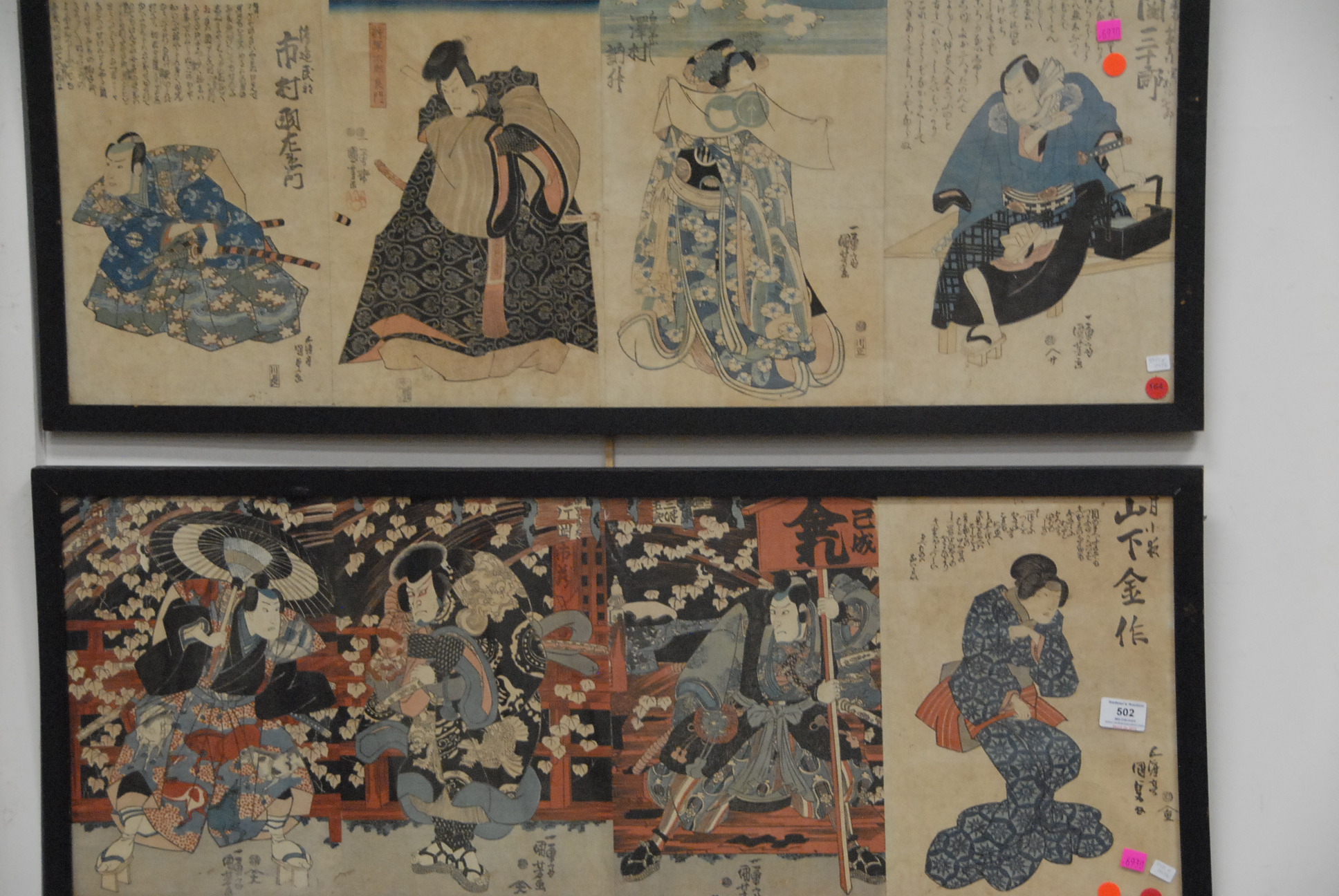 Lot 502: Group of four framed sets of woodblock prints to include several by Kuniyoshi 1797-1861 depicting man in a garden, Kuniyoshi triptych depicting Kabuki actors, three singles by Kuniyoshi depicting famous actors and several Kunisada 1786-1864 incl