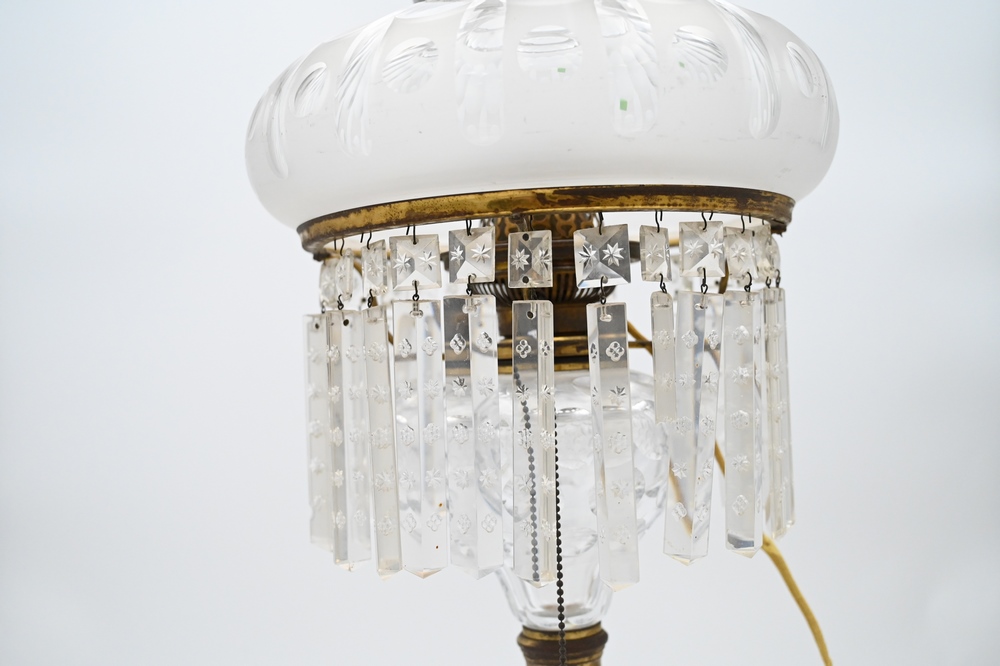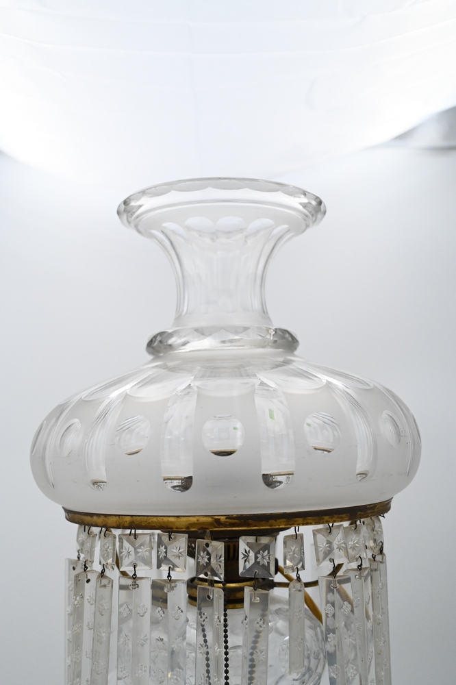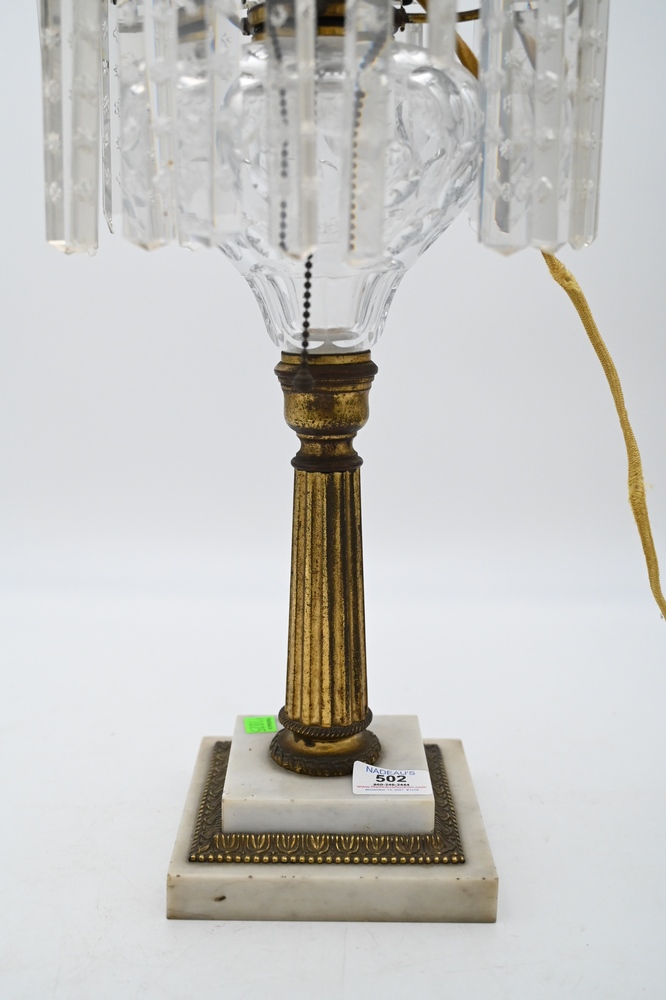Lot 502: Large Astro Lamp, having etched shade, large cut prisms, on brass column, on step up marble base, electrified, height 28 inches.