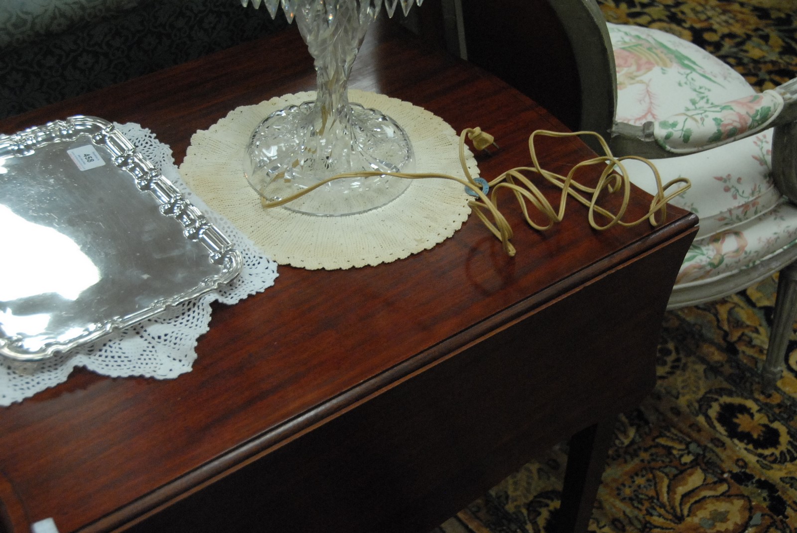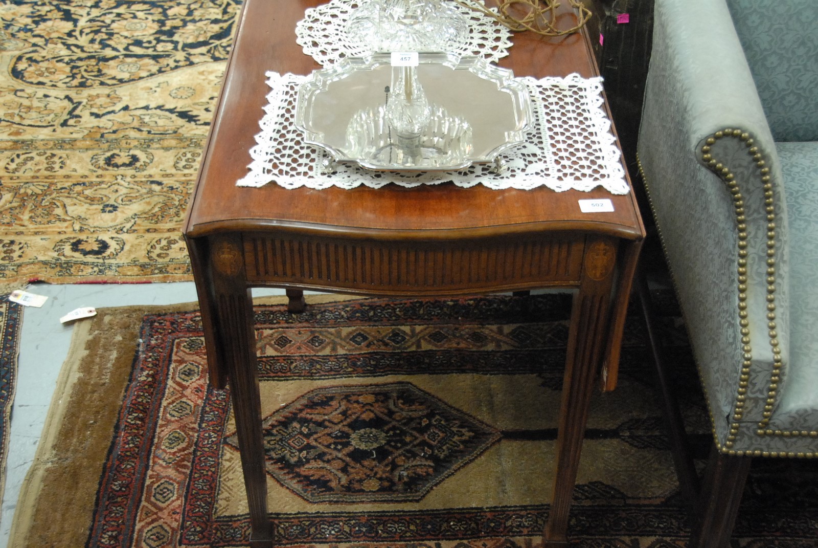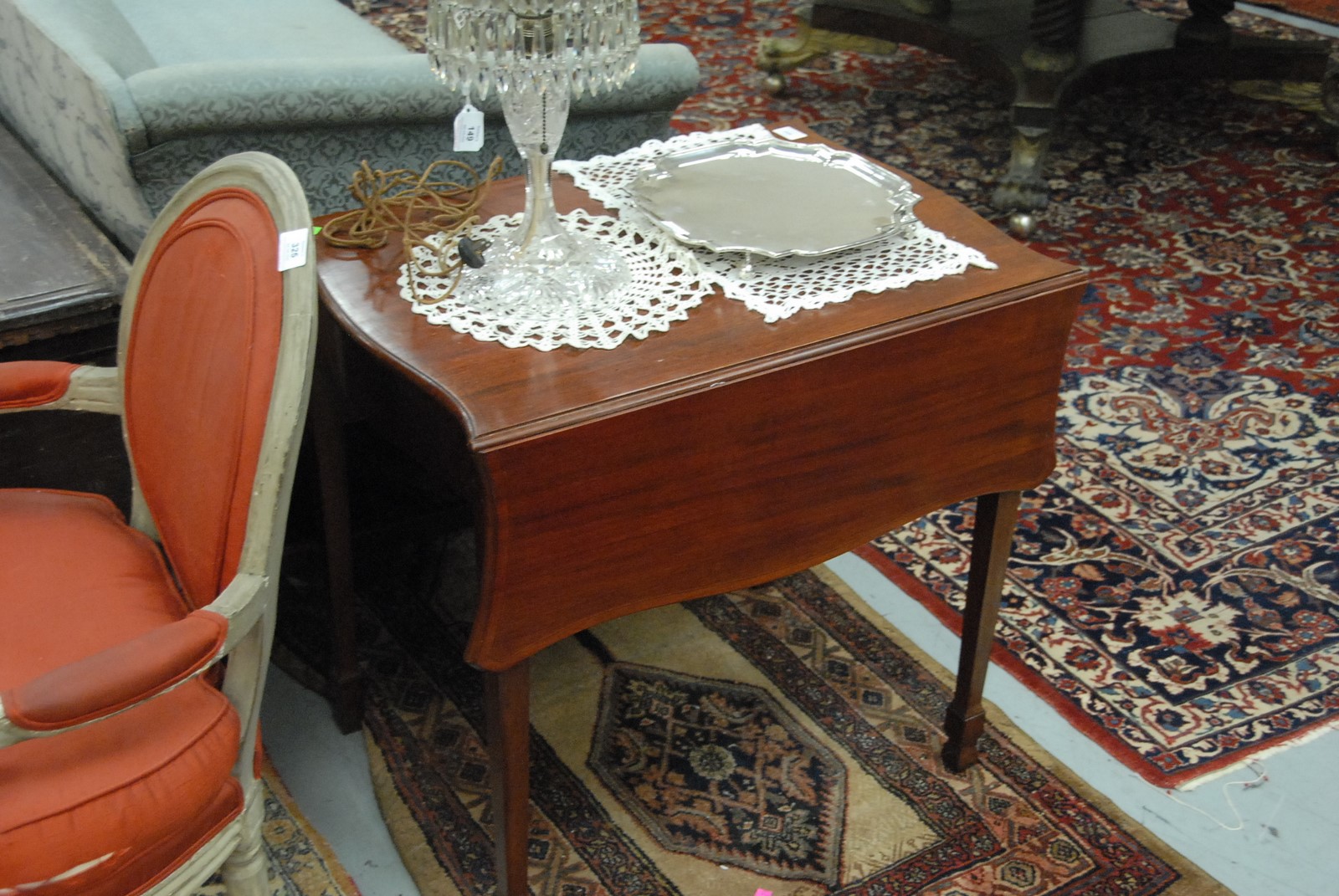Lot 502: Pair of Margolis mahogany Pembroke tables having shaped tops, drop leaves and fluted front drawer all set on square tapered and fluted legs.