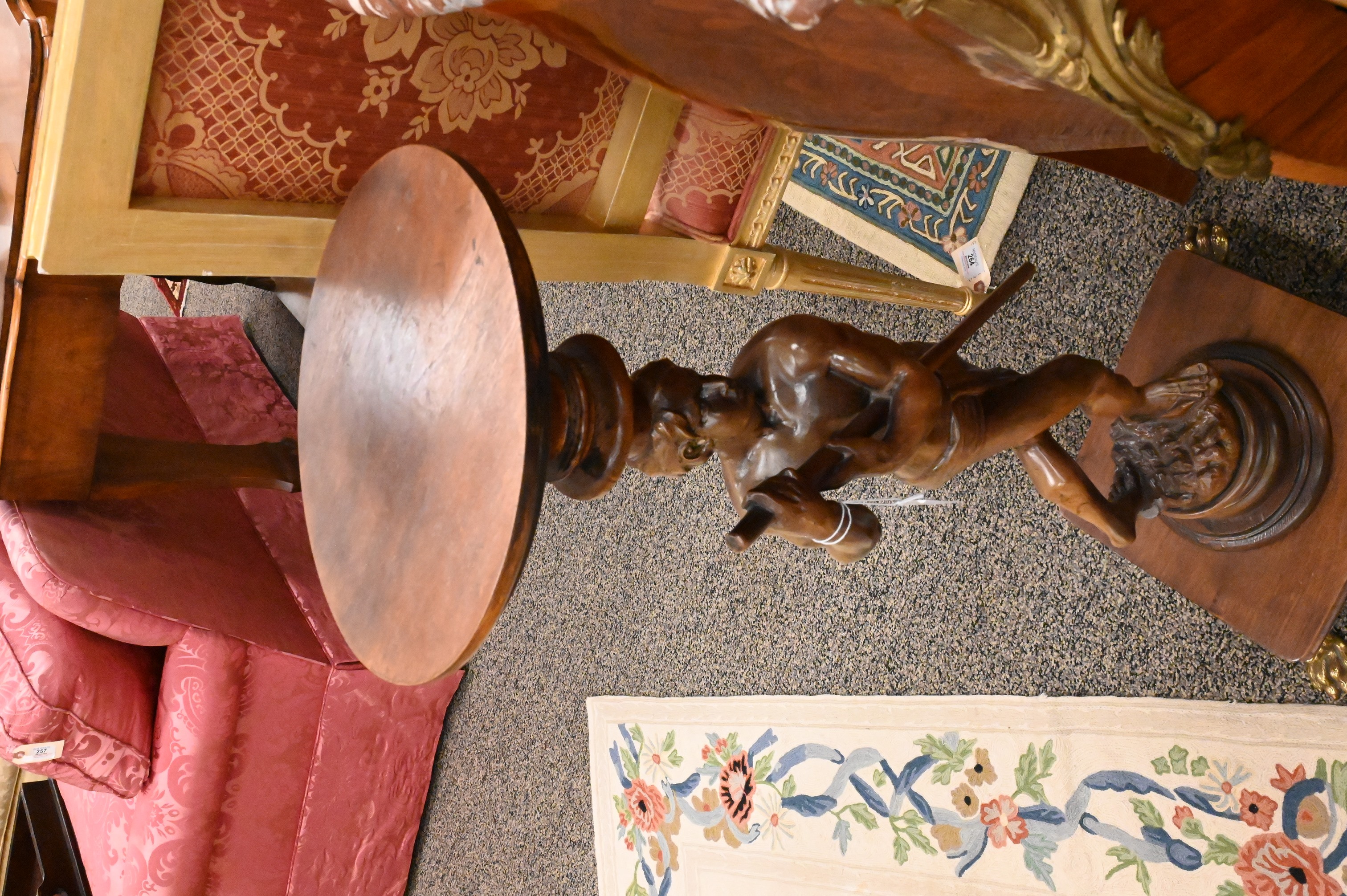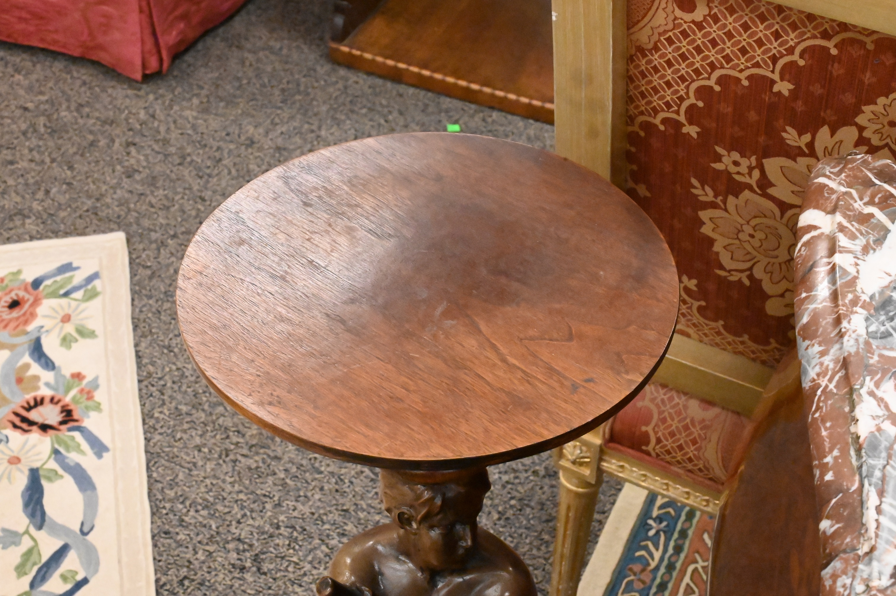 leg having female figure should be more sturdy has slight movement to figure, base having slight veneer lifting and striations, scuffs at knees, wear to top, both having slight sun fading, wear to edges, wood slightly dry