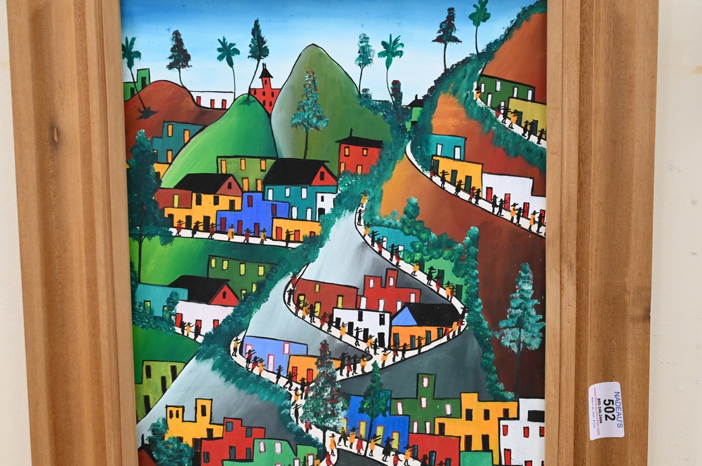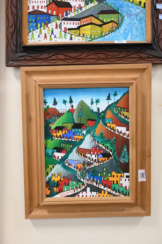 Lot 502: Préfète Duffaut (Haitian, 1923 – 2012), City View, signed and dated 22/2/76 lower left, oil on board, sight size 13 1/2″ x 10 1/2″.