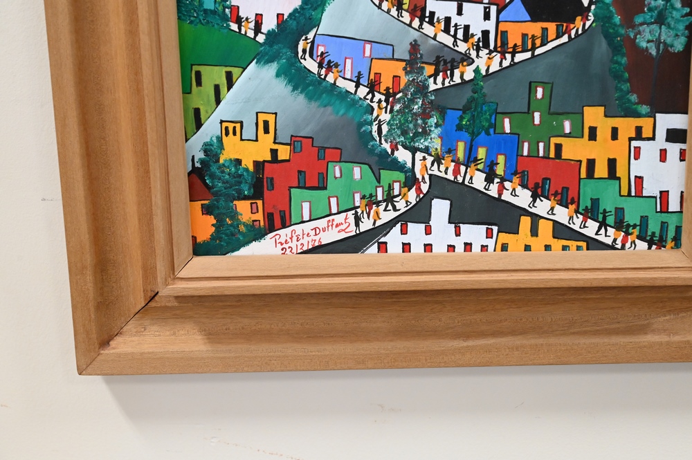 Préfète Duffaut (Haitian, 1923 – 2012), City View, signed and dated 22/2/76 lower left, oil on board, sight size 13 1/2″ x 10 1/2″.