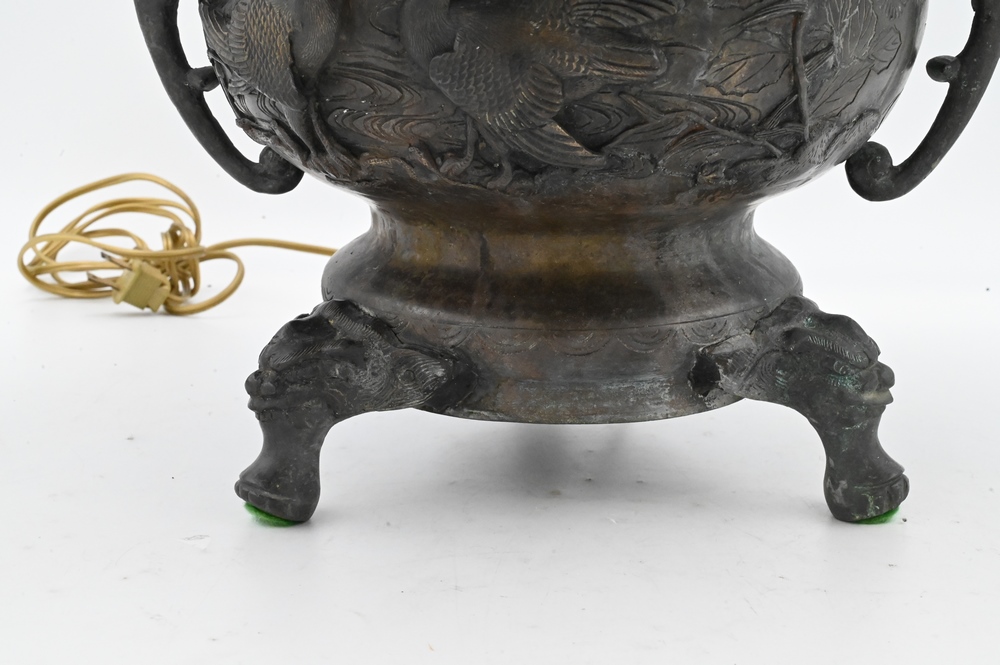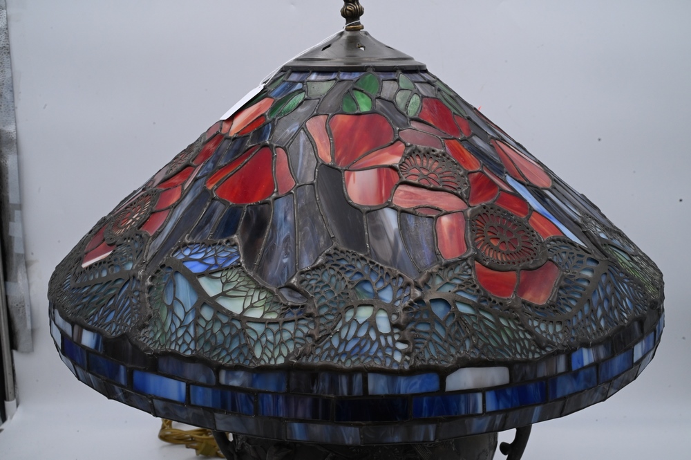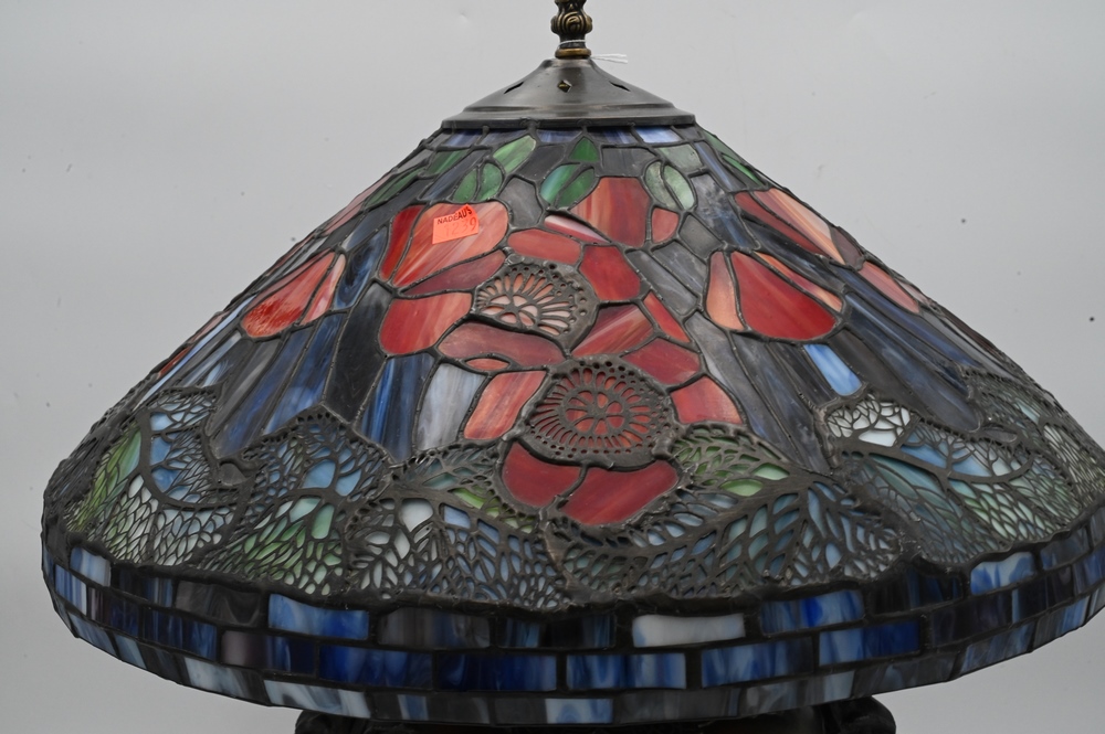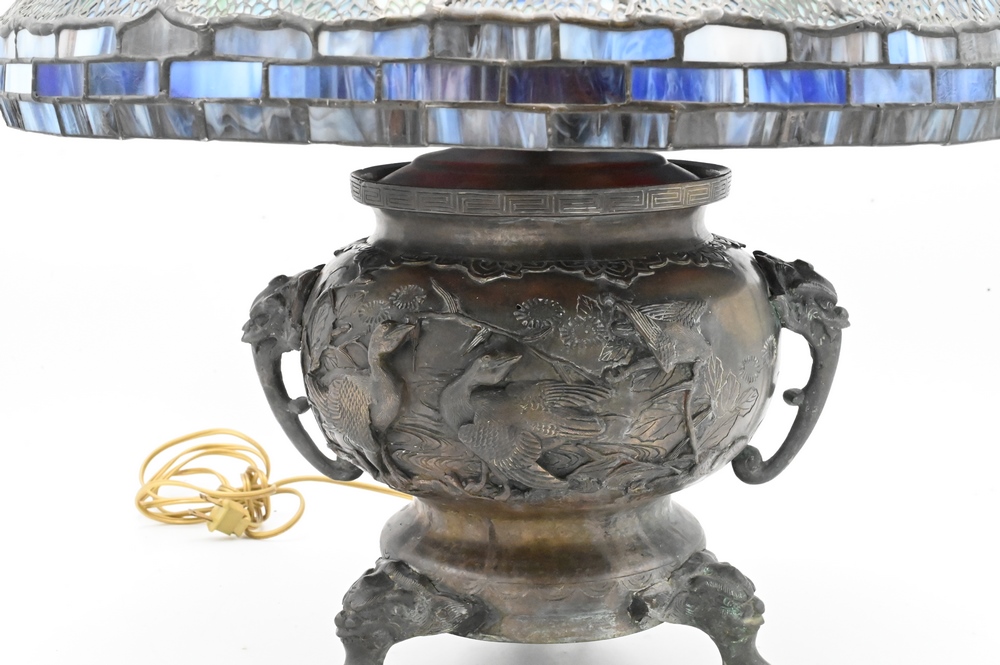 Table Lamp, having slag glass shade on Japanese bronze base, height 21 inches.