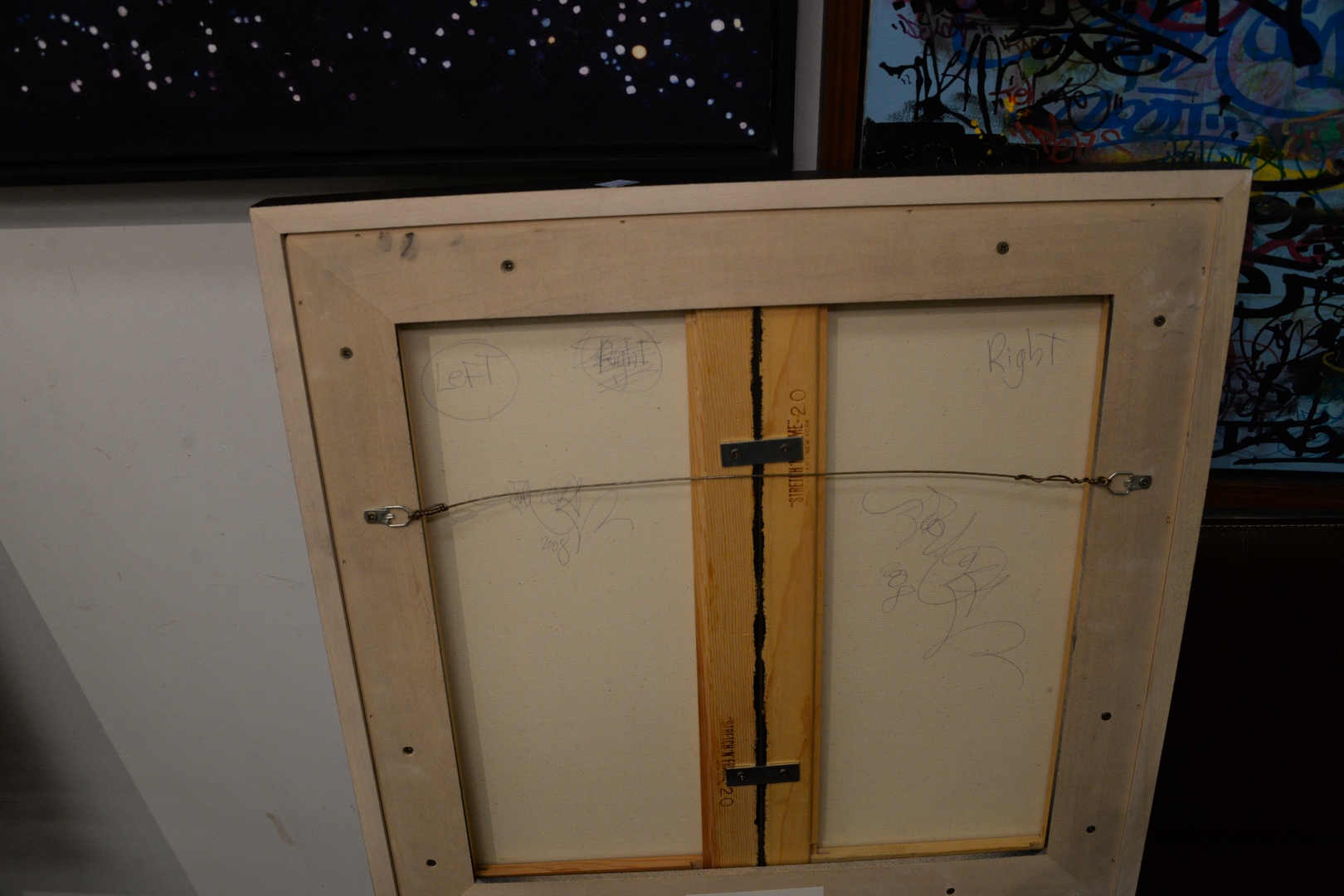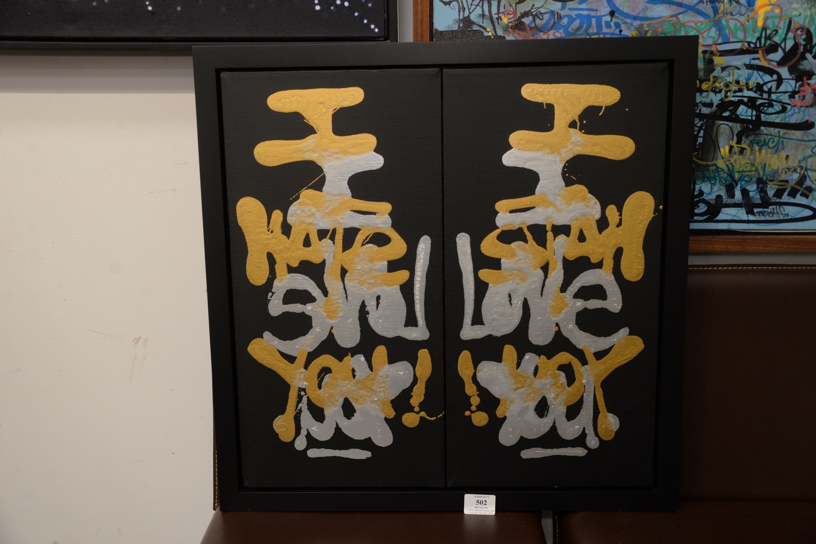 Lot 502: Tao Rey (American, b. 1978), “I Love You, I Hate You”, 2008, one-shot lettering enamel on canvas, each panel signed, dated, and inscribed on the reverse reverse, retails for $2,500, 20″ x 20″. Provenance: Purchased from The Fireplace Project, East hampton, New York, “Reunion”, July 11th – July 28, 2002.