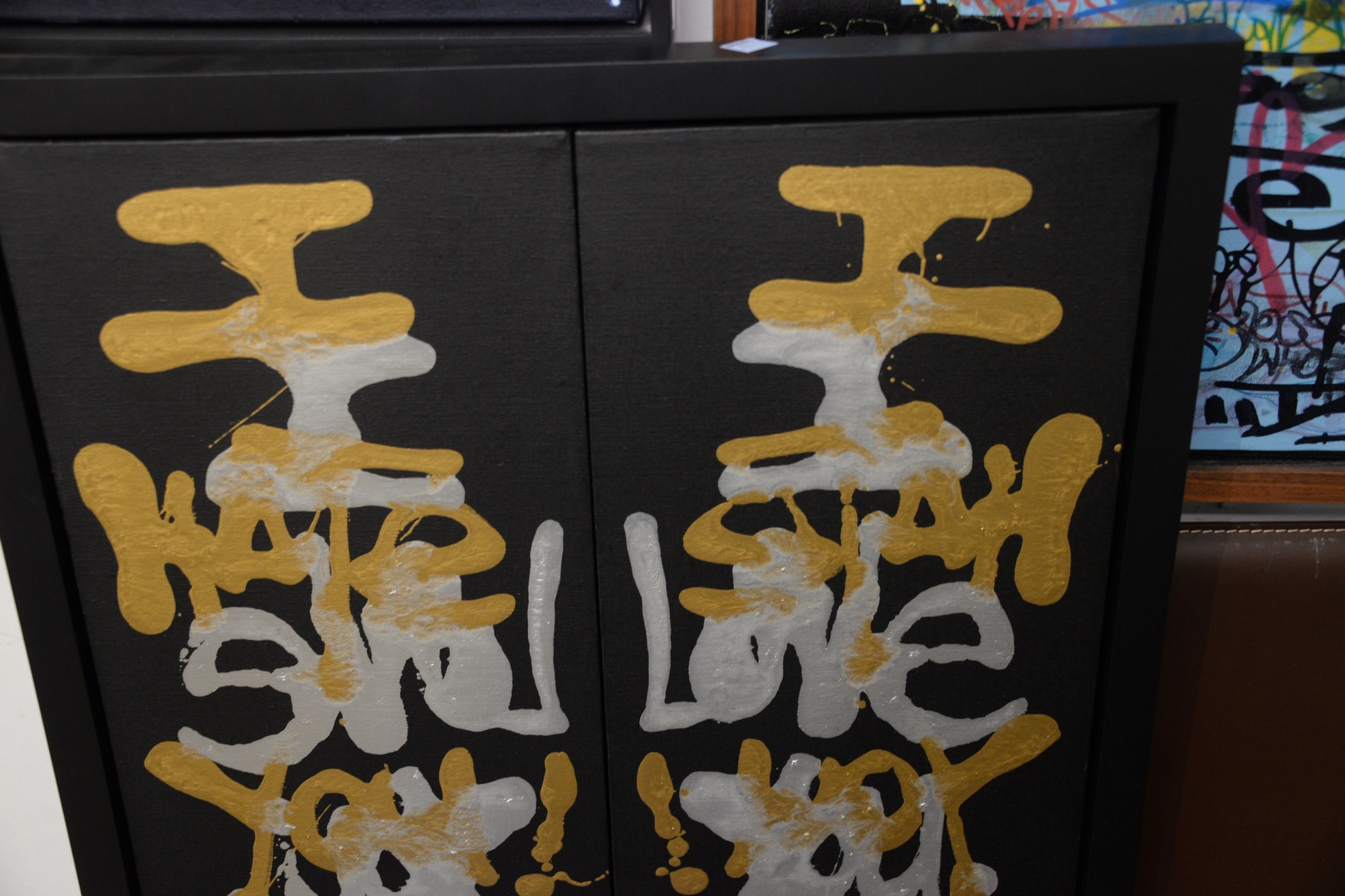 Tao Rey (American, b. 1978), “I Love You, I Hate You”, 2008, one-shot lettering enamel on canvas, each panel signed, dated, and inscribed on the reverse reverse, retails for $2,500, 20″ x 20″. Provenance: Purchased from The Fireplace Project, East hampton, New York, “Reunion”, July 11th – July 28, 2002.