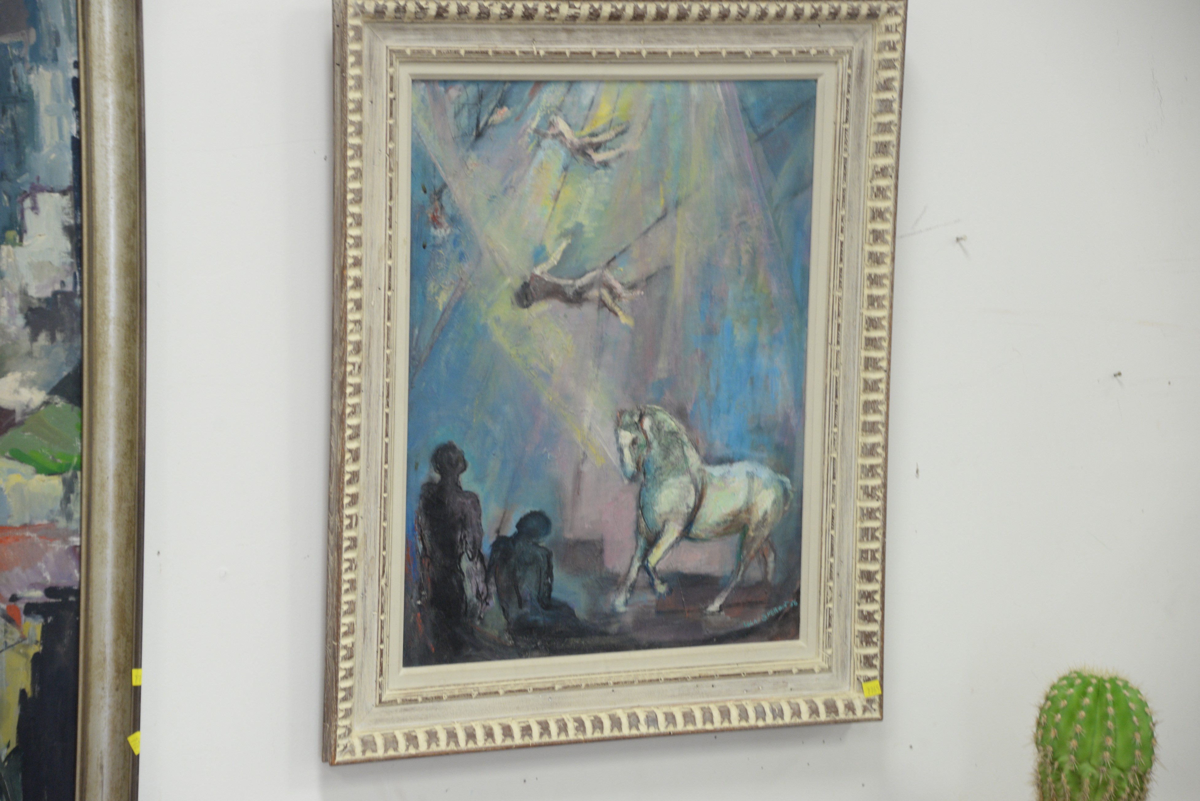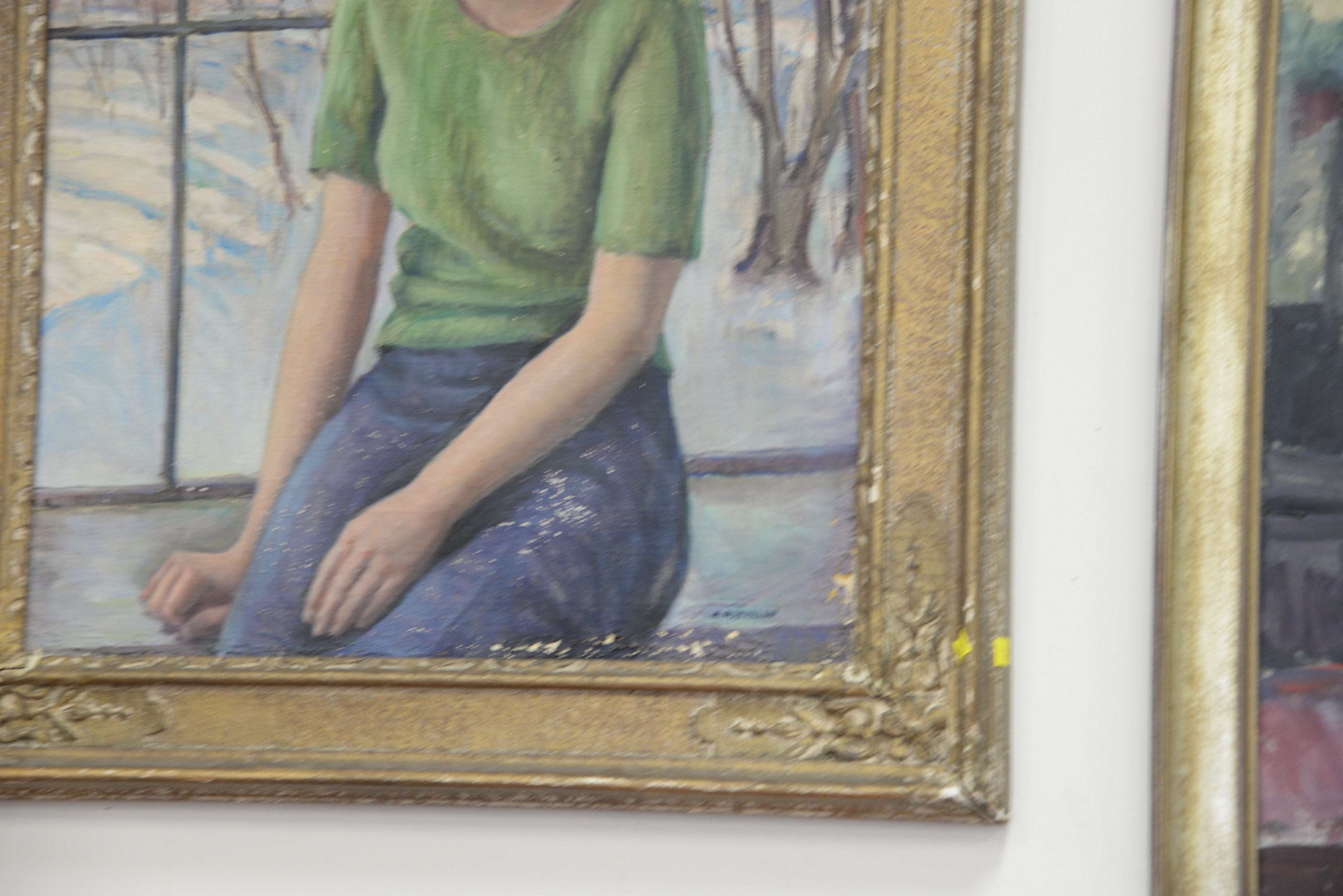 Lot 502: Three large oil on canvas painting including abstraction unsigned 36 x 25, Girl Peering out the window signed H. M. Farlow 28…