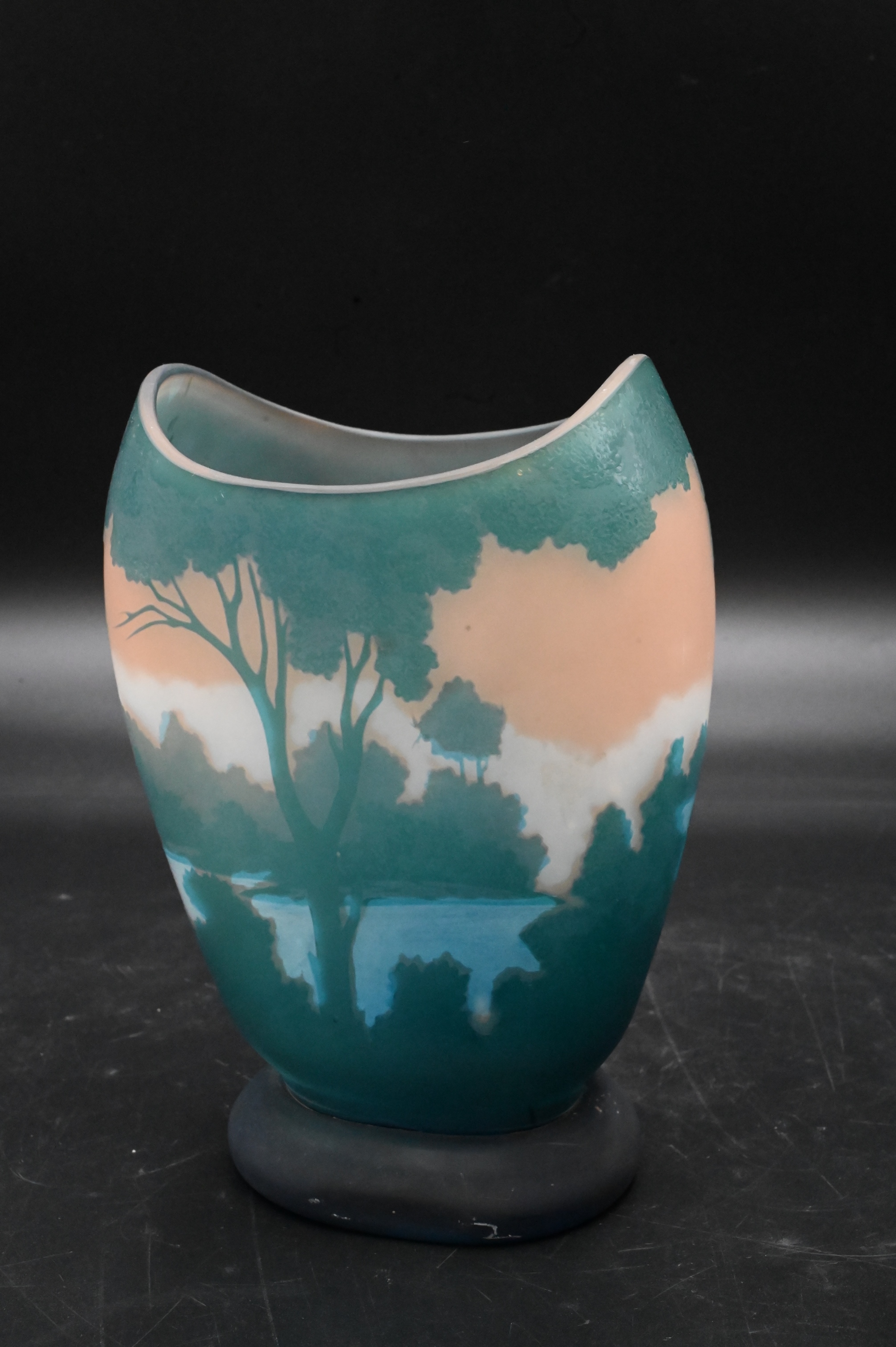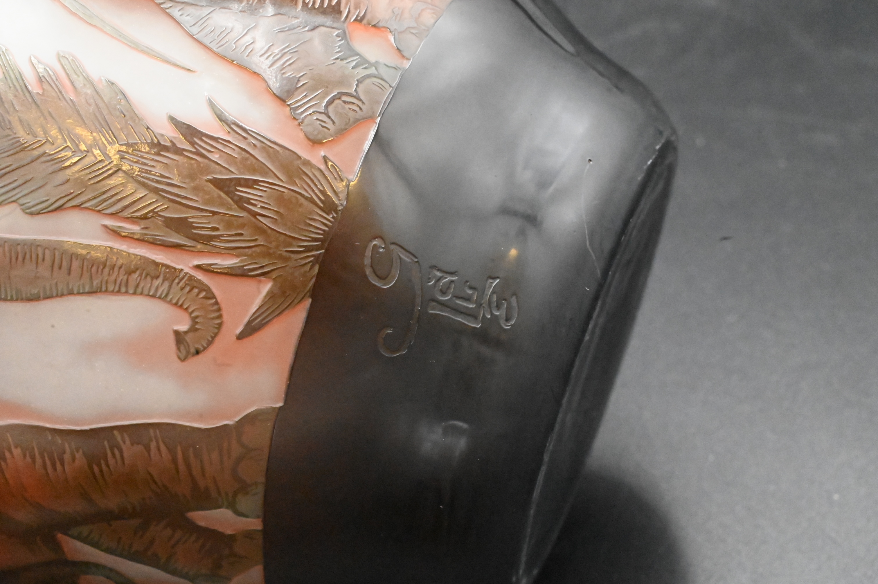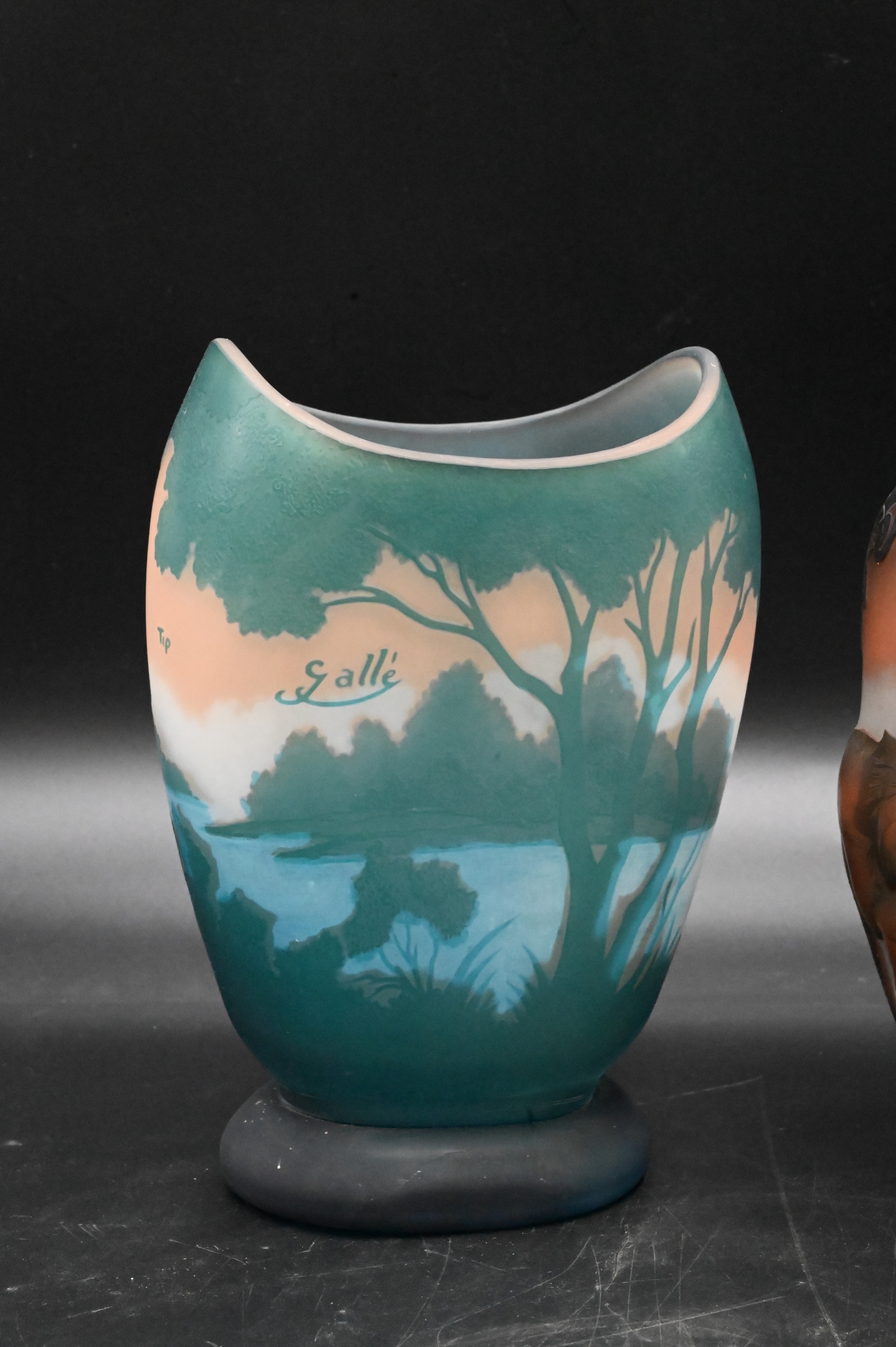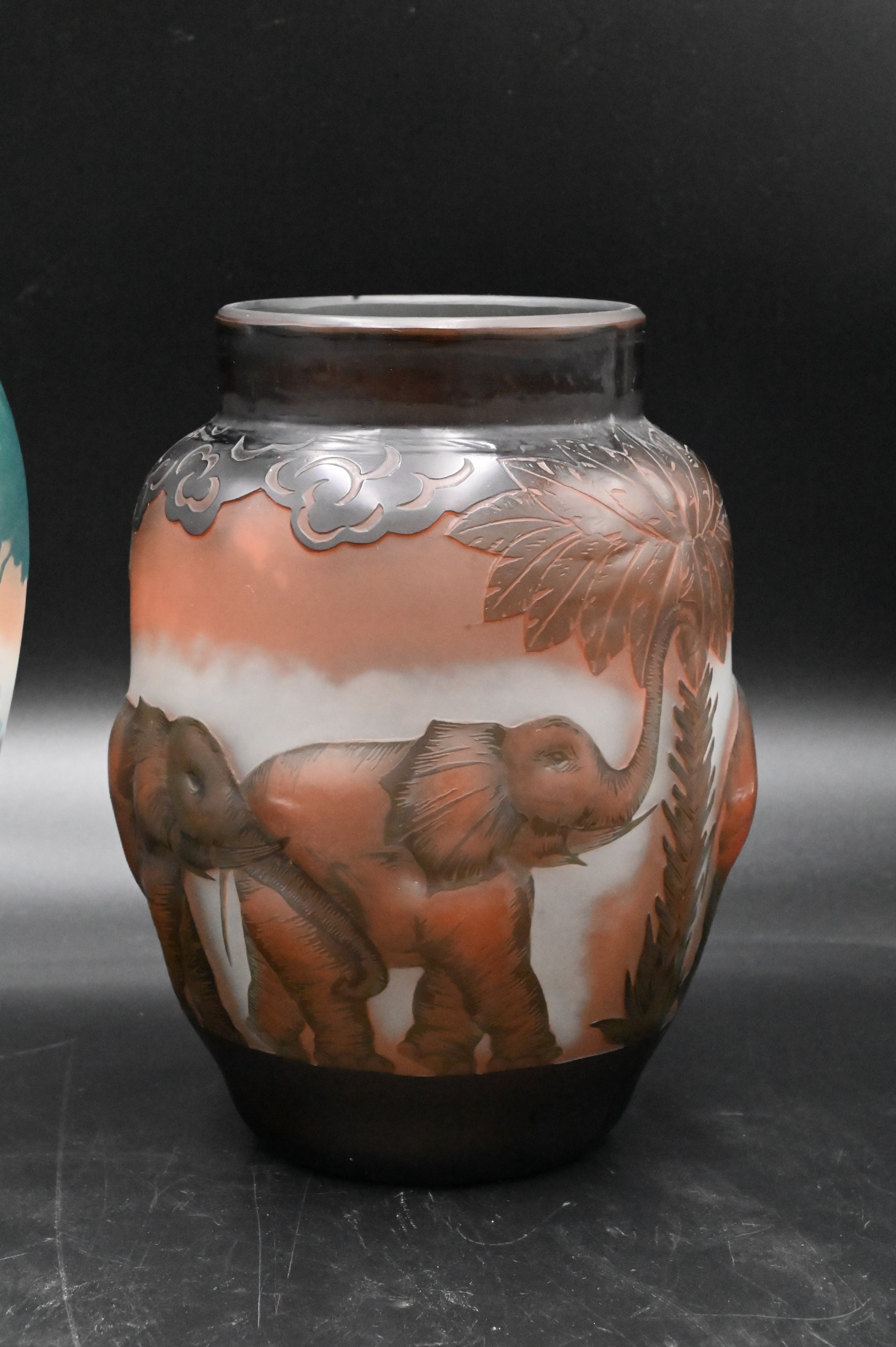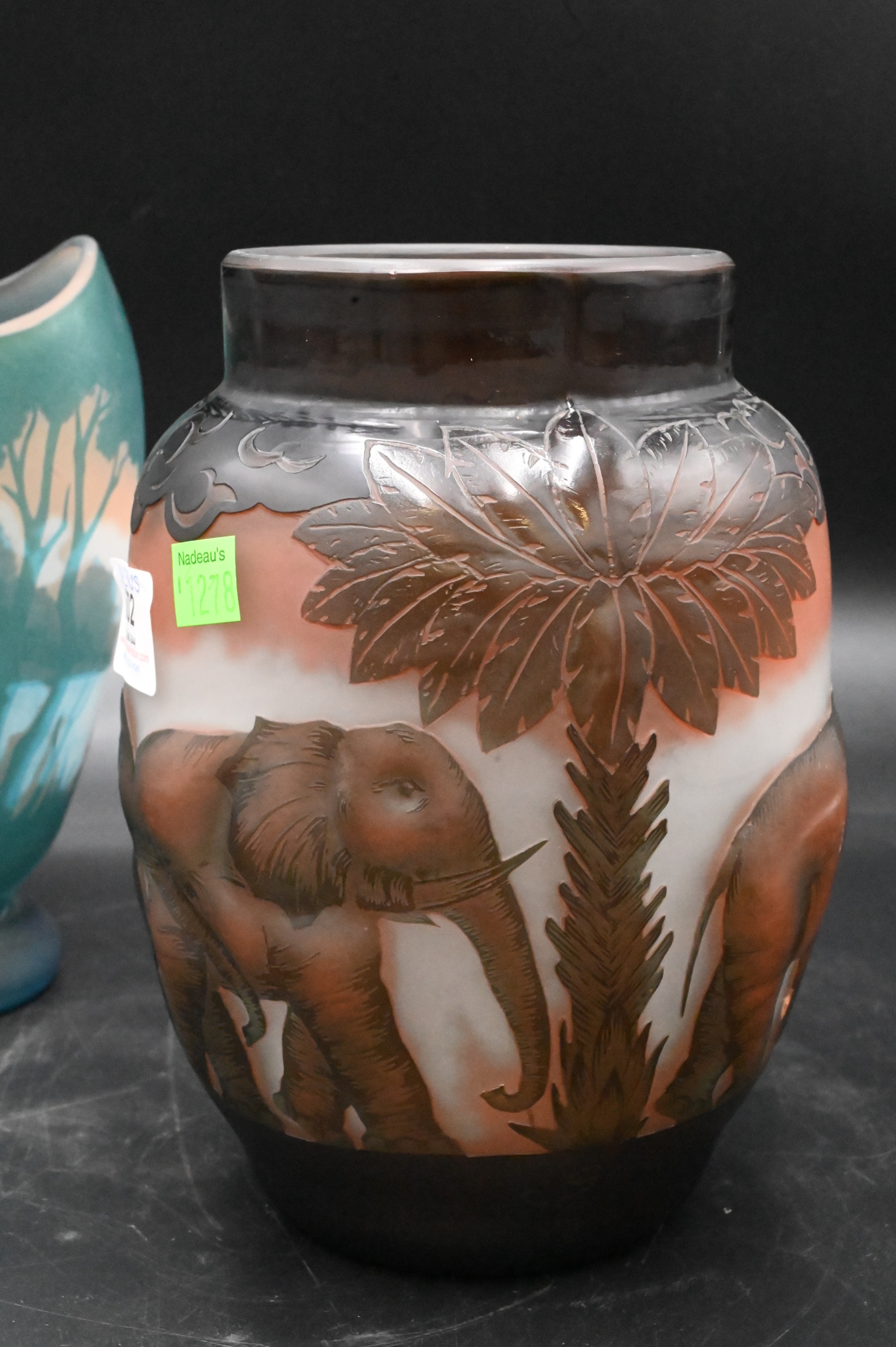 Two Galle Style Cameo Glass Vases, to include one having etched elephants and tropical tree motif, marked Galle on side of feet, height 8 1/4 inches, along with vase having pond landscape motif, height 8 1/2 inches.