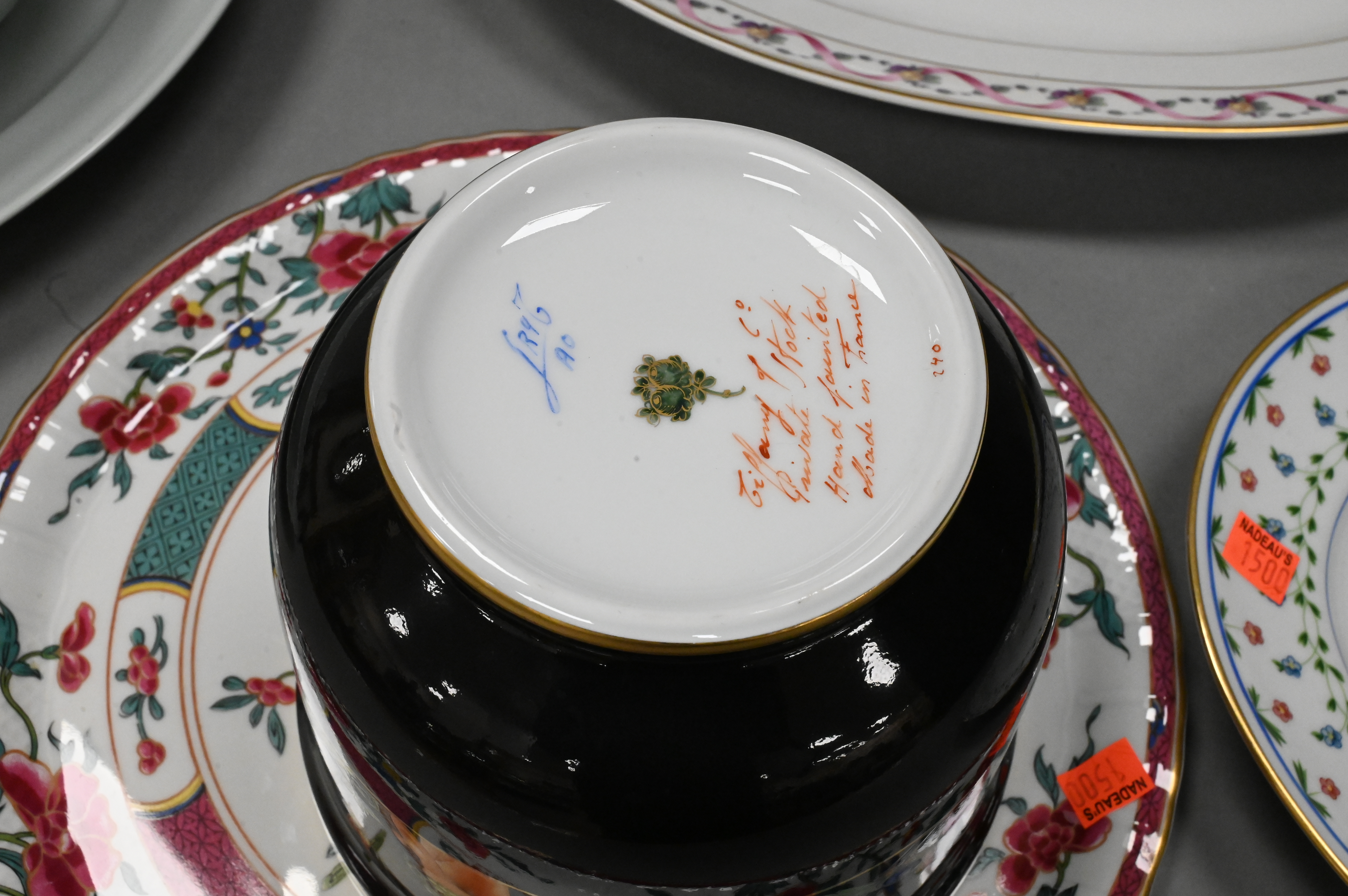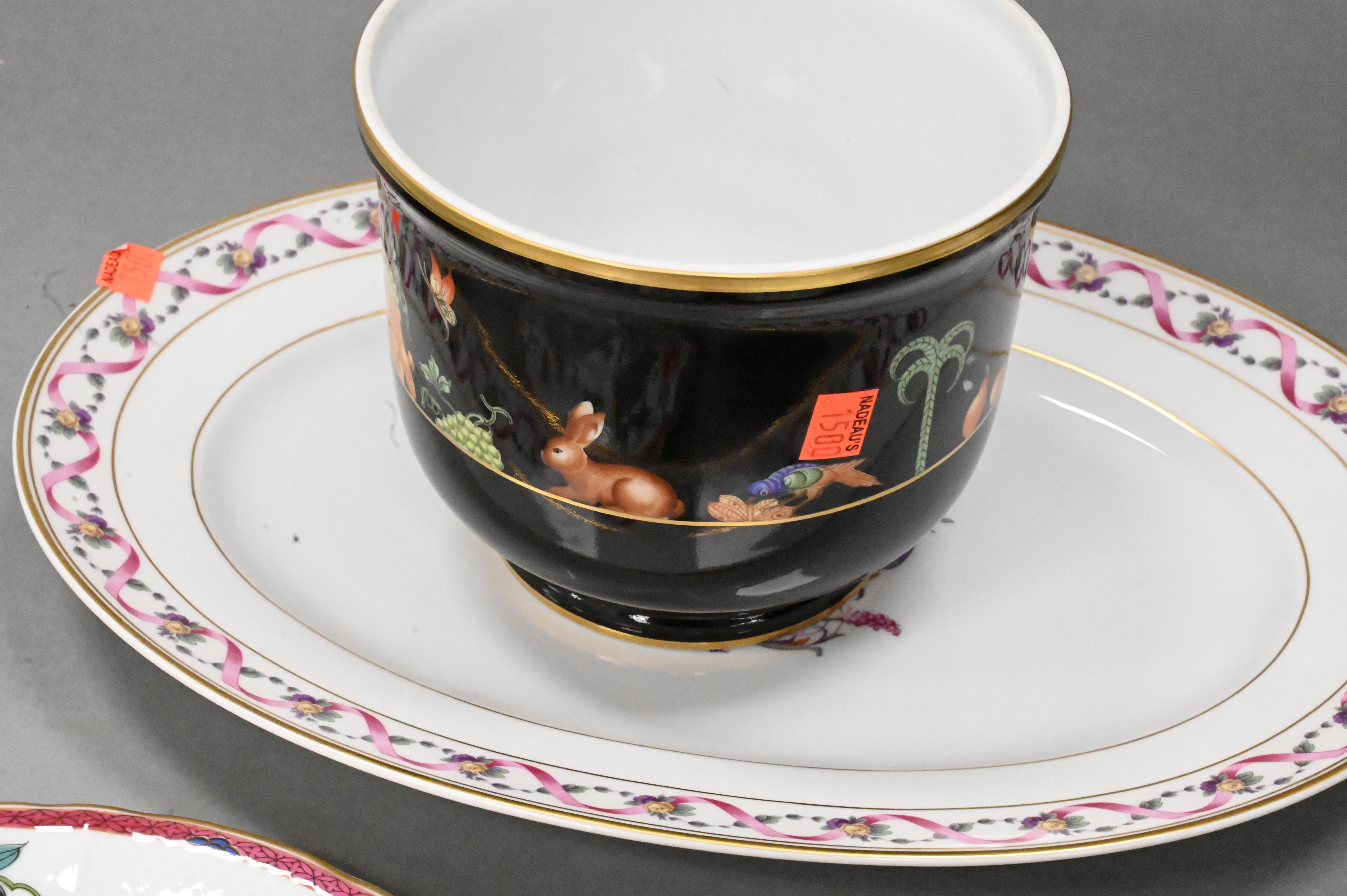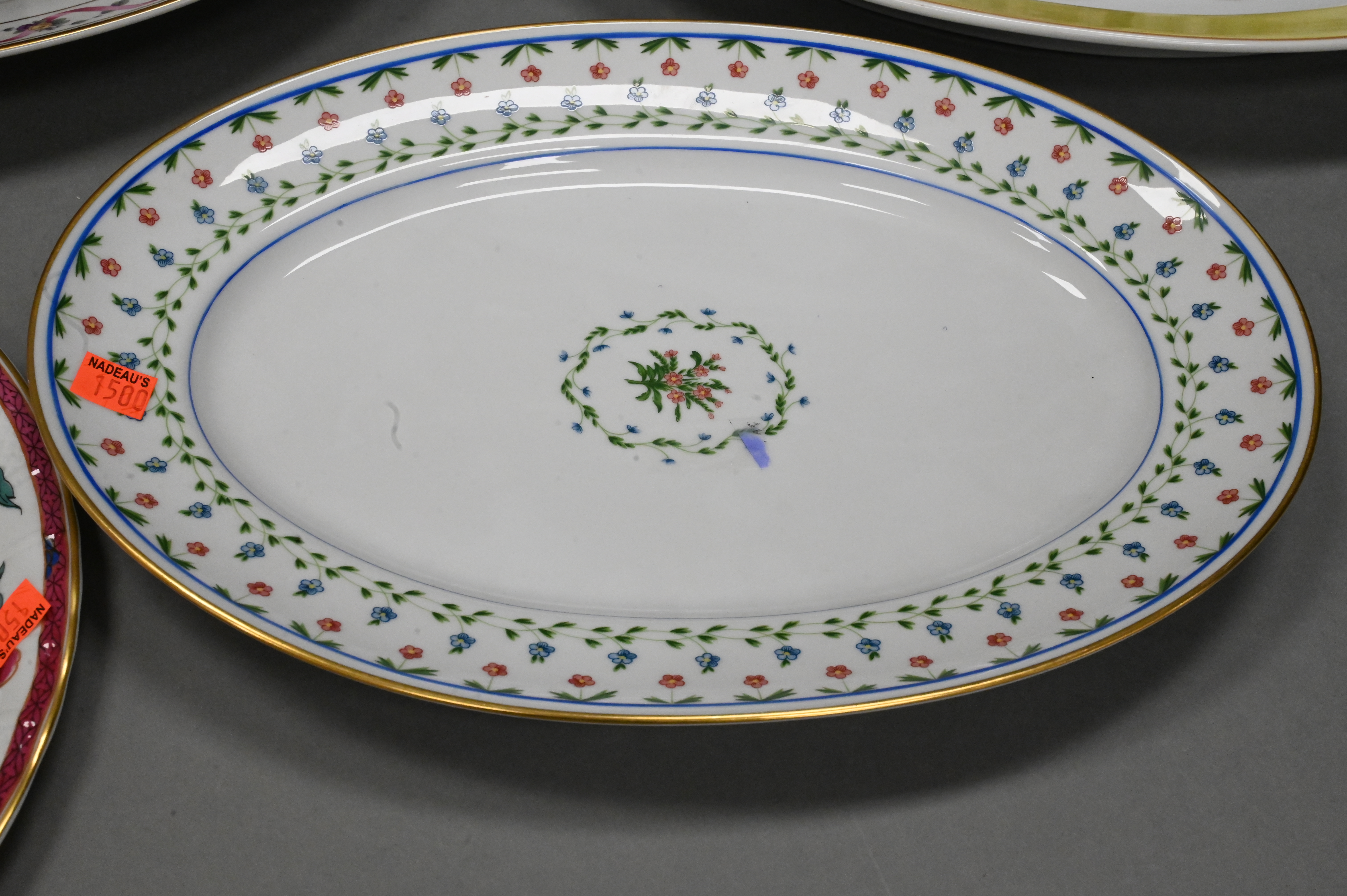 Two Tray Lots and Serving Trays, to include Tiffany & Company Le Tallec cache pot, marked “Tiffany & Company Private Stock, Hand Painted, Made in France’ on bottom; along with Chase Jungle Party Villeroy & Bach; Limoges Ceralene, Mottahedeh, along with Raynaud Limoges celadon trays, longest 17 inches.