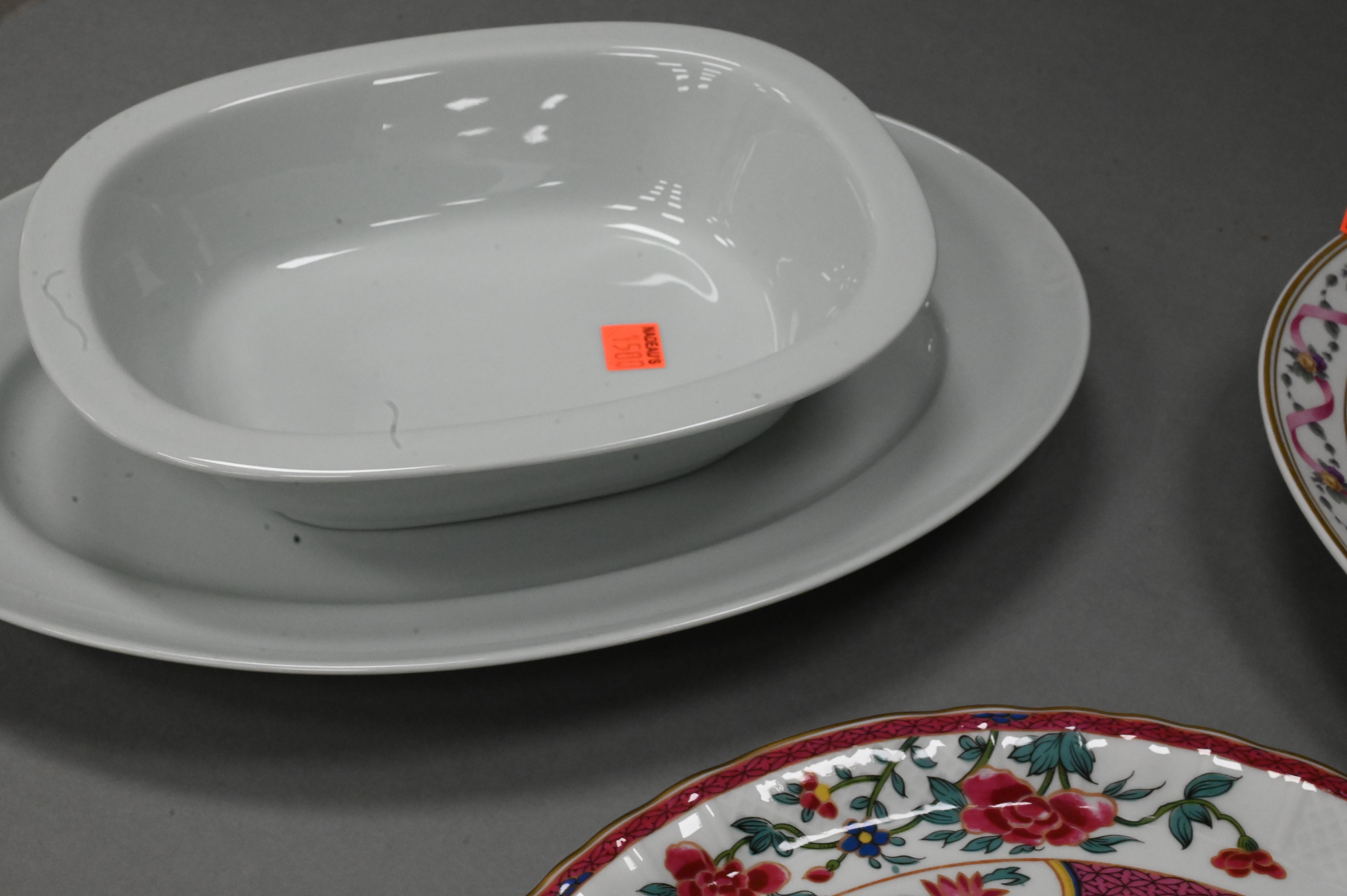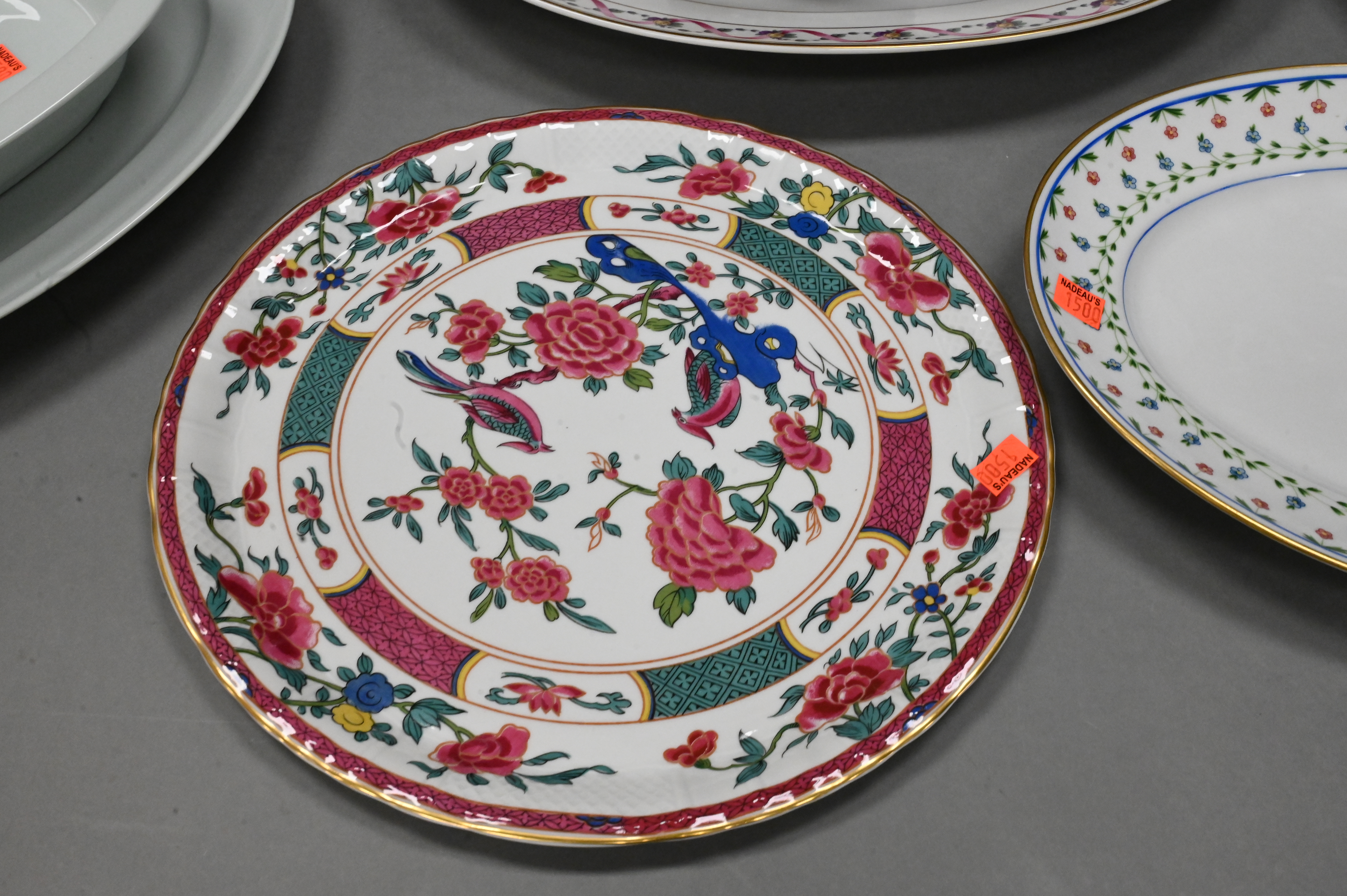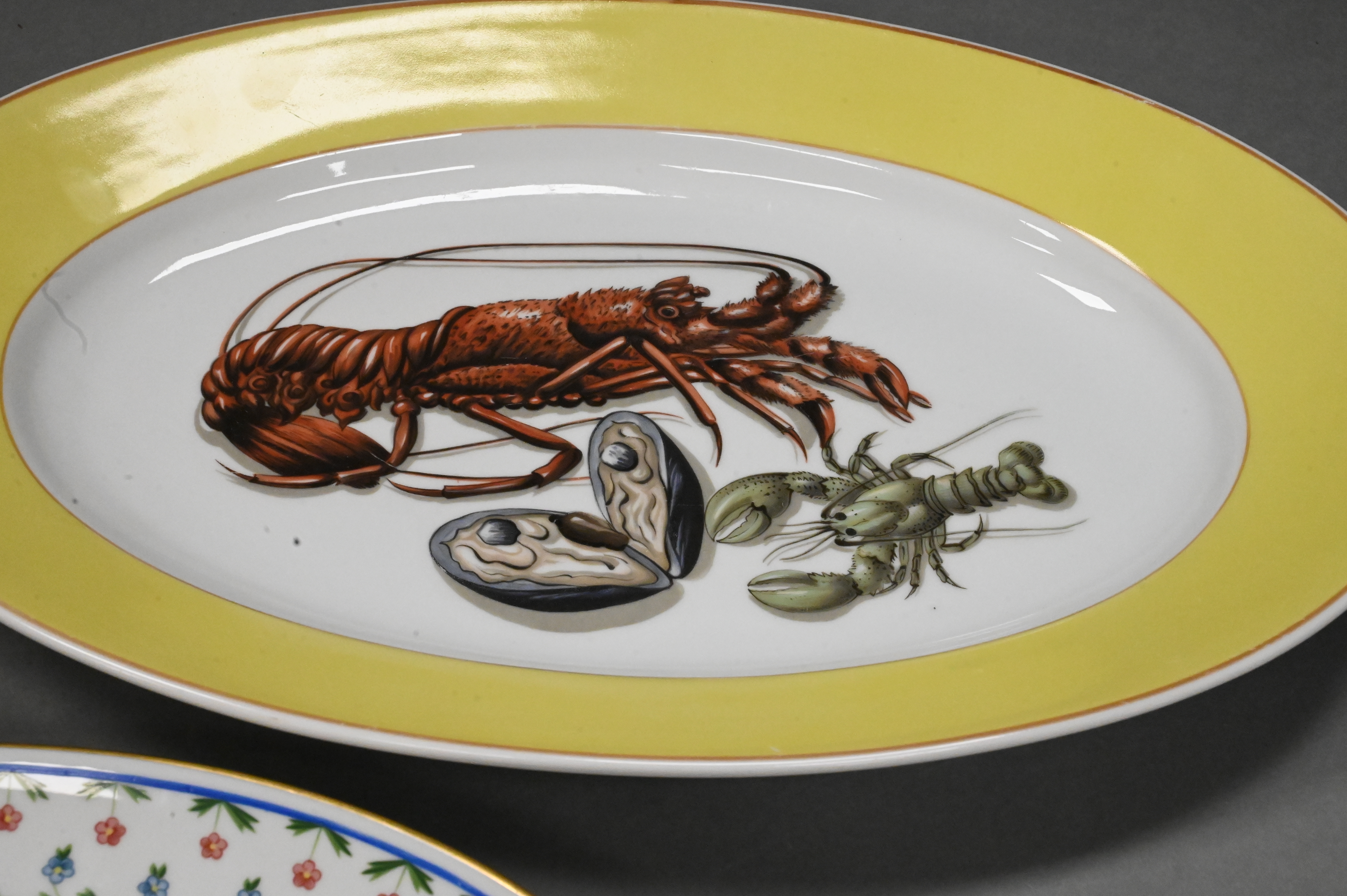 Two Tray Lots and Serving Trays, to include Tiffany & Company Le Tallec cache pot, marked “Tiffany & Company Private Stock, Hand Painted, Made in France’ on bottom; along with Chase Jungle Party Villeroy & Bach; Limoges Ceralene, Mottahedeh, along with Raynaud Limoges celadon trays, longest 17 inches.