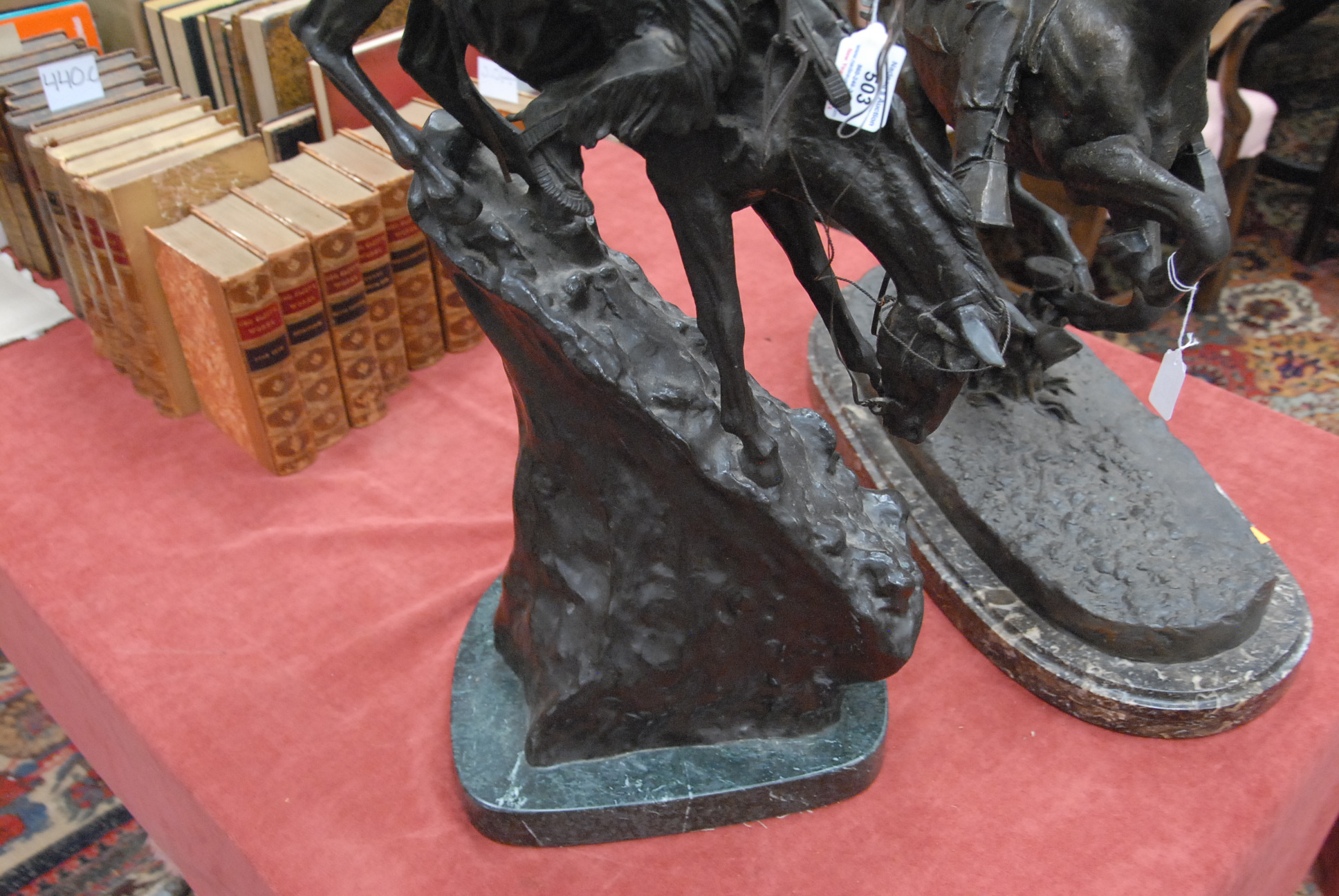 Lot 503: After Remington bronze sculpture of mountain man on horseback with marble base, signed copyright, Frederick Remington, probably mid to late 20th century. ht. 29in.