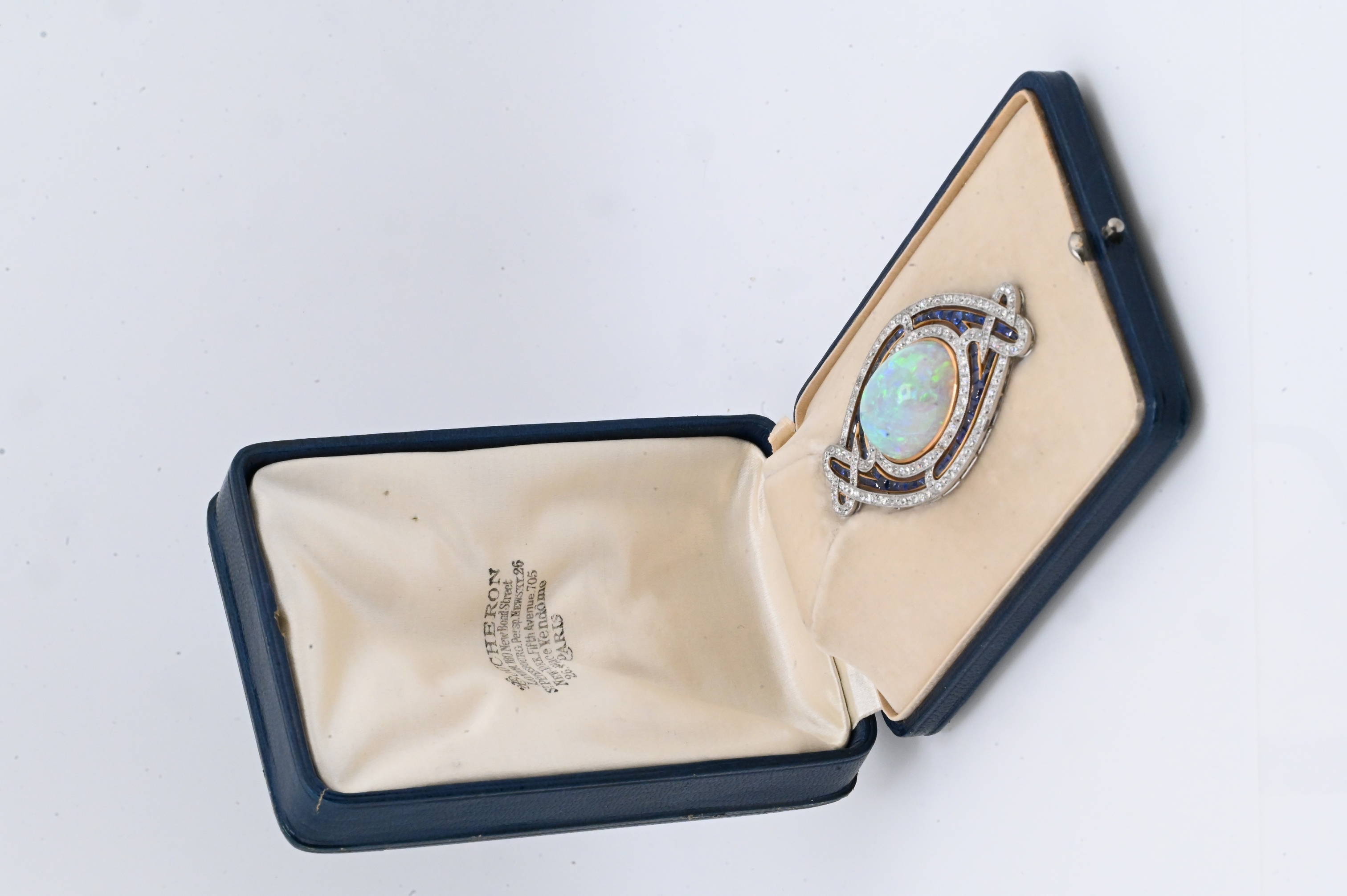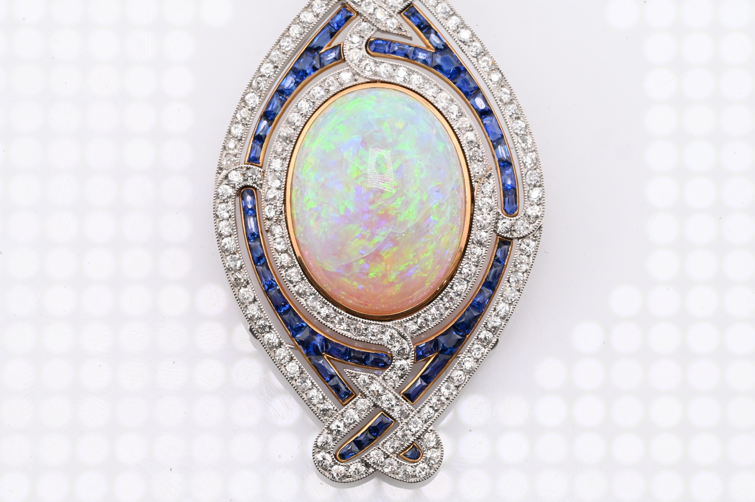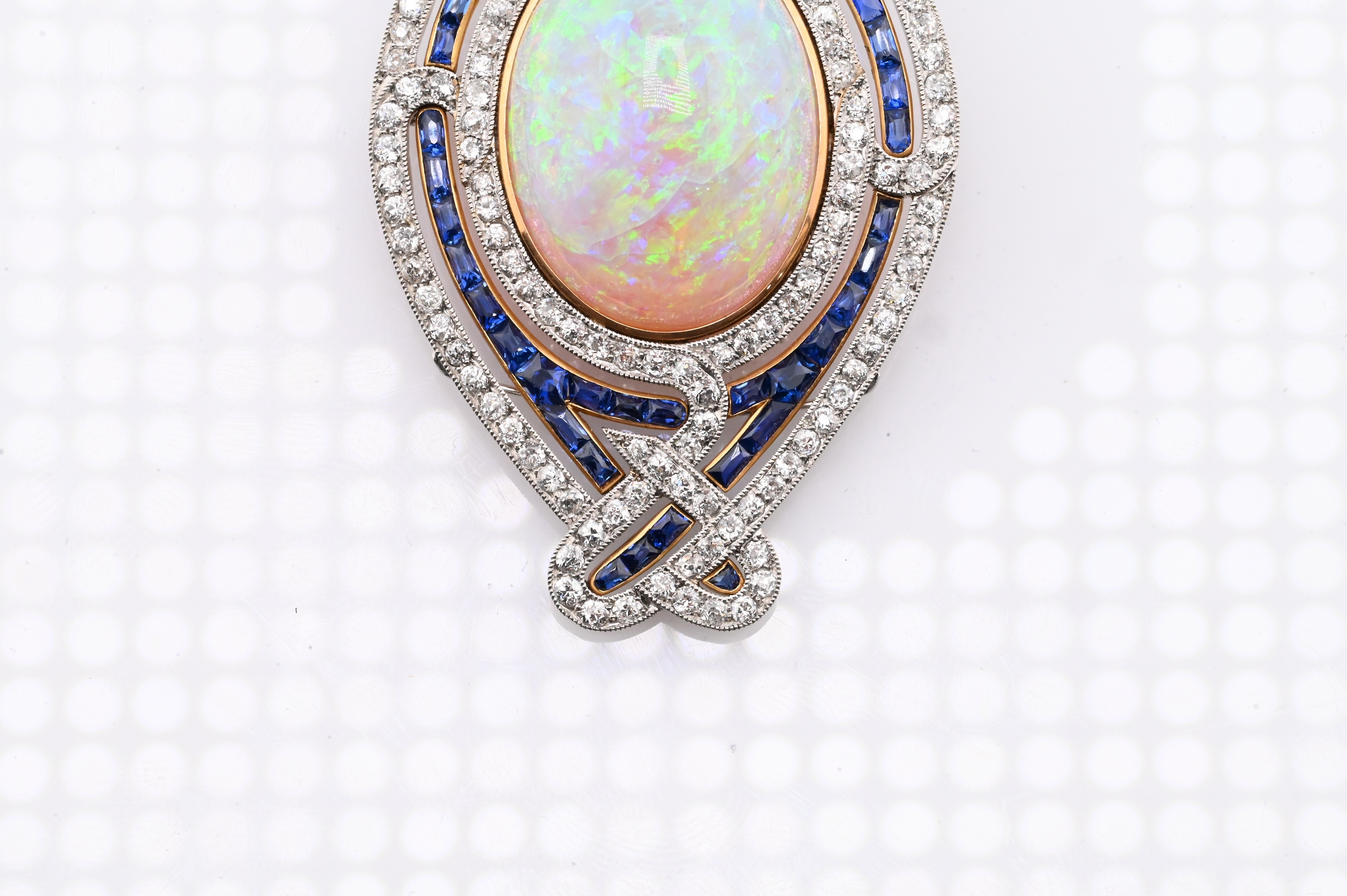 sapphire, and diamond brooch, finely crafted in 18K yellow gold and platinum, centering an oval cabochon white opal measuring approximately 25.8 x 19 x 13.6 mm, exhibiting vibrant play-of-color with visible fissures, surrounded by 159 old-cut diamonds (approx. 4.80 carats, H–SI1) and 47 calibre-cut sapphires (approx. 2.80 carats) signed Boucheron Paris, with French hallmarks and safety clasp